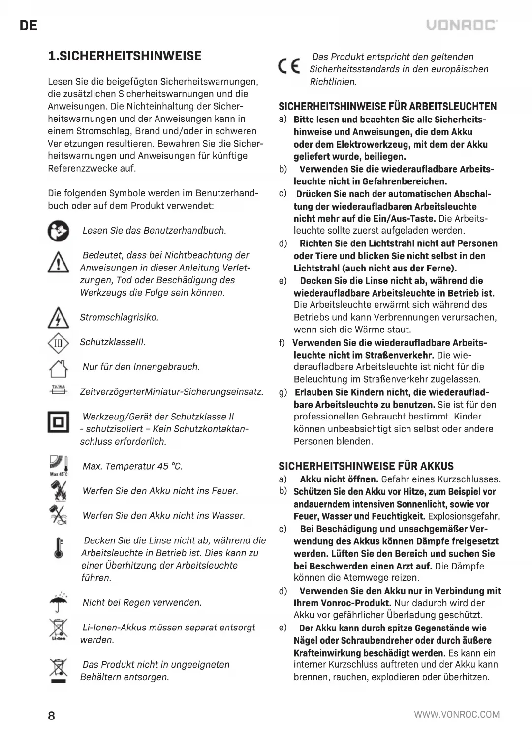 Schützen Sie den Akku vor Hitze, zum Beispiel vor andauerndem intensiven Sonnenlicht, sowie vor Feuer, Wasser und Feuchtigkeit. Explosionsgefahr. c) Bei Beschädigung und unsachgemäßer Ver- wendung des Akkus können Dämpfe freigesetzt werden. Lüften Sie den Bereich und suchen Sie bei Beschwerden einen Arzt auf. Die Dämpfe können die Atemwege reizen. d) Verwenden Sie den Akku nur in Verbindung mit Ihrem Vonroc-Produkt. Nur dadurch wird der Akku vor gefährlicher Überladung geschützt.