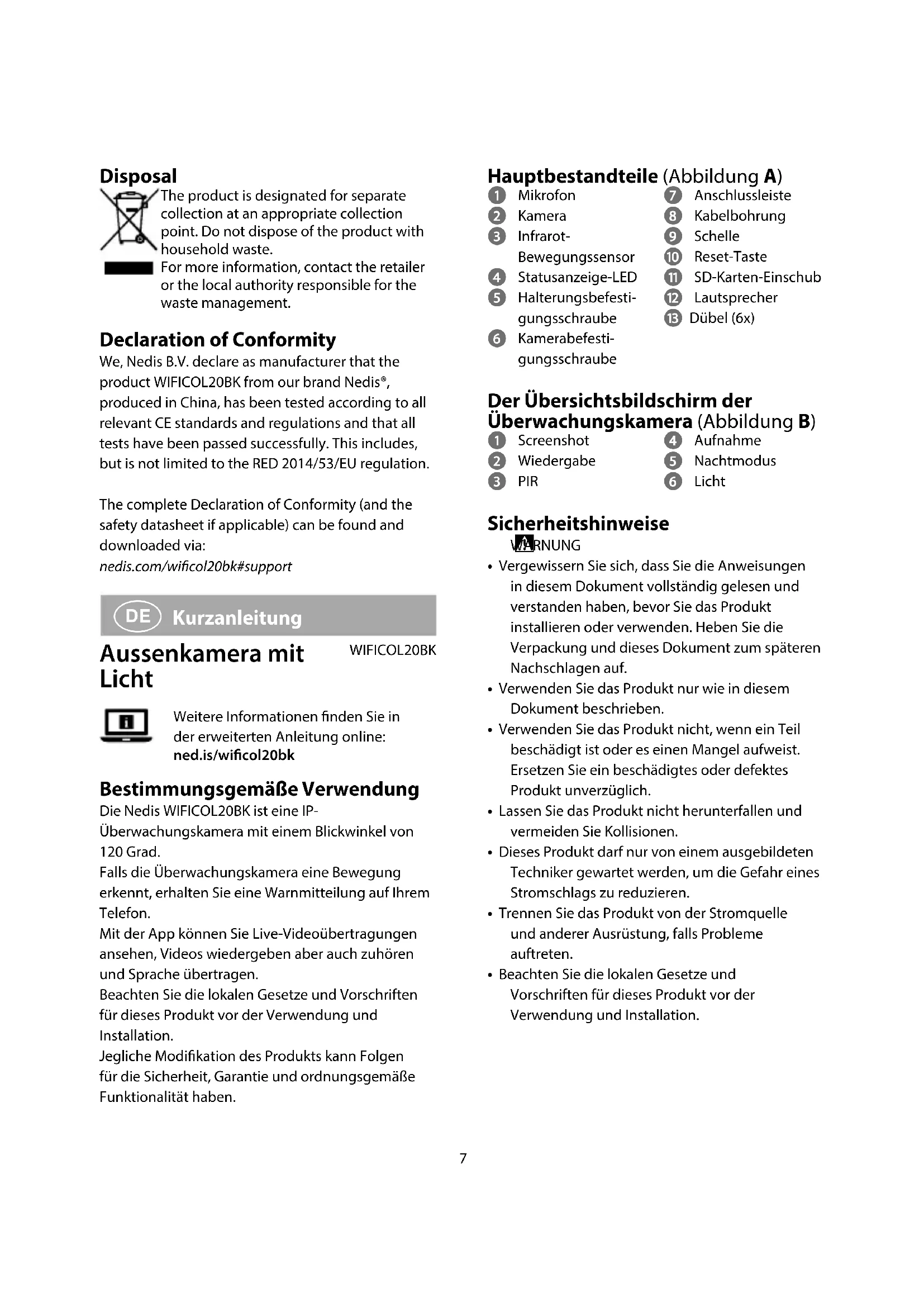 Kurzanleitung Aussenkamera mit Licht WIFICOL20BKWeitere Informationen nden Sie in der erweiterten Anleitung online: ned.is/wicol20bk Bestimmungsgemäße Verwendung Die Nedis WIFICOL20BK ist eine IP-Überwachungskamera mit einem Blickwinkel von 120 Grad.Falls die Überwachungskamera eine Bewegung erkennt, erhalten Sie eine Warnmitteilung auf Ihrem Telefon.Mit der App können Sie Live-Videoübertragungen ansehen, Videos wiedergeben aber auch zuhören und Sprache übertragen.Beachten Sie die lokalen Gesetze und Vorschriften für dieses Produkt vor der Verwendung und Installation.Jegliche Modikation des Produkts kann Folgen für die Sicherheit, Garantie und ordnungsgemäße Funktionalität haben.8
