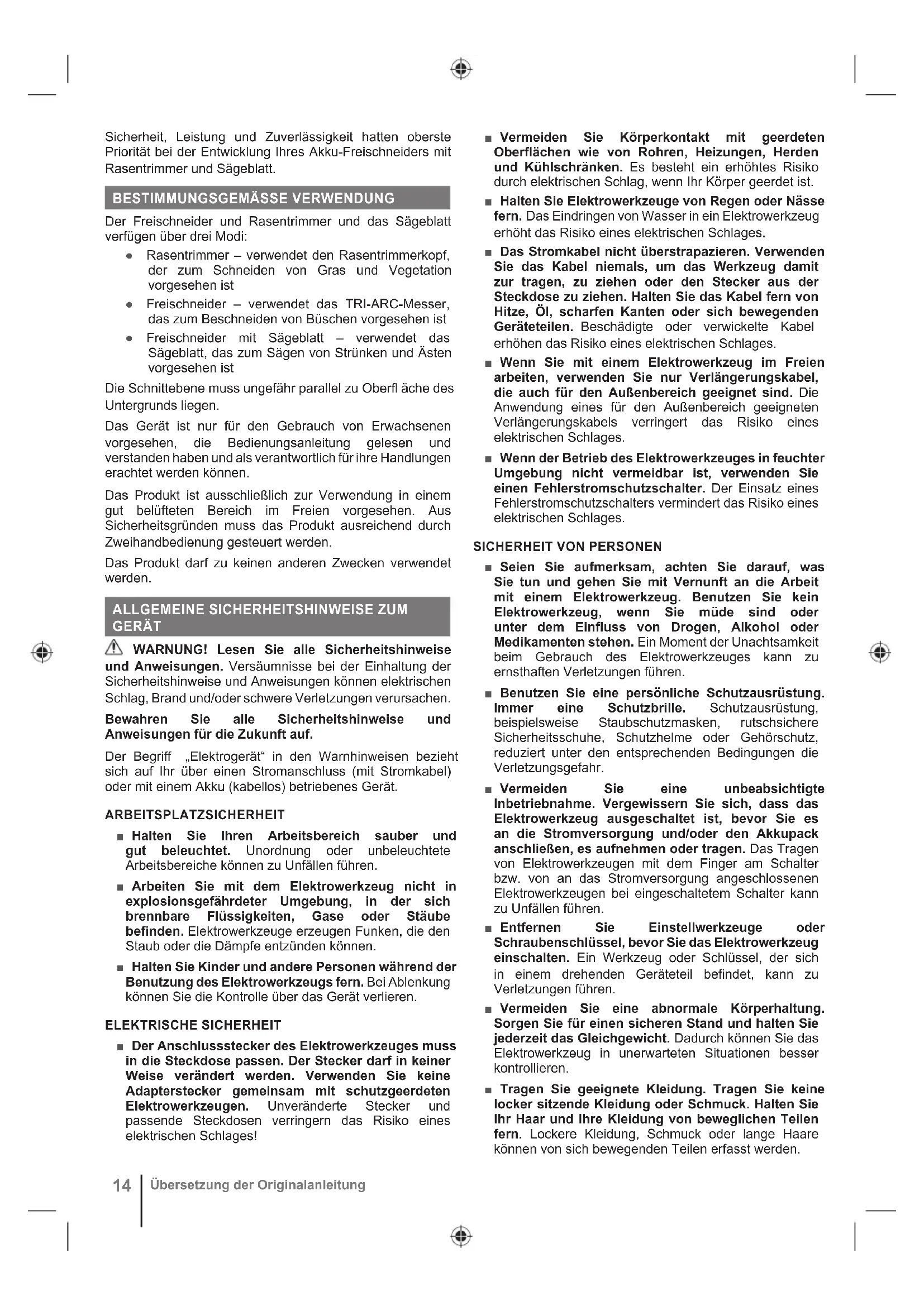 ■ Überprüfen Sie vor jeder Benutzung und nach jedem Schlag, dass keine Teile beschädigt sind. Ein defekter Schalter oder ein anderes Teil, das beschädigt oder abgenutzt ist, muss durch den autorisierten Kundendienst ordnungsgemäß repariert oder ausgetauscht werden. ■ Die am Messerschutz angebrachte kleine Klinge soll die neue verlängerte Schnur auf die richtige Länge für eine sichere und optimale Leistung schneiden. Das Messer ist sehr scharf. Berühren Sie das Messer, vor allem beim Reinigen des Geräts, nicht. ■ Verwenden Sie nur den Ersatz-Schneidfaden des Herstellers. Benutzen Sie keinen anderen Schneidaufsatz. ■ Stellen Sie sicher, dass der Schneidaufsatz ordnungsgemäß montiert und befestigt ist. ■ Bedienen Sie das Produkt niemals ohne dass alle Schutzvorrichtungen, Abweiser und Griffe ordnungsgemäß und sicher befestigt sind. ■ Vergewissern Sie sich vor jedem Einsatz, dass die Schneidklinge zu Schneiden des Rasens in der Schutzvorrichtung richtig positioniert und gesichert ist. ■ Halten Sie das Bürstenteil unterhalb der Taille. ■ Schalten Sie das Gerät bei Unfällen oder Ausfällen sofort aus und entfernen Sie den Akkupack. Das Produkt darf nicht wieder in Betrieb genommen werden, bis es vollständig von einem autorisierten Kundendienst überprüft wurde. ■ Um das Verletzungsrisiko bei Kontakt mit beweglichen Teilen zu verringern, schalten Sie das Gerät immer aus, nehmen Sie den Akkusatz heraus und lassen sie beides abkühlen. Stellen Sie sicher, dass alle bewegliche Teile vollständig angehalten sind: ● bevor Sie das Produkt warten ● bevor Sie eine Blockierung entfernen ● bevor Sie das Produkt prüfen, reinigen oder daran arbeiten ● bevor Sie Zubehörteile wechseln ● nachdem ein Fremdkörper getroffen wurde ● wenn Sie das Produkt unbeaufsichtigt zurücklassen ● wenn Sie Wartungsarbeiten durchführen ● wenn die Maschine anfängt ungewöhnlich zu vibrieren ■ Stellen Sie sicher, dass alle Schutzabdeckungen und Griffe ordnungsgemäß befestigt und in gutem Zustand sind. ■ Halten Sie das Produkt an den dafür vorgesehenen Griffen und schränken Sie die Arbeitszeit und Belastung ein. ■ Achten Sie auf Objekte die durch das Schneidwerkzeug geschleudert werden können. Entfernen Sie Schutt wie kleine Steine, Kies und andere Fremdkörper aus dem Arbeitsbereich, bevor Sie mit der Arbeit beginnen. Drähte oder Schnüre können in dem Schneidwerkzeug verwickelt werden. ■ Das Produkt ist mit einem Tragegurt ausgestattet. Nutzen Sie beim Bedienen des Geräts den Gurt. Stellen Sie den Schultergurt sorgfältig ein, damit er das Gewicht der Maschine komfortabel auf Ihrer rechten Seite unterstützt. Ermitteln Sie, wie der Schnellverschluss funktioniert und üben Sie die Benutzung, bevor Sie die Maschine benutzen. Dessen richtige Benutzung kann im Notfall schwere Verletzungen verhindern. Tragen Sie niemals zusätzliche Kleidung über dem Gurt, um den Zugriff auf den Schnellöffnungs-Mechanismus nicht einzuschränken. ■ Tragen Sie weder mehrere Gürtel noch einen Schultergurt. ■ Stellen Sie immer sicher, dass die Belüftungsöffnungen frei von Ablagerungen sind. ■ Betreiben Sie das Gerät nur bei Temperaturen zwischen 0 und 40 °C. ■ Bewahren Sie das Gerät bei einer Umgebungstemperatur von 0 bis 40 °C auf. ■ Tragen Sie beim Ein- und Ausbau der Messer strapazierfähige Handschuhe, da sie scharfe Kanten haben. ■ Versuchen Sie nicht das Messer zu berühren oder anzuhalten, wenn sie sich dreht. ■ Ersetzen Sie jedes Messer das beschädigt wurde. Vergewissern Sie sich vor jedem Gebrauch, dass das Schneidblatt richtig eingebaut ist und fest sitzt. ■ Nutzen Sie ausschließlich die Ersatzblätter des Herstellers. Benutzen Sie keinen anderen Schneidaufsatz. ■ Schneiden Sie mit dem TRI-ARC-Blatt niemals Material mit einem Durchmesser von mehr als 13 mm. ■ Schneiden Sie mit dem Sägeblatt niemals Materialien mit einem Durchmesser von mehr als 40 mm. Achten Sie beim Benutzen des Sägeblatts auf herabfallende Äste. ■ Decken Sie die Messer mit der Schutzabdeckung ab, bevor Sie das Produkt lagern oder transportieren. Entfernen Sie immer den Transportschutz, bevor Sie das Produkt benutzen. Wenn der Transportschutz nicht entfernt wird, kann er weg geschleudert werden, sobald das Messer sich bewegt. ■ Legen Sie das Gerät beim Einsetzen oder Wechseln des Akkus mit dem Blatt nach oben auf den Boden, damit das Blatt nicht den Boden berührt und die Lebensdauer des Blatts verlängert wird. ■ Gehen Sie, zum einfachen Schneiden und größerer Sicherheit, das zu schneidende Gras von rechts nach links an. Wenn unvermittelt auf einen Gegenstand oder Holzstock gestoßen wird, kann dadurch der Rückschlag des Messers minimiert werden. Beide Hände müssen immer eingesetzt werden um das Produkt zu kontrollieren. ■ Verletzungen können durch lange Benutzung eines Produkts entstehen oder verschlimmert werden. Wenn Sie das Gerät über einen längeren Zeitraum nutzen, stellen Sie regelmäßige Pausen sicher.18 Übersetzung der Originalanleitung