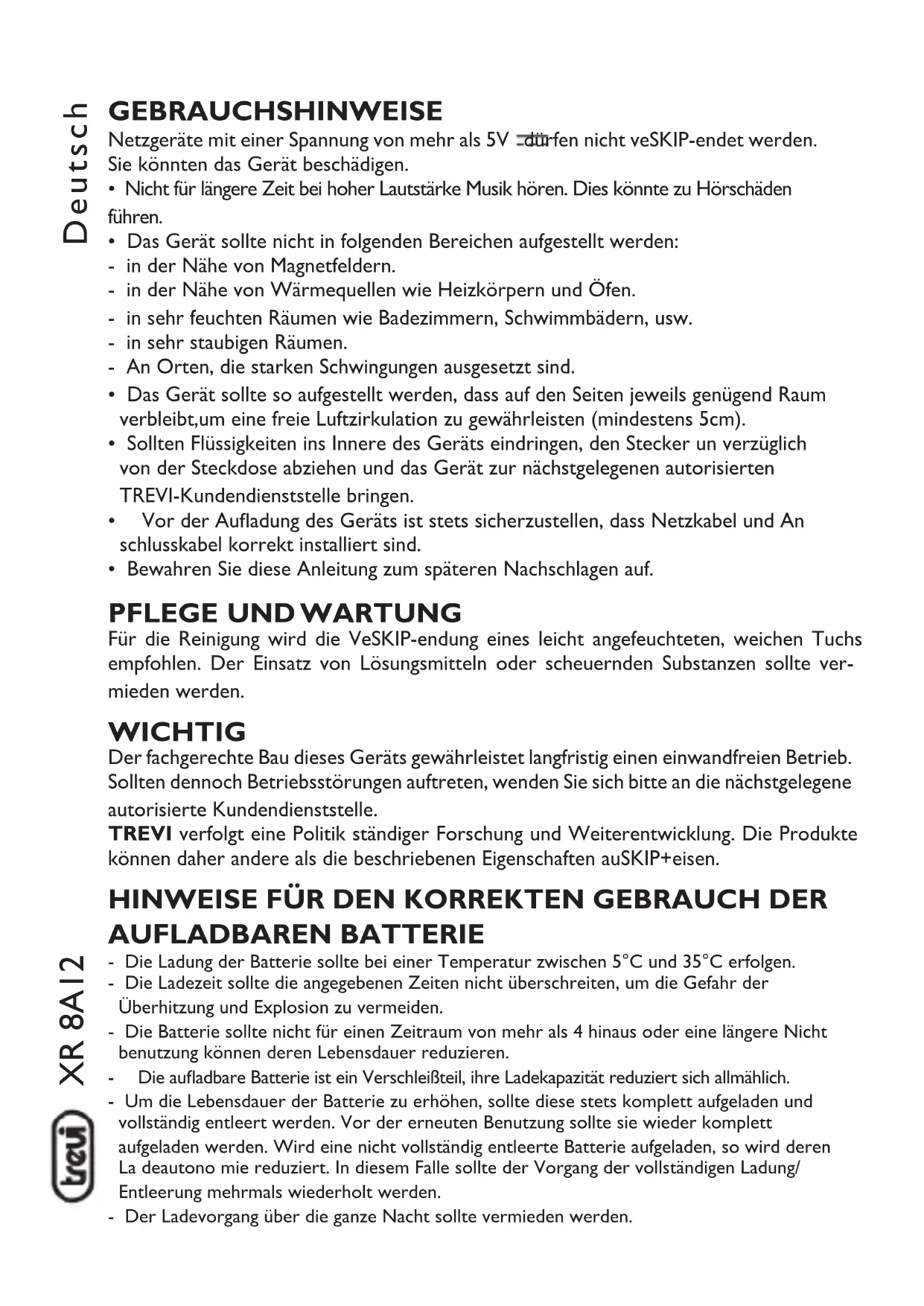 Für die Reinigung wird die VeSKIP-endung eines leicht angefeuchteten, weichen Tuchs empfohlen. Der Einsatz von Lösungsmitteln oder scheuernden Substanzen sollte ver- mieden werden. WICHTIG Der fachgerechte Bau dieses Geräts gewährleistet langfristig einen einwandfreien Betrieb. Sollten dennoch Betriebsstörungen auftreten, wenden Sie sich bitte an die nächstgelegene autorisierte Kundendienststelle. TREVI verfolgt eine Politik ständiger Forschung und Weiterentwicklung. Die Produkte können daher andere als die beschriebenen Eigenschaften auSKIP+eisen. HINWEISE FÜR DEN KORREKTEN GEBRAUCH DER AUFLADBAREN BATTERIE - Die Ladung der Batterie sollte bei einer Temperatur zwischen 5°C und 35°C erfolgen. - Die Ladezeit sollte die angegebenen Zeiten nicht überschreiten, um die Gefahr der Überhitzung und Explosion zu vermeiden. - Die Batterie sollte nicht für einen Zeitraum von mehr als 4 hinaus oder eine längere Nicht benutzung können deren Lebensdauer reduzieren. - DieauadbareBatterieisteinVerschleißteil,ihreLadekapazitätreduziertsichallmählich. - Um die Lebensdauer der Batterie zu erhöhen, sollte diese stets komplett aufgeladen und vollständig entleert werden. Vor der erneuten Benutzung sollte sie wieder komplett aufgeladen werden. Wird eine nicht vollständig entleerte Batterie aufgeladen, so wird deren La deautono mie reduziert. In diesem Falle sollte der Vorgang der vollständigen Ladung/ Entleerung mehrmals wiederholt werden. - Der Ladevorgang über die ganze Nacht sollte vermieden werden.XR 8A12 Deutsch