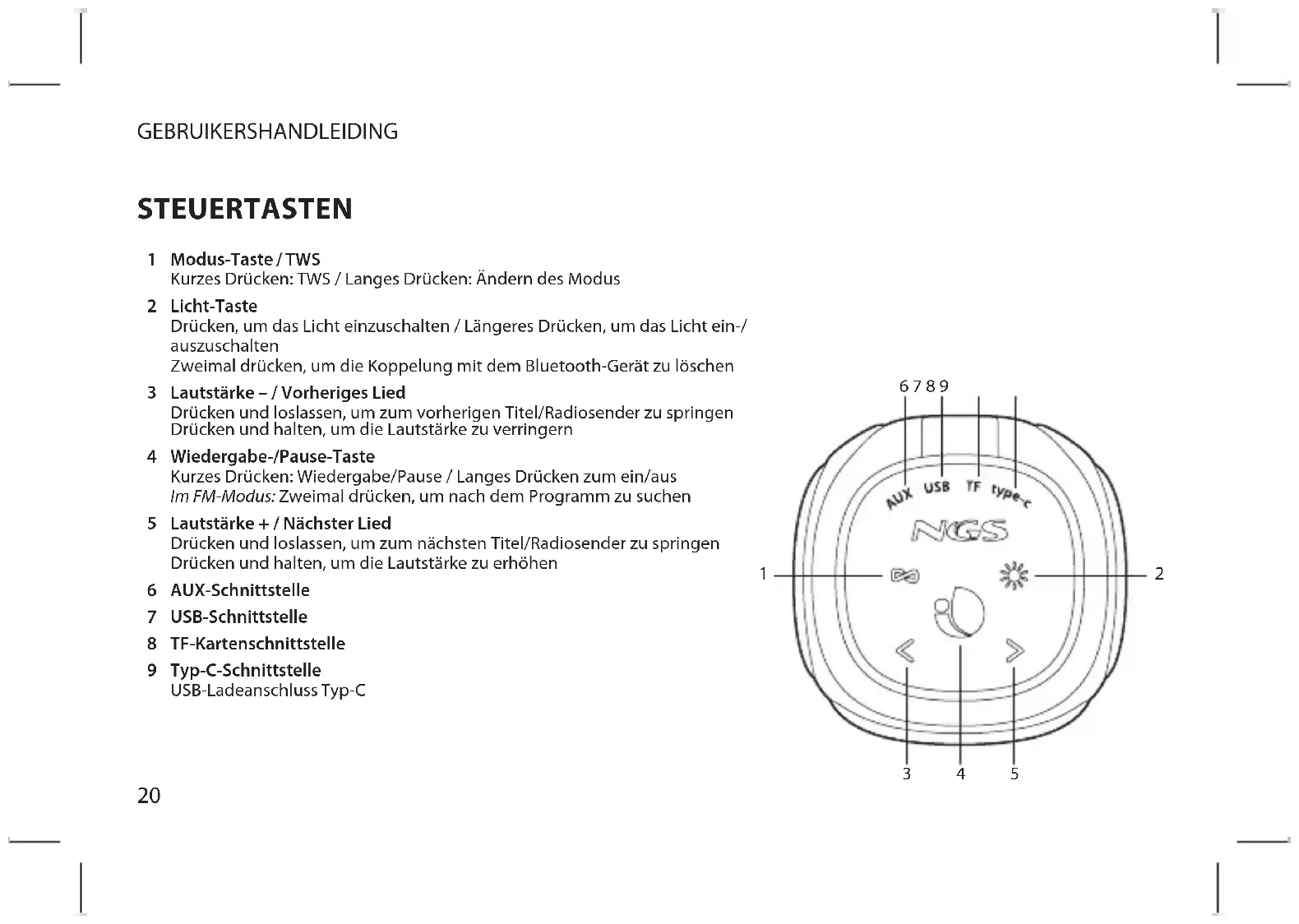 Die TWS-Taste erneut drücken, um den TWS-Modus zu verlassen Auf dem Mobilgerät die Bluetooth-Optionen durchsuchen nach „NGS Roller Beast“ Kanal – Kanal + Hinweis: Schließen Sie das USB C-kabel für ein besseres Radiosignal an.GEBRUIKERSHANDLEIDING