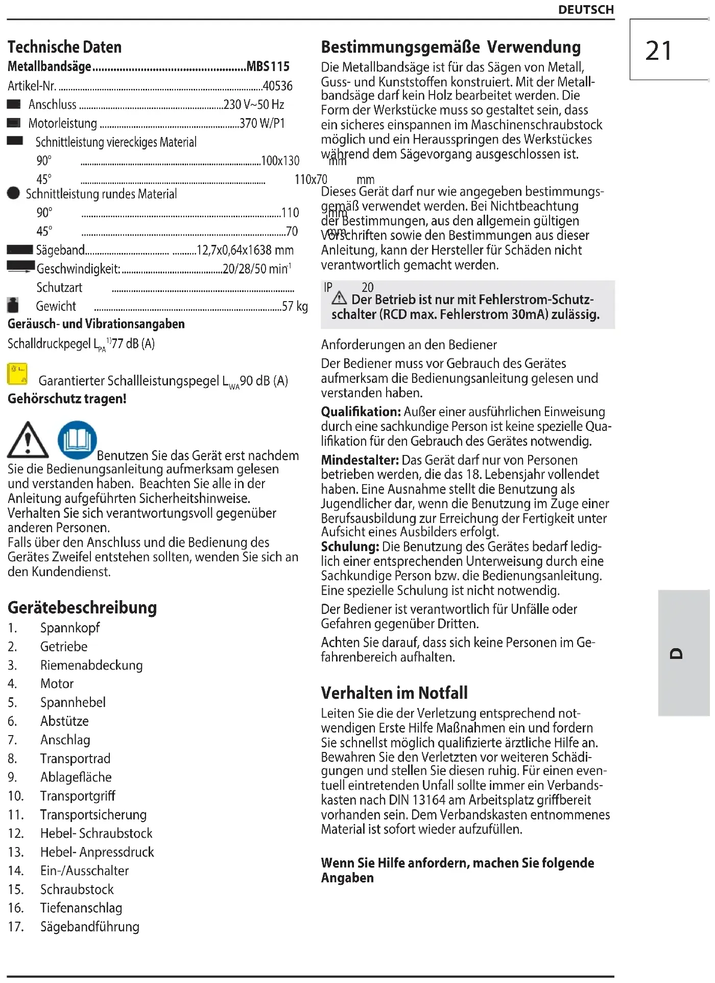 fahrenbereich aufhalten. Verhalten im Notfall Leiten Sie die der Verletzung entsprechend not- wendigen Erste Hilfe Maßnahmen ein und fordern Sie schnellst möglich qualizierte ärztliche Hilfe an. Bewahren Sie den Verletzten vor weiteren Schädi- gungen und stellen Sie diesen ruhig. Für einen even- tuell eintretenden Unfall sollte immer ein Verbands- kasten nach DIN 13164 am Arbeitsplatz gribereit vorhanden sein. Dem Verbandskasten entnommenes Material ist sofort wieder aufzufüllen. Wenn Sie Hilfe anfordern, machen Sie folgende Angaben Technische Daten Metallbandsäge ...................................................MBS 115 Artikel-Nr. .....................................................................................40536 Anschluss ............................................................230 V~50 Hz Motorleistung ..........................................................370 W/P1 Schnittleistung viereckiges Material 90° ................................................................................100x130 mm 45° .................................................................................. 110x70 mm Schnittleistung rundes Material 90° ...................................................................................110 mm 45° .....................................................................................70 mm Sägeband................................... ..........12,7x0,64x1638 mm Geschwindigkeit: ..........................................20/28/50 min