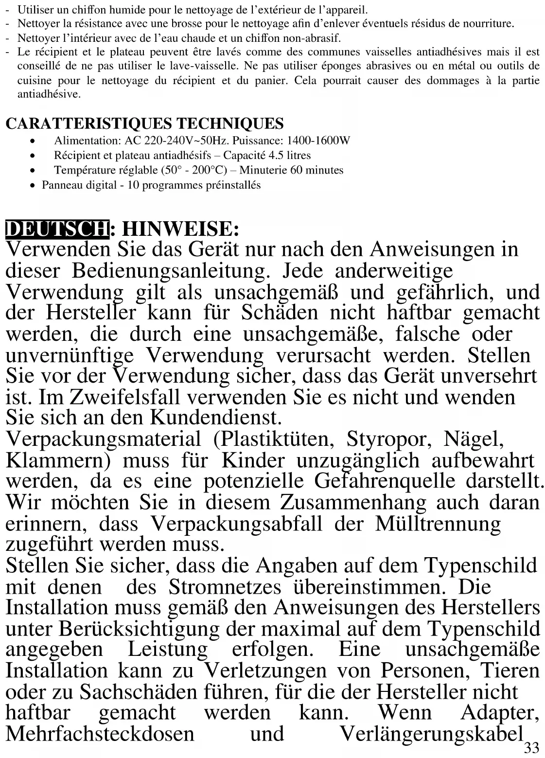 für mindestens 10 Minuten ein. REINIGUNG - Reinigen Sie das Gerät nach jeder Nutzung. Ziehen Sie den Stecker aus der Steckdose und lassen Sie alle Teile abkühlen, bevor Sie die Reinigung beginnen. Entnehmen Sie den Behälter, um schneller abkühlen zu lassen. Tauchen Sie das Gerät nicht in Wasser. Vermeiden Sie Wasser- oder andere Flüssigkeitspritzen auf das Gerät. Während der Reinigung, vermeiden Sie Wasser- oder Seifelecke in die Luftschitze. Für die Reinigung des äußeren Teils des Geräts, benutzen Sie ein weiches, gefeuchtetes Tuch. Reinigen Sie das Heizelement mit einer Reinigungsbürste, um Essenreste zu entfernen. Reinigen Sie den inneren Teil mit warmem Wasser und einem nicht scheuerndem Schwamm. Der Behälter und der Tablett können als normale beschichtete Pfannen gewaschen werden, der Gerschirrspüler ist jedoch nicht empfohlen. Benutzen Sie keine scheuernden Schwämme oder Metallschwämme oder Küchengeräte für die Reinigung von Behälter und Korb. Solche Mittel können die Beschichtungen beschädigen. TECHNISCHE DATEN