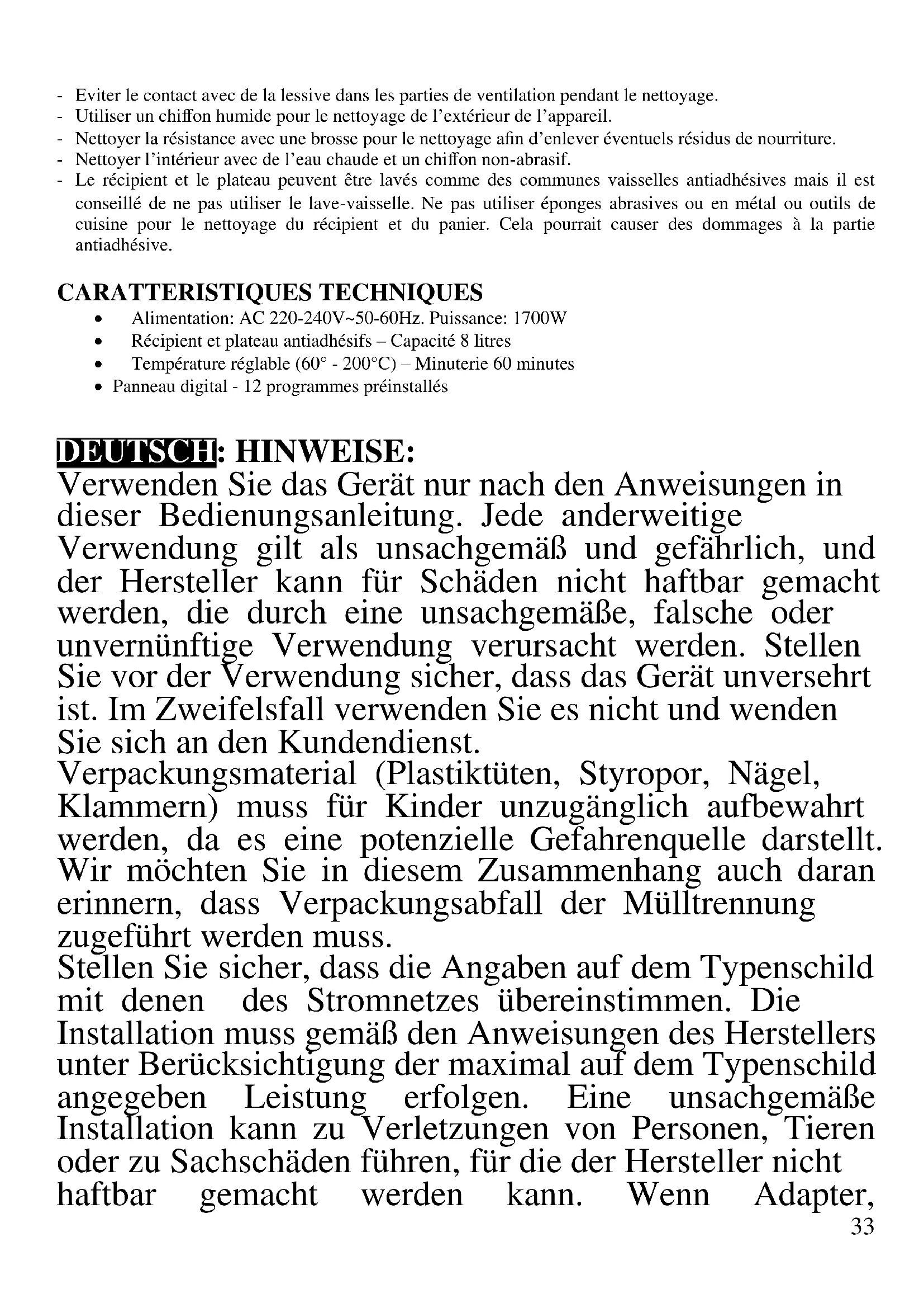 DEUTSCH: HINWEISE: Verwenden Sie das Gerät nur nach den Anweisungen in dieser Bedienungsanleitung. Jede anderweitige Verwendung gilt als unsachgemäß und gefährlich, und der Hersteller kann für Schäden nicht haftbar gemacht werden, die durch eine unsachgemäße, falsche oder unvernünftige Verwendung verursacht werden. Stellen Sie vor der Verwendung sicher, dass das Gerät unversehrt ist. Im Zweifelsfall verwenden Sie es nicht und wenden Sie sich an den Kundendienst. Verpackungsmaterial (Plastiktüten, Styropor, Nägel, Klammern) muss für Kinder unzugänglich aufbewahrt werden, da es eine potenzielle Gefahrenquelle darstellt. Wir möchten Sie in diesem Zusammenhang auch daran erinnern, dass Verpackungsabfall der Mülltrennung zugeführt werden muss. Stellen Sie sicher, dass die Angaben auf dem Typenschild mit denen des Stromnetzes übereinstimmen. Die Installation muss gemäß den Anweisungen des Herstellers unter Berücksichtigung der maximal auf dem Typenschild angegeben Leistung erfolgen. Eine unsachgemäße Installation kann zu Verletzungen von Personen, Tieren oder zu Sachschäden führen, für die der Hersteller nicht haftbar gemacht werden kann. Wenn Adapter,34 Mehrfachsteckdosen und Verlängerungskabel erforderlich sind, verwenden Sie nur solche, die die geltenden Sicherheitsstandards erfüllen. In keinem Fall dürfen die am einfachen Adapter und/oder an den Verlängerungskabeln angegebenen Verbrauchsgrenzen sowie die maximale Leistung überschritten werden, die auf dem Mehrfachadapter angegeben ist. - Verwenden Sie das Netzkabel nicht in der Nähe von scharfen Gegenständen oder heißen Oberflächen und ziehen Sie den Netzstecker nicht am Netzkabel aus der Steckdose. Lassen Sie es nicht von der Arbeitsplatte baumeln, wo ein Kind es halten könnte. Verwenden Sie das Gerät im Falle von Schäden am Netzkabel, Stecker oder im Falle von Kurzschlüssen nicht und lassen Sie es in einer Vertragswerkstatt reparieren. - Setzen Sie das Gerät keinen ungünstigen Wetterbedingungen, wie z. B. Regen, Feuchtigkeit, Frost, aus und bewahren Sie es an einem trockenen Ort auf. Fassen Sie das Gerät nicht mit nassen Händen an und verwenden Sie es nicht barfuß. - Dieses Gerät kann von Kindern ab 8 Jahren und von Personen mit eingeschränkten körperlichen, sensorischen oder geistigen Fähigkeiten oder mangelnder Erfahrung und Kenntnissen verwendet werden, wenn sie beaufsichtigt oder instruiert wurden, um das Gerät sicher zu verwenden und die damit verbundenen Gefahren zu verstehen. Kinder dürfen nicht mit dem Gerät spielen. Reinigung und Benutzerwartung dürfen nicht von Kindern ohne Aufsicht durchgeführt werden. - Kinder dürfen nicht mit dem Gerät spielen. - Bewahren Sie das Gerät und sein Netzanschluss außerhalb der Reichweite von Kinder unter 8 Jahren. Wenn das Netzkabel beschädigt ist oder wenn ein Fehler vorliegt, darf das Gerät nicht manipuliert werden. Jede35 Reparatur muss vom Hersteller oder seinem technischen Kundendienst oder in jedem Fall von einer Person mit ähnlicher Qualifikation durchgeführt werden, um jegliches Risiko zu vermeiden. Die Nichtbeachtung der vorstehenden Bestimmungen kann die Sicherheit des Geräts beeinträchtigen und die Garantiebedingungen ungültig machen. Dieses Gerät ist nur für den Hausgebrauch oder gleichwertiges bestimmt, in Situationen wie bspw.: Kantinen in kleinen Firmen oder ähnliche Arbeitsumgebungen, von Kunden in Hotels, Motels oder andere Art von touristische Unterkunft, wie ländlicher oder Wohn –Tourismus. Halten Sie das Gerät ausschließlich auf Griffflächen die abhalten und verwenden Sie solche Hitzeschutzmaßen. Das Gerät darf nicht mit einer Zeitschaltuhr oder mit einem separaten Fernwirksystem betrieben werden Führen Sie vor jedem Gebrauch das Netzkabel aus. Setzen Sie das Produkt keinen Stößen aus, es könnte beschädigt werden. Verwenden Sie nur originale und kompatible Teile und Zubehör. Halten Sie das Gerät fern von brennbaren Materialien, Wärmequellen, Dampf-und kalte Zonen. BEDIENUNGSANLEITUNG Stellen Sie die Wände des Geräts nicht an die Mauer. Lassen Sie mindestens 10cm Freiraum im Hinteren, an den Seiten und auf dem Gerät. Berühren Sie nie die inneren Teile des Geräts während des Betriebs. Das Gerät braucht ca. 30 Minuten, um sich nach der Nutzung abzukühlen. Behandeln Sie das gerade gekochte Essen sorgfältig, da es sehr heiß sein kann. Legen Sie keine Gegenstände auf das Gerät. Betreiben Sie nie das Gerät unbewacht. Nach jeder Nutzung, ziehen36 Sie immer den Stecker aus der Steckdose. Tauchen Sie nicht das Gerät ins Wasser oder in andere Flüssigkeiten und vermeiden Sie Spritze auf es. Befüllen Sie das Gerät nicht mit Öl: Brandgefahr. Während des Betriebs, stoßen die Luftschlitze warmen Dunst aus. Halten Sie Hände und Gesicht auf einen Sicherheitsabstand. Passen Sie auf den Dunst auf, wenn Sie den Behälter nach dem Kochen entnehmen. Vor jeder Nutzung, rollen Sie das Kabel ab. Verstopfen Sie die Luftschlitze nicht, wenn das Gerät in Betrieb ist. Benutzen Sie das Gerät nicht als Heizelement. Stecken Sie keine Gegenstände in die Luftschlitze. Bevor Sie das Gerät reinigen, stecken Sie den Stecker aus der Steckdose und warten Sie auf die Abkühlung aller Teile des Geräts. EINBAU Entnehmen Sie alle Gegenstände aus dem Kochraum. Legen Sie das Gerät auf stabile und feste Flächen. Benutzen Sie das Ofen nicht als Fläche für andere Gegenstände oder Regal für Lebensmittel, Töpfe, Behälter. MODELL G10176 1 Lufteintritt 2 Bedienfeld 3 Hauptteil 4 Fenster 5 Tablett 6 Behälter 7 hintere Gitteröffnung 8 Griff KOCHEN Vor der ersten Nutzung, waschen Sie alle Zubehörteile und den Kochraum sorgfältig. Lassen Sie den Kochraum lüften, in dem Sie den Behälter (6) ca. 30 Minuten draußen lassen. Bevor Sie zum ersten Mal kochen, lassen Sie das Ofen ca. 10 Minuten leer in Betrieb, bis es auf die maximale Temperatur geht. - Benutzen Sie einen geeigneten, geerdeten Stromanschluss. - Entfer