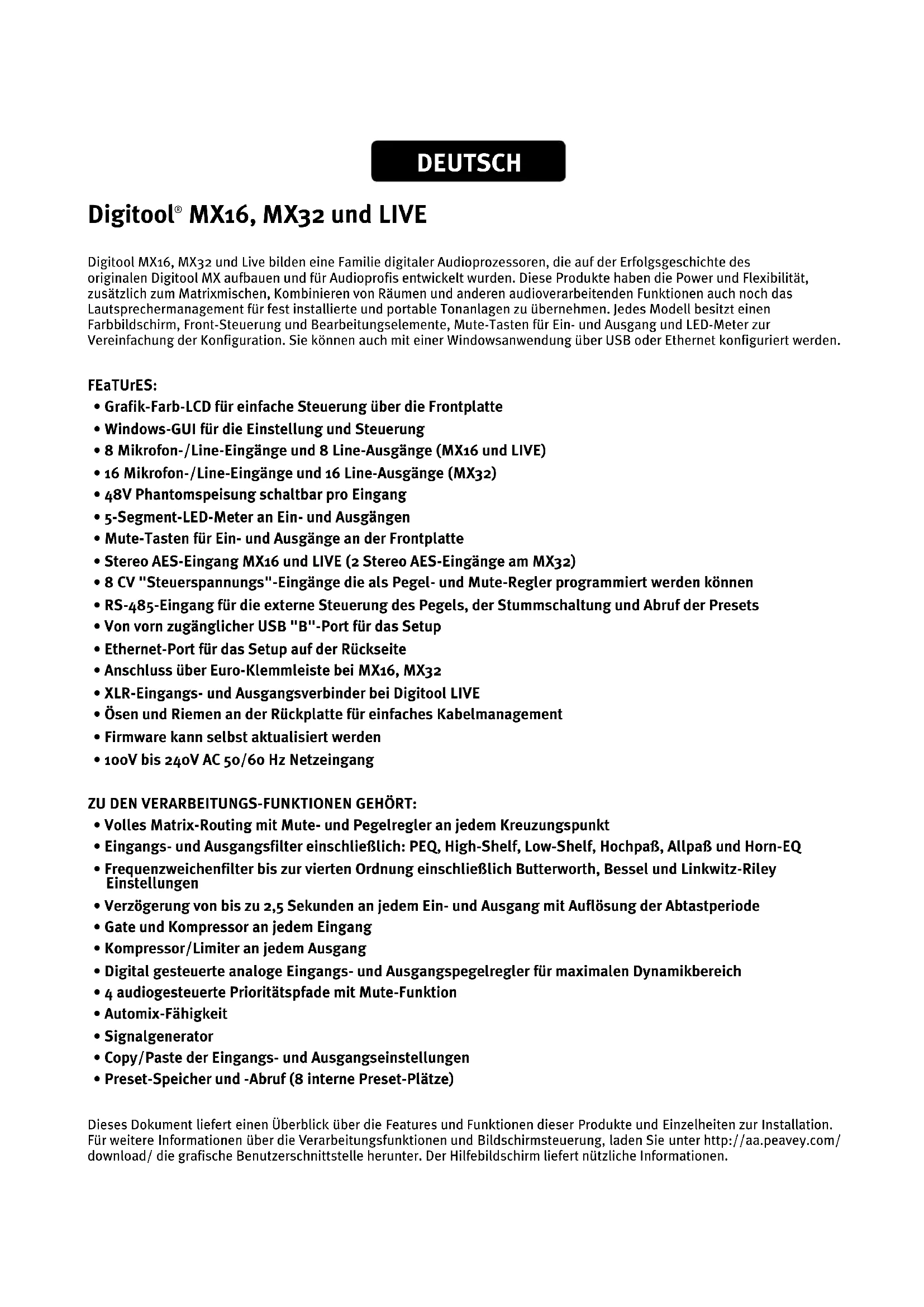 Finden Sie kostenlos die Bedienungsanleitung des Geräts Digitool MX16 PEAVEY als PDF.