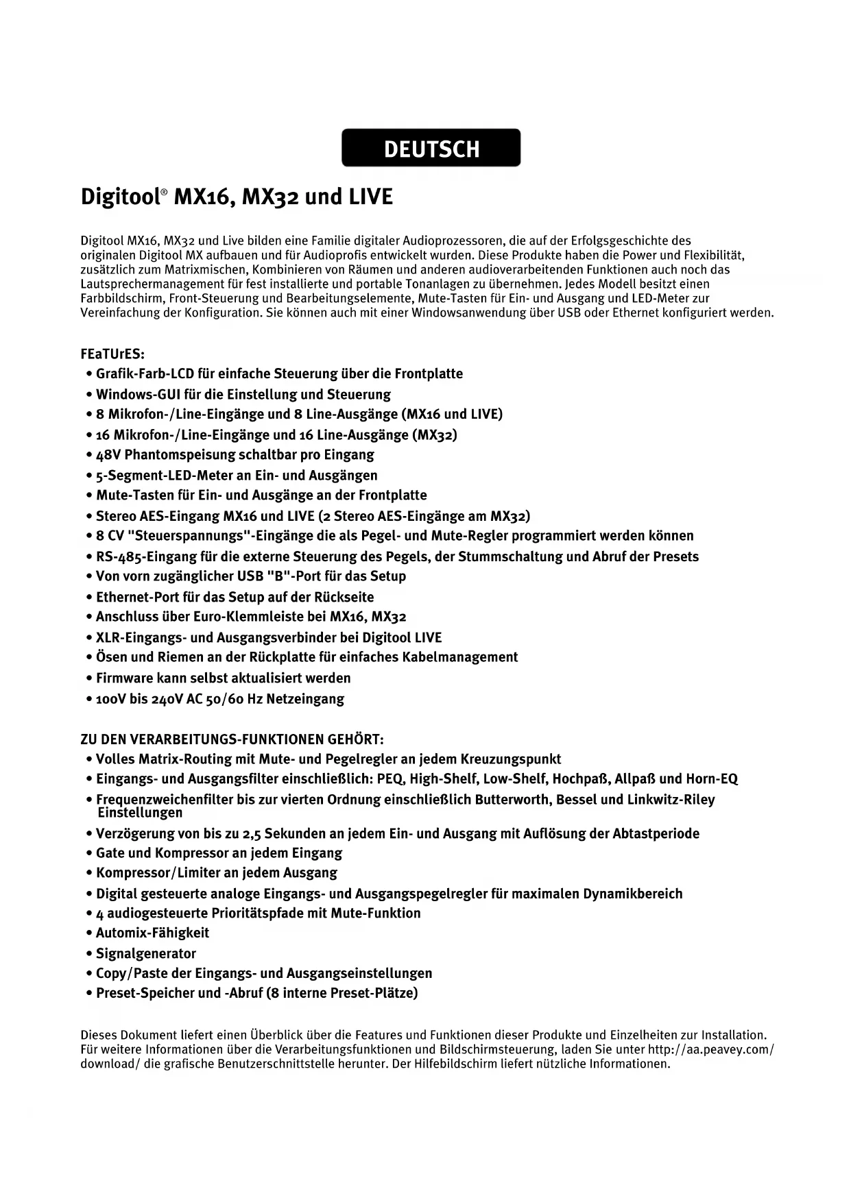 - Preset-Speicher und -Abruf (8 interne Preset-Plätze) Dieses Dokument liefert einen Überblick über die Features und Funktionen dieser Produkte und Einzelheiten zur Installation. Für weitere Informationen über die Verarbeitungsfunktionen und Bildschirmsteuerung, laden Sie unter http://aa.peavey.com/ download/ die grafische Benutzerschnittstelle herunter. Der Hilfebildschirm liefert nützliche Informationen.Digitool