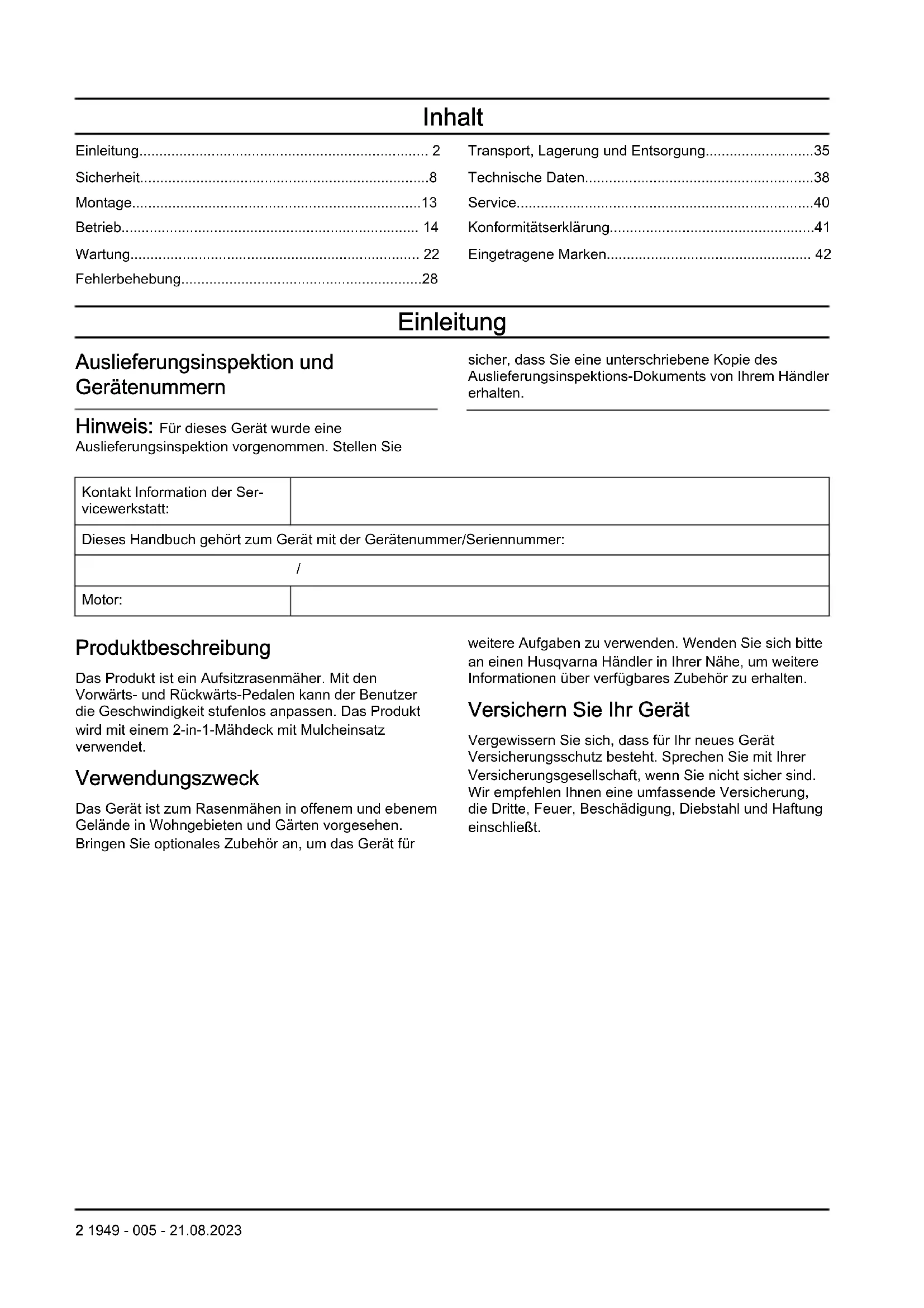 Motor: Produktbeschreibung Das Produkt ist ein Aufsitzrasenmäher. Mit den Vorwärts- und Rückwärts-Pedalen kann der Benutzer die Geschwindigkeit stufenlos anpassen. Das Produkt wird mit einem 2-in-1-Mähdeck mit Mulcheinsatz verwendet. Verwendungszweck Das Gerät ist zum Rasenmähen in offenem und ebenem Gelände in Wohngebieten und Gärten vorgesehen. Bringen Sie optionales Zubehör an, um das Gerät für weitere Aufgaben zu verwenden. Wenden Sie sich bitte an einen Husqvarna Händler in Ihrer Nähe, um weitere Informationen über verfügbares Zubehör zu erhalten. Versichern Sie Ihr Gerät Vergewissern Sie sich, dass für Ihr neues Gerät Versicherungsschutz besteht. Sprechen Sie mit Ihrer Versicherungsgesellschaft, wenn Sie nicht sicher sind. Wir empfehlen Ihnen eine umfassende Versicherung, die Dritte, Feuer, Beschädigung, Diebstahl und Haftung einschließt. 2 1949 - 005 - 21.08.2023Geräteübersicht