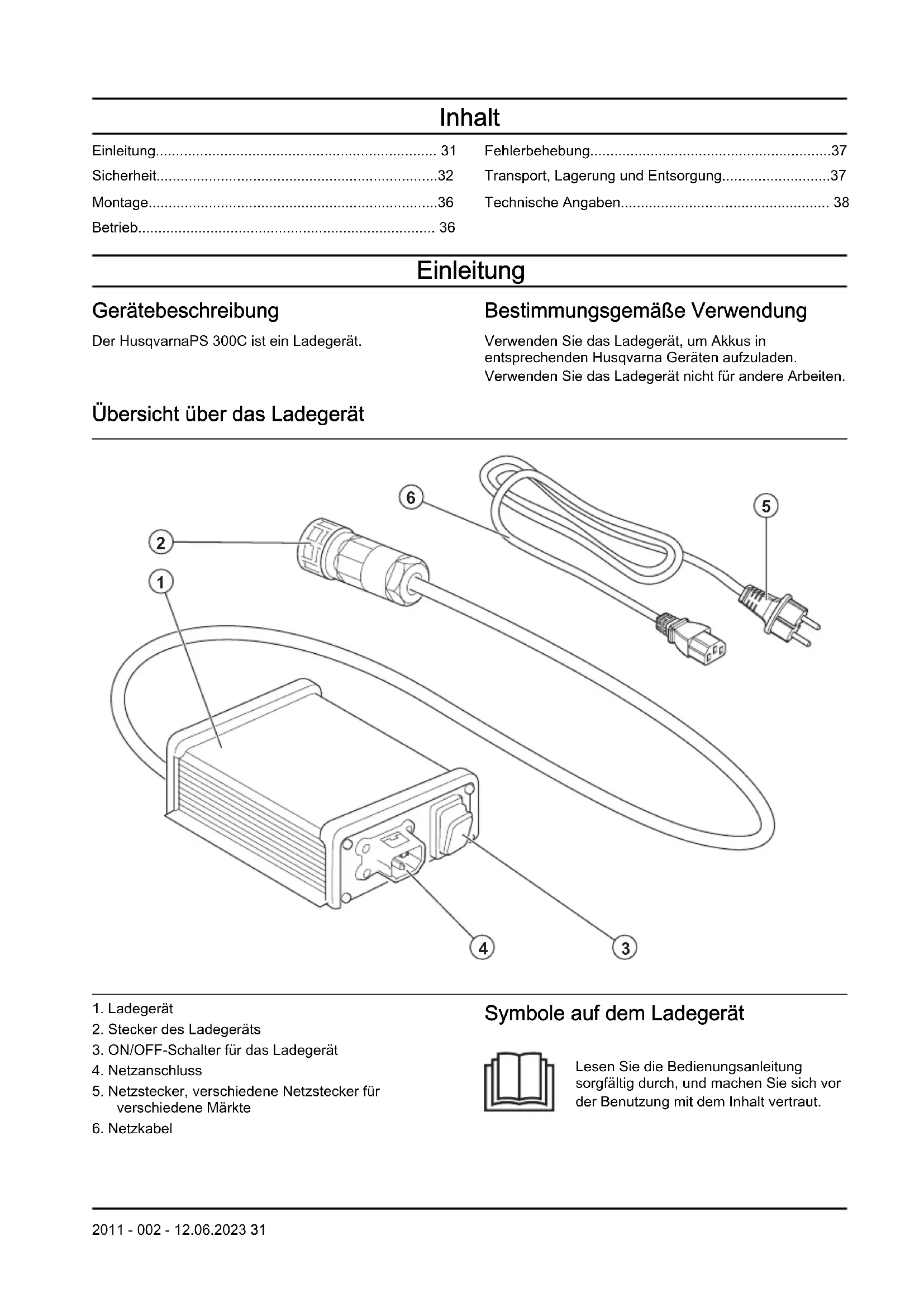 2011 - 002 - 12.06.2023• Laden Sie die Husqvarna- Originalakkus nur mit dem Ladegerät auf. Bei Fragen wenden Sie sich bitte an Ihren Husqvarna Händler.