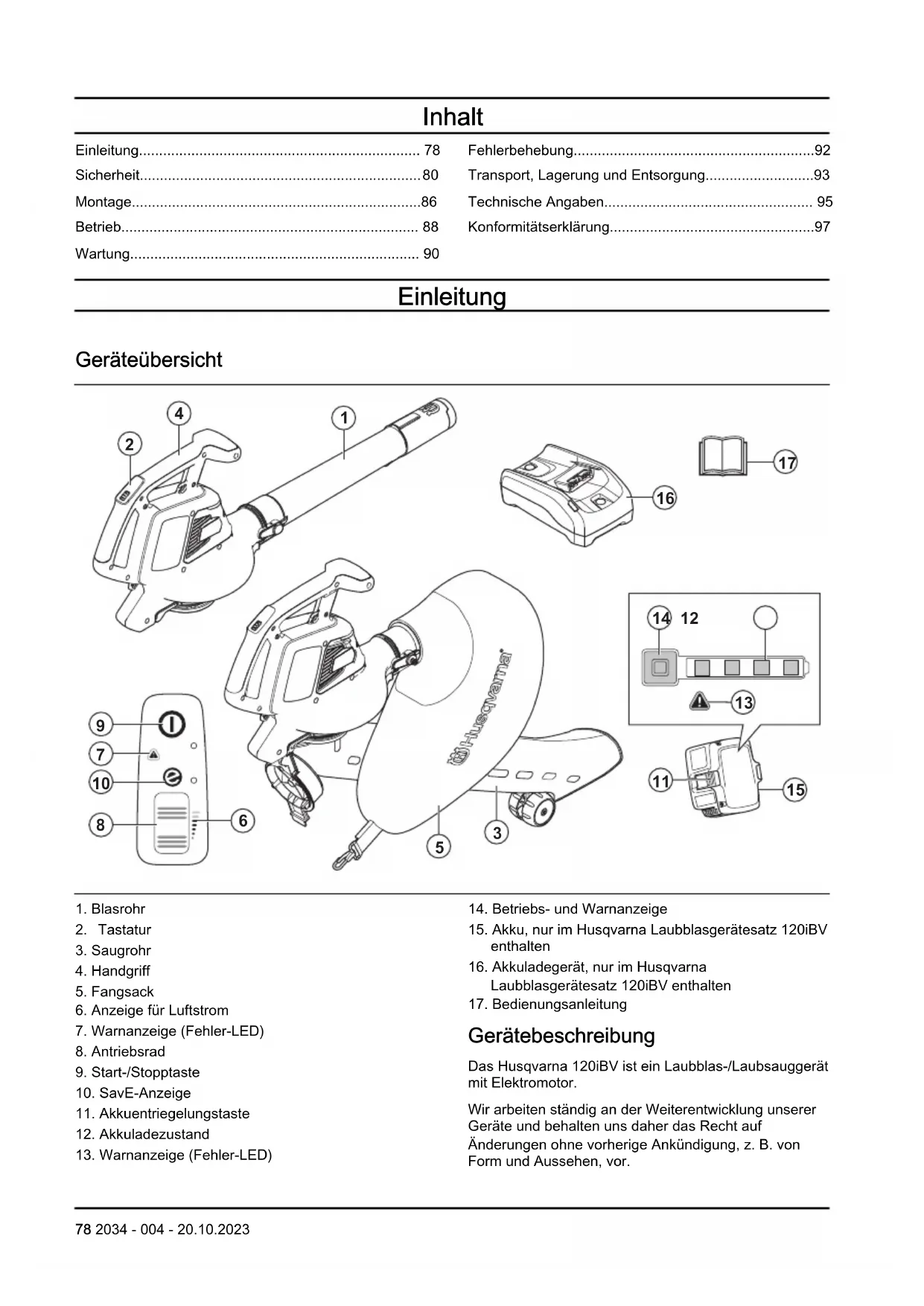 Gerätebeschreibung Das Husqvarna 120iBV ist ein Laubblas-/Laubsauggerät mit Elektromotor. Wir arbeiten ständig an der Weiterentwicklung unserer Geräte und behalten uns daher das Recht auf Änderungen ohne vorherige Ankündigung, z.B. von Form und Aussehen, vor. 78 2034 - 004 - 20.10.2023Bestimmungsgemäße Verwendung Laubblasmodus: Mit dem Laubblasgerät können Schmutzpartikel oder Rasenschnitt von Wegen, Einfahrten, Innenhöfen und dergleichen entfernt werden. Das Gerät eignet sich auch dazu, Rasenschnitt, Stroh oder Blätter anzuhäufen oder um Schmutzpartikel aus Ecken, Fugen oder Spalten zwischen Fliesen oder Ziegeln zu entfernen. Laubsaugmodus: Mit dem Laubsauggerät kann trockenes Material aufgesaugt werden. Dazu gehören Blätter, Gras, kleine Zweige und Papierstücke. Symbole auf dem Gerät WARNUNG: Dieses Gerät kann gefährlich sein und schwere oder tödliche Verletzungen des Bedieners oder anderer Personen verursachen. Gehen Sie vorsichtig vor, und verwenden Sie das Gerät ordnungsgemäß. Lesen Sie die Bedienungsanleitung sorgfältig durch, und machen Sie sich mit den Anweisungen vertraut, bevor Sie das Gerät benutzen. Tragen Sie einen zugelassenen Augenschutz. Nennspannung, V Gleichstrom. Etikett mit Geräuschemissionen gemäß EU- und UK-Richtlinien und Verordnungen sowie der australischen „Protection of the Environment Operations (Noise Control) Regulation2017“ (Umweltschutz-/Lärmschutzbestimmung) von New South Wales. Der garantierte Schallleistungspegel des Geräts ist unter Technische Angaben auf Seite 95 und auf dem Etikett angegeben. Trennen Sie den Akku vor der Wartung. Das Gerät und die Verpackung des Geräts dürfen nicht über den Hausmüll entsorgt werden. Recyceln Sie es an einer Recyclingstation für elektrische und elektronische Geräte. Dieses Gerät entspricht den geltenden EG-Richtlinien. Dieses Gerät entspricht den geltenden UK-Richtlinien. Verwenden Sie das Gerät nicht bei Regen. Warten Sie, bis die Ro- torklingen nach dem Aus- schalten des Geräts zum Stillstand kommen. Verwenden Sie das Gerät nur im Laubsaugmodus, wenn das Rohr vollständig zusammengesetzt ist. Der Bediener des Laubblasgeräts hat dafür zu sorgen, dass Menschen und Tiere einen Abstand von mindes- tens 15m einhalten. Wenn mehre- re Bediener im selben Nahbereich ar- beiten, muss der Sicherheitsabstand mindestens 15m betragen. Das Laubblasgerät kann Gegenstände mit großer Kraft herausschleudern, die zurückprallen können. Dies kann zu schweren Augenverletzungen führen, wenn die empfohlene Schutzausrüs- tung nicht getragen wird. jjjj wwxxxx Auf dem Typenschild ist die Serien- nummer angegeben. yyyy ist das Produktionsjahr, ww steht für die Pro- duktionswoche. Hinweis: Sonstige Symbole/Aufkleber auf dem Anbaugerät beziehen sich auf spezielle Zertifizierungsanforderungen, die in bestimmten Ländern gelten. 2034 - 004 - 20.10.2023 79Symbole auf dem Akku und/oder auf dem Ladegerät Recyceln Sie dieses Gerät an einer Recyclingstation für elektrische und elektronische Geräte. (nur für Europa) Störungsfreier Transformator. Das Akkuladegerät darf nur in geschlossenen Räumen benutzt und aufbewahrt werden. Doppelt isoliert Hersteller Husqvarna AB Drottninggatan 2, SE-561 82 Huskvarna Produktschäden Wir haften nicht für Schäden an unserem Produkt, wenn: