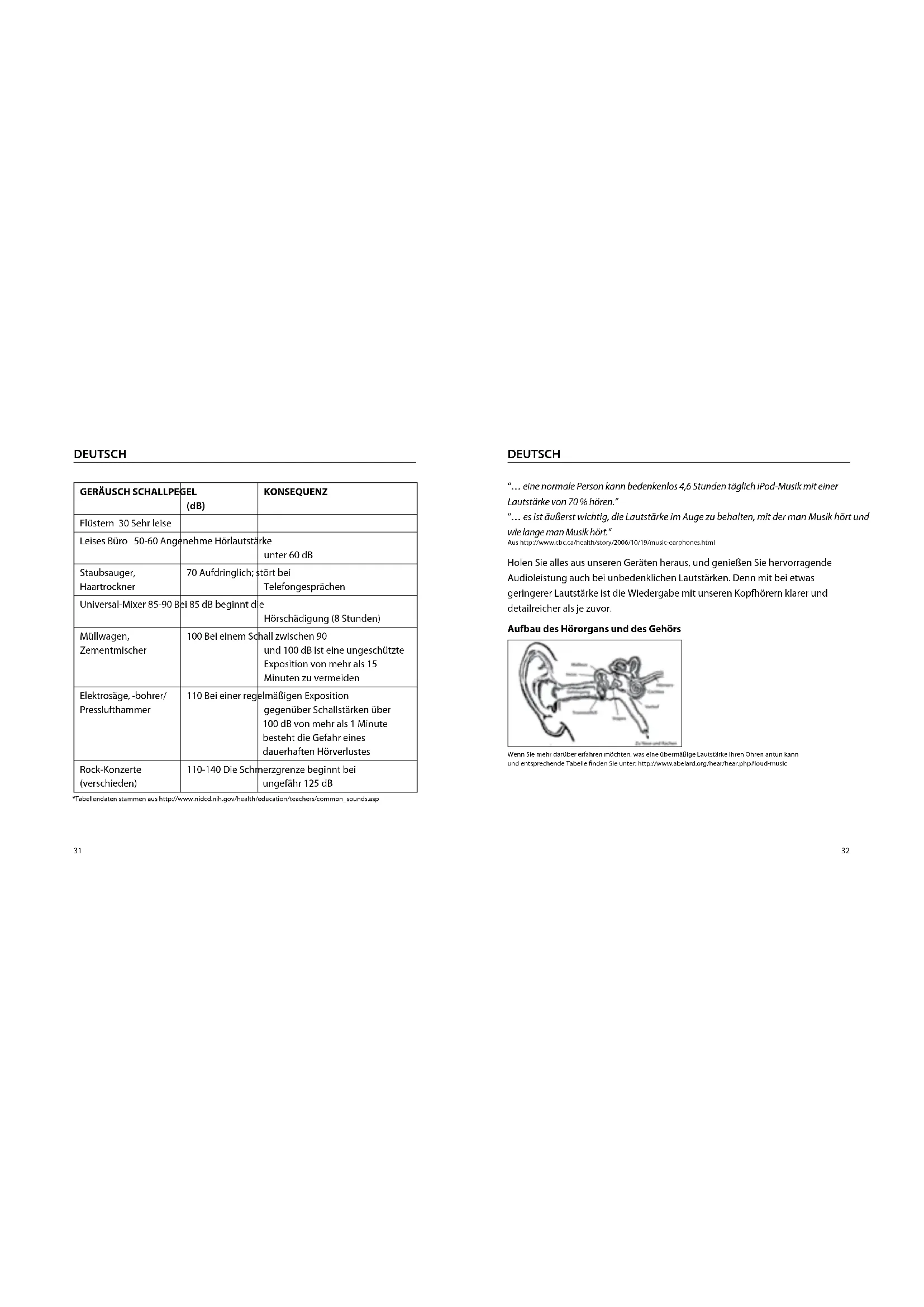 (dB) KONSEQUENZ Flüstern 30 Sehr leise Leises Büro 50-60 Angenehme Hörlautstärke unter 60 dB Staubsauger, Haartrockner 70 Aufdringlich; stört bei Telefongesprächen Universal-Mixer 85-90 Bei 85 dB beginnt die Hörschädigung (8 Stunden) Müllwagen, Zementmischer 100 Bei einem Schall zwischen 90 und 100 dB ist eine ungeschützte Exposition von mehr als 15 Minuten zu vermeiden Elektrosäge, -bohrer/ Presslufthammer 110 Bei einer regelmäßigen Exposition gegenüber Schallstärken über 100 dB von mehr als 1 Minute besteht die Gefahr eines dauerhaften Hörverlustes Rock-Konzerte (verschieden) 110-140 Die Schmerzgrenze beginnt bei ungefähr 125 dB *Tabellendaten stammen aus http://www.nidcd.nih.gov/health/education/teachers/common_sounds.asp “… eine normale Person kann bedenkenlos 4,6 Stunden täglich iPod-Musik mit einer Lautstärke von 70 % hören.” “… es ist äußerst wichtig, die Lautstärke im Auge zu behalten, mit der man Musik hört und wie lange man Musik hört.” Aus http://www.cbc.ca/health/story/2006/10/19/music-earphones.html Holen Sie alles aus unseren Geräten heraus, und genießen Sie hervorragende Audioleistung auch bei unbedenklichen Lautstärken. Denn mit bei etwas geringerer Lautstärke ist die Wiedergabe mit unseren Kopfhörern klarer und detailreicher als je zuvor. Aufbau des Hörorgans und des Gehörs Wenn Sie mehr darüber erfahren möchten, was eine übermäßige Lautstärke Ihren Ohren antun kann und entsprechende Tabelle nden Sie unter: http://www.abelard.org/hear/hear.php#loud-music33 DEUTSCH