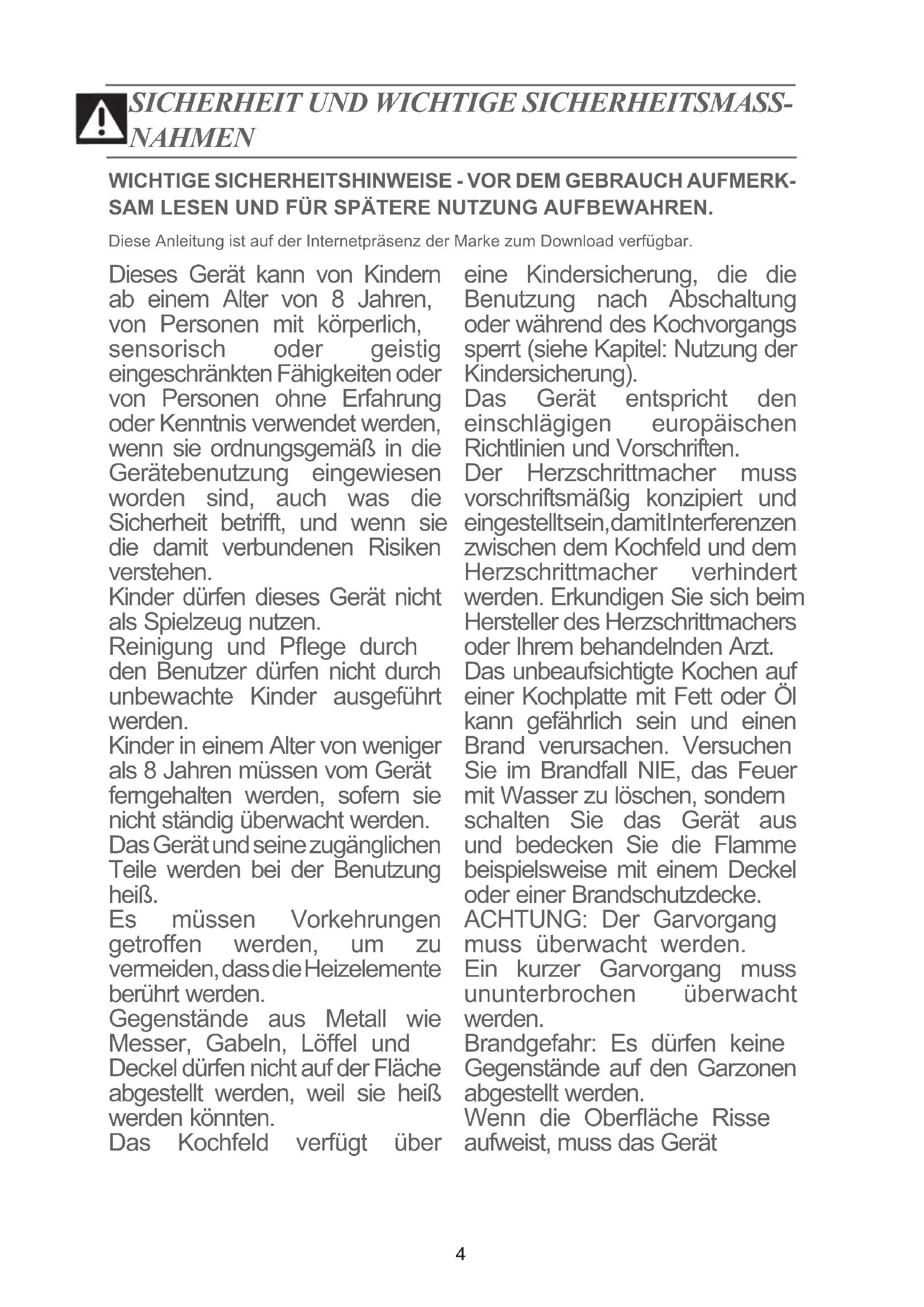 NAHMEN Dieses Gerät kann von Kindern ab einem Alter von 8 Jahren, von Personen mit körperlich, sensorisch oder geistig eingeschränkten Fähigkeiten oder von Personen ohne Erfahrung oder Kenntnis verwendet werden, wenn sie ordnungsgemäß in die Gerätebenutzung eingewiesen worden sind, auch was die Sicherheit betrit, und wenn sie die damit verbundenen Risiken verstehen. Kinder dürfen dieses Gerät nicht als Spielzeug nutzen. Reinigung und Pege durch den Benutzer dürfen nicht durch unbewachte Kinder ausgeführt werden. Kinder in einem Alter von weniger als 8 Jahren müssen vom Gerät ferngehalten werden, sofern sie nicht ständig überwacht werden. Das Gerät und seine zugänglichen Teile werden bei der Benutzung heiß. Es müssen Vorkehrungen getroffen werden, um zu vermeiden, dass die Heizelemente berührt werden. Gegenstände aus Metall wie Messer, Gabeln, Löel und Deckel dürfen nicht auf der Fläche abgestellt werden, weil sie heiß werden könnten. Das Kochfeld verfügt über eine Kindersicherung, die die Benutzung nach Abschaltung oder während des Kochvorgangs sperrt (siehe Kapitel: Nutzung der Kindersicherung). Das Gerät entspricht den einschlägigen europäischen Richtlinien und Vorschriften. Der Herzschrittmacher muss vorschriftsmäßig konzipiert und eingestellt sein, damit Interferenzen zwischen dem Kochfeld und dem Herzschrittmacher verhindert werden. Erkundigen Sie sich beim Hersteller des Herzschrittmachers oder Ihrem behandelnden Arzt. Das unbeaufsichtigte Kochen auf einer Kochplatte mit Fett oder Öl kann gefährlich sein und einen Brand verursachen. Versuchen Sie im Brandfall NIE, das Feuer mit Wasser zu löschen, sondern schalten Sie das Gerät aus und bedecken Sie die Flamme beispielsweise mit einem Deckel oder einer Brandschutzdecke. ACHTUNG: Der Garvorgang muss überwacht werden. Ein kurzer Garvorgang muss ununterbrochen überwacht werden. Brandgefahr: Es dürfen keine Gegenstände auf den Garzonen abgestellt werden. Wenn die Oberäche Risse aufweist, muss das Gerät5