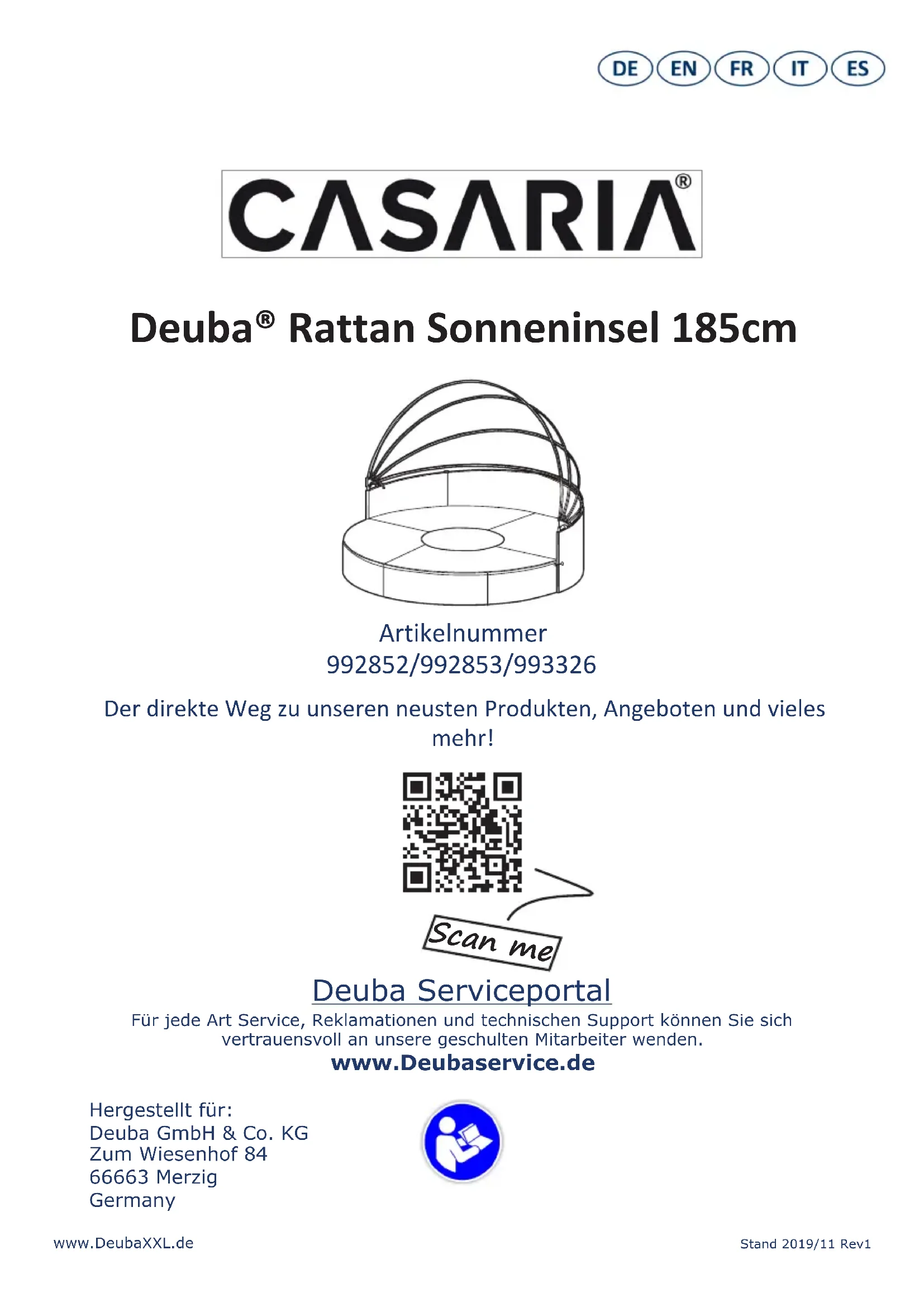 Hergestellt für:Deuba GmbH & Co. KGZum Wiesenhof 8466663 MerzigGermanyStand 2019/11 Rev1 Deuba® Rattan Sonneninsel 185cm Artikelnummer 992852/992853/993326 Deuba Serviceportal Für jede Art Service, Reklamationen und technischen Support können Sie sich vertrauensvoll an unsere geschulten Mitarbeiter wenden.www.Deubaservice.de Der direkte Weg zu unseren neusten Produkten, Angeboten und vieles mehr! Scan me www.DeubaXXL.de2 www.DeubaXXL.de ANLEITUNG ACHTUNG! Beachten Sie die Sicherheitshinweise und Aufbauanweisungen, um das Risiko von Verletzungen oder Beschädigungen am Produkt zu vermeiden. Wichtig: Lesen Sie vor der ersten Verwendung die Anleitung vollständig und gründlich durch. Bewahren Sie diese Anleitung zum späteren Nachschlagen auf. Sollten Sie eines Tages das Produkt weitergeben, achten Sie darauf, auch diese Anleitung weiterzugeben Halten Sie kleine Teile und Verpackungsmaterial von Kindern fern! Erstickungsgefahr! Prüfen Sie den Lieferumfang auf Vollständigkeit. Spätere Reklamationen können nicht akzeptiert werden. Prüfen Sie alle Elemente und Teile auf Schäden. Trotz sorgfältiger Kontrollen kann es passieren, dass auch die beste Ware auf dem Transportweg Schaden nimmt. Bauen Sie in solch einem Fall Ihr Produkt nicht auf. Defekte Teile können Gefahren und Gesundheitsschäden nach sich ziehen. Nehmen Sie niemals Änderungen am Produkt vor! Durch Änderungen erlischt die Garantie und das Produkt kann unsicher bzw. schlimmstenfalls sogar gefährlich werden. Packen Sie alle Teile und Elemente des Sets aus und platzieren Sie die Komponenten auf der Oberseite des Kartons oder einer anderen sauberen Oberfläche. Dies schützt Ihr neues Produkt. Achten Sie dabei auch darauf, den Boden nicht zu verkratzen, wenn Sie mit Werkzeugen arbeiten. Stellen sie sicher, dass dieses Produkt vor Gebrauch vollständig montiert ist.