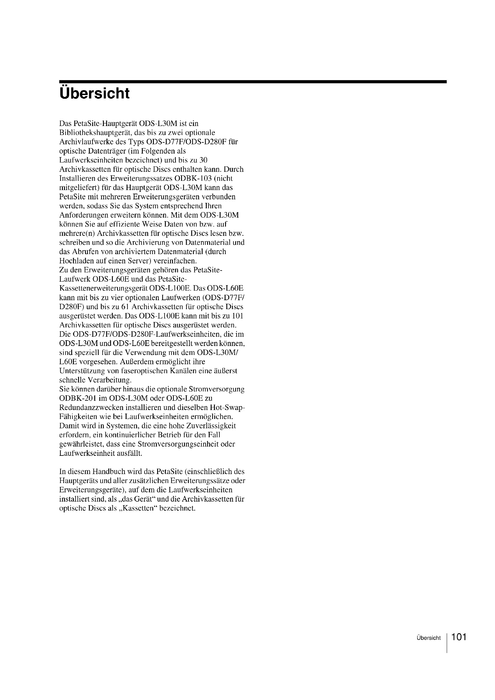 - Technische Daten 01 Übersicht Übersicht Das PetaSite-Hauptgerät ODS-L30M ist ein Bibliothekshauptgerät, das bis zu zwei optionale Archivlaufwerke des Typs ODS-D77F/ODS-D280F für optische Datenträger (im Folgenden als Laufwerkseinheiten bezeichnet) und bis zu 30 Archivkassetten für optische Discs enthalten kann. Durch Installieren des Erweiterungssatzes ODBK-103 (nicht mitgeliefert) für das Hauptgerät ODS-L30M kann das PetaSite mit mehreren Erweiterungsgeräten verbunden werden, sodass Sie das System entsprechend Ihren Anforderungen erweitern können. Mit dem ODS-L30M können Sie auf effiziente Weise Daten von bzw. auf mehrere(n) Archivkassetten für optische Discs lesen bzw. schreiben und so die Archivierung von Datenmaterial und das Abrufen von archiviertem Datenmaterial (durch Hochladen auf einen Server) vereinfachen. Zu den Erweiterungsgeräten gehören das PetaSite- Laufwerk ODS-L60E und das PetaSite- Kassettenerweiterungsgerät ODS-L100E. Das ODS-L60E kann mit bis zu vier optionalen Laufwerken (ODS-D77F/ D280F) und bis zu 61 Archivkassetten für optische Discs ausgerüstet werden. Das ODS-L100E kann mit bis zu 101 Archivkassetten für optische Discs ausgerüstet werden. Die ODS-D77F/ODS-D280F-Laufwerkseinheiten, die im ODS-L30M und ODS-L60E bereitgestellt werden können, sind speziell für die Verwendung mit dem ODS-L30M/ L60E vorgesehen. Außerdem ermöglicht ihre Unterstützung von faseroptischen Kanälen eine äußerst schnelle Verarbeitung. Sie können darüber hinaus die optionale Stromversorgung ODBK-201 im ODS-L30M oder ODS-L60E zu Redundanzzwecken installieren und dieselben Hot-Swap- Fähigkeiten wie bei Laufwerkseinheiten ermöglichen. Damit wird in Systemen, die eine hohe Zuverlässigkeit erfordern, ein kontinuierlicher Betrieb für den Fall gewährleistet, dass eine Stromversorgungseinheit oder Laufwerkseinheit ausfällt. In diesem Handbuch wird das PetaSite (einschließlich des Hauptgeräts und aller zusätzlichen Erweiterungssätze oder Erweiterungsgeräte), auf dem die Laufwerkseinheiten installiert sind, als „das Gerät“ und die Archivkassetten für optische Discs als „Kassetten“ bezeichnet.102 Übersicht Beispiel für eine Systemkonfiguration Mit dem Gerät können in Verbindung mit zugehörigen Geräten die folgenden Arten von Systemen erstellt werden: Für ausführliche Informationen über die empfohlene Konfiguration des Servers zum Anschluss einer Laufwerkseinheit laden Sie den technischen Hinweis von der Sony Creative Software-Website herunter (Seite 128). Gigabit- Ethernet-Switch Macintosh- Computer Windows-Computer Server (mit HSM- Anwendung) Faseroptischer Switch Dieses Gerät Ethernet Speicher Server (mit MAM- Anwendung) Faseroptischer Kanal103 Name und Funktion der Teile Name und Funktion der Teile ODS-L30M Vorderseite Die Vorderseite des ODS-L30M kann entfernt und gegen die Vorderseiten der Erweiterungsgeräte ODS-L60E/ L100E ausgetauscht werden. Das ODS-L30M wird als unterstes Gerät in einem Stapel mehrerer Geräte installiert. Seine Vorderseite kann jedoch an einem Erweiterungsgerät angebracht werden, dessen Höhe die Bedienung erleichtert. a Taste und Anzeige EIN/Bereitschaft Schaltet das Gerät abwechselnd ein bzw. in den Bereitschaftsmodus, wenn die Netzschalter auf der Rückseite eingeschaltet sind. Drücken Sie die Taste bei eingeschaltetem Gerät, um es in den Bereitschaftsmodus zu schalten. Auf dem Display wird die Meldung angezeigt, dass das Gerät heruntergefahren wird. Wählen Sie mit den Pfeiltasten die Option „Yes“ aus, und drücken Sie dann die Taste ENTER. Die Anzeige leuchtet im Betriebsmodus grün und im Bereitschaftsmodus rot. Die Anzeige blinkt grün, wenn das Gerät heruntergefahren wird. p. 1271
