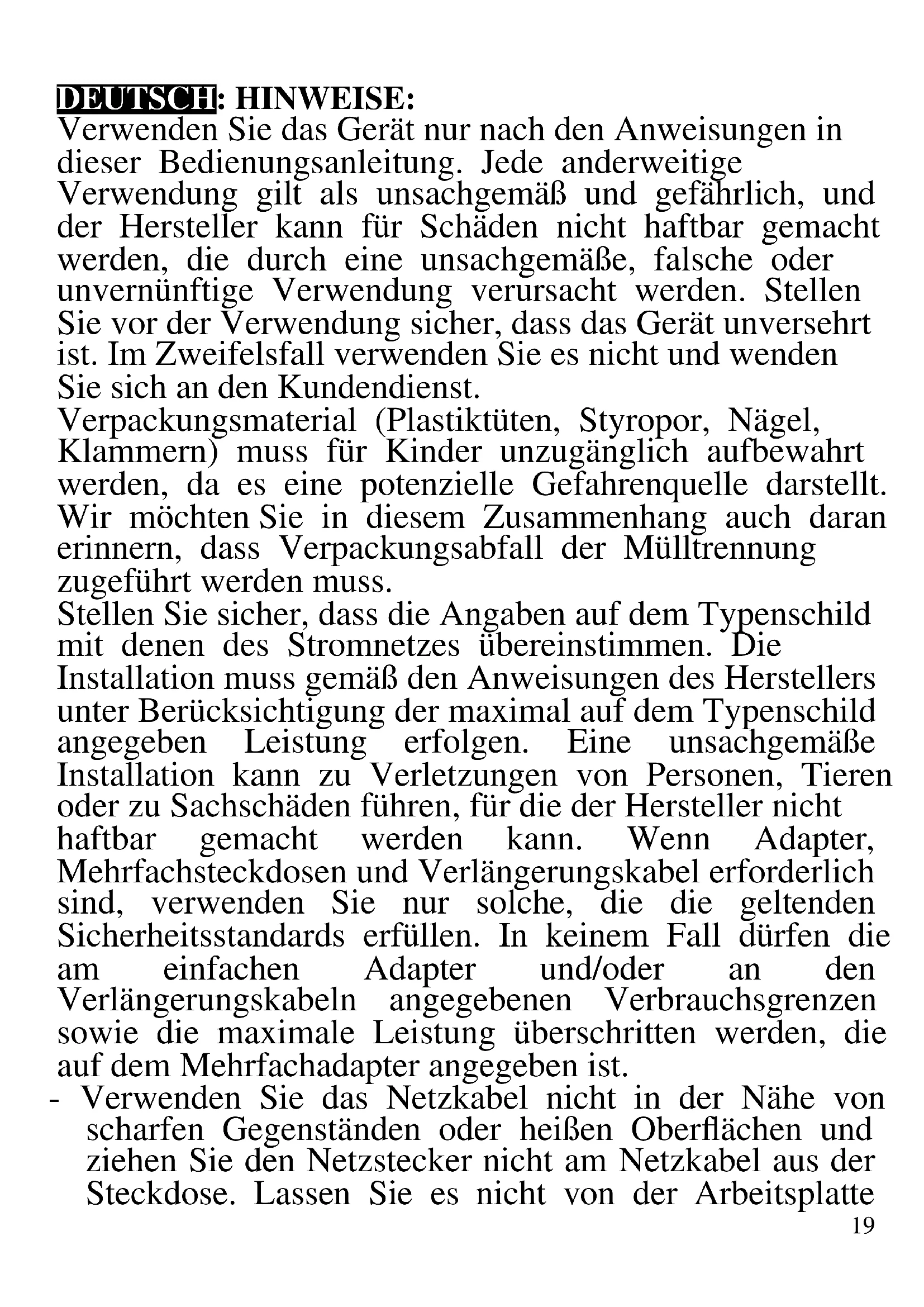 - Diámetro de la placa: 11 cm19 DEUTSCH: HINWEISE: Verwenden Sie das Gerät nur nach den Anweisungen in dieser Bedienungsanleitung. Jede anderweitige Verwendung gilt als unsachgemäß und gefährlich, und der Hersteller kann für Schäden nicht haftbar gemacht werden, die durch eine unsachgemäße, falsche oder unvernünftige Verwendung verursacht werden. Stellen Sie vor der Verwendung sicher, dass das Gerät unversehrt ist. Im Zweifelsfall verwenden Sie es nicht und wenden Sie sich an den Kundendienst. Verpackungsmaterial (Plastiktüten, Styropor, Nägel, Klammern) muss für Kinder unzugänglich aufbewahrt werden, da es eine potenzielle Gefahrenquelle darstellt. Wir möchten Sie in diesem Zusammenhang auch daran erinnern, dass Verpackungsabfall der Mülltrennung zugeführt werden muss. Stellen Sie sicher, dass die Angaben auf dem Typenschild mit denen des Stromnetzes übereinstimmen. Die Installation muss gemäß den Anweisungen des Herstellers unter Berücksichtigung der maximal auf dem Typenschild angegeben Leistung erfolgen. Eine unsachgemäße Installation kann zu Verletzungen von Personen, Tieren oder zu Sachschäden führen, für die der Hersteller nicht haftbar gemacht werden kann. Wenn Adapter, Mehrfachsteckdosen und Verlängerungskabel erforderlich sind, verwenden Sie nur solche, die die geltenden Sicherheitsstandards erfüllen. In keinem Fall dürfen die am einfachen Adapter und/oder an den Verlängerungskabeln angegebenen Verbrauchsgrenzen sowie die maximale Leistung überschritten werden, die auf dem Mehrfachadapter angegeben ist. - Verwenden Sie das Netzkabel nicht in der Nähe von scharfen Gegenständen oder heißen Oberflächen und ziehen Sie den Netzstecker nicht am Netzkabel aus der Steckdose. Lassen Sie es nicht von der Arbeitsplatte20 baumeln, wo ein Kind es halten könnte. Verwenden Sie das Gerät im Falle von Schäden am Netzkabel, Stecker oder im Falle von Kurzschlüssen nicht und lassen Sie es in einer Vertragswerkstatt reparieren. - Setzen Sie das Gerät keinen ungünstigen Wetterbedingungen, wie z. B. Regen, Feuchtigkeit, Frost, aus und bewahren Sie es an einem trockenen Ort auf. Fassen Sie das Gerät nicht mit nassen Händen an und verwenden Sie es nicht barfuß. - Dieses Gerät kann nicht von Kindern verwendet werden, auch wenn diese älter als 8 Jahre sind. - Dieses Gerät kann von Personen mit eingeschränkten körperlichen, sensorischen oder geistigen Fähigkeiten oder mangelnder Erfahrung und Kenntnissen verwendet werden, wenn sie in sicherer Weise beaufsichtigt oder instruiert wurden, wie das Gerät verwendet werden kann, und die damit verbundenen Gefahren verstehen. - Kinder dürfen nicht mit dem Gerät spielen. - Bewahren Sie das Gerät und sein Netzanschluss außerhalb der Reichweite von Kinder unter 8 Jahren. Wenn das Netzkabel beschädigt ist oder wenn ein Fehler vorliegt, darf das Gerät nicht manipuliert werden. Jede Reparatur muss vom Hersteller oder seinem technischen Kundendienst oder in jedem Fall von einer Person mit ähnlicher Qualifikation durchgeführt werden, um jegliches Risiko zu vermeiden. Die Nichtbeachtung der vorstehenden Bestimmungen kann die Sicherheit des Geräts beeinträchtigen und die Garantiebedingungen ungültig machen. WARNUNG: Dieses Gerät enthält eine Heizfunktion. Oberflächen, außer die funktionellen Oberflächen können hohe Temperaturen entwickeln. Da die Temperaturen von verschiedene Personen unterschiedlich wahrgenommen werden, sollte dieses Gerät mit VORSICHT verwendet werden. Halten Sie das Gerät ausschließlich auf21 Griffflächen die abhalten und verwenden Sie solche Hitzeschutzmaßen. Dieses Gerät ist nur für den Hausgebrauch oder gleichwertiges bestimmt, in Situationen wie bspw.: Kantinen in kleinen Firmen oder ähnliche Arbeitsumgebungen, von Kunden in Hotels, Motels oder andere Art von touristische Unterkunft, wie ländlicher oder Wohn –Tourismus. Das Gerät darf nicht mit einer Zeitschaltuhr oder mit einem separaten Fernwirksystem betrieben werden Führen Sie vor jedem Gebrauch das Netzkabel aus. Setzen Sie das Produkt keinen Stößen aus, es könnte beschädigt werden. Verwenden Sie nur originale und kompatible Teile und Zubehör. Halten Sie das Gerät fern von brennbaren Materialien, Wärmequellen, Dampf-und kalte Zonen. ALLGEMEINE HINWEISE Stellen Sie das Gerät auf eine stabile und ebene Fläche. Für Ihre Sicherheit empfiehlt es sich, das Gerät über einen Fehlerstrom - Schutzschalter (RCD) mit Ansprechstrom nicht über 30 mA versorgen zu lassen. Das Gerät während des Betriebs nicht unbeaufsichtigt stehen lassen. Stellen Sie das Gerät, während des Betriebes, nicht gegen Wände oder unter Regale, Tische, usw.. Keine in Aluminium- und/oder Plastikfolie gewickelten Nahrungsmittel auf das Kochfeld legen. Die Nahrungsmittel nicht direkt auf das Kochfeld legen, sondern geeignete Behälter verwenden. Warten Sie ab, bis sich das Gerät völlig abgekühlt hat, bevor Sie es wegräumen. Das Gerät darf nicht im Regen, im Freien oder in feuchter Umgebung verwendet werden. Das Gerät, das Kabel und den Versorgungsstecker22 KEINESFALLS in Wasser tauchen. KEINESFALLS Metallgegenstände auf das Kochfeld legen, noch diese mit den Fingern berühren. Das Gerät nicht in Räumen bet reiben, die Sprengstoff, brennbare Gase oder entzündliche Flüssigkeiten enthalten (Lacke, Leim, Spraydosen, usw. ). BESCHREIBUNG PE16 1 Regelthermostat 2 Kontrolllampe 3 Gehäuse 4 Kochfeld Verwendung Beim ersten Gebrauch des Geräts kann sich Rauch bilden. Das ist normal.