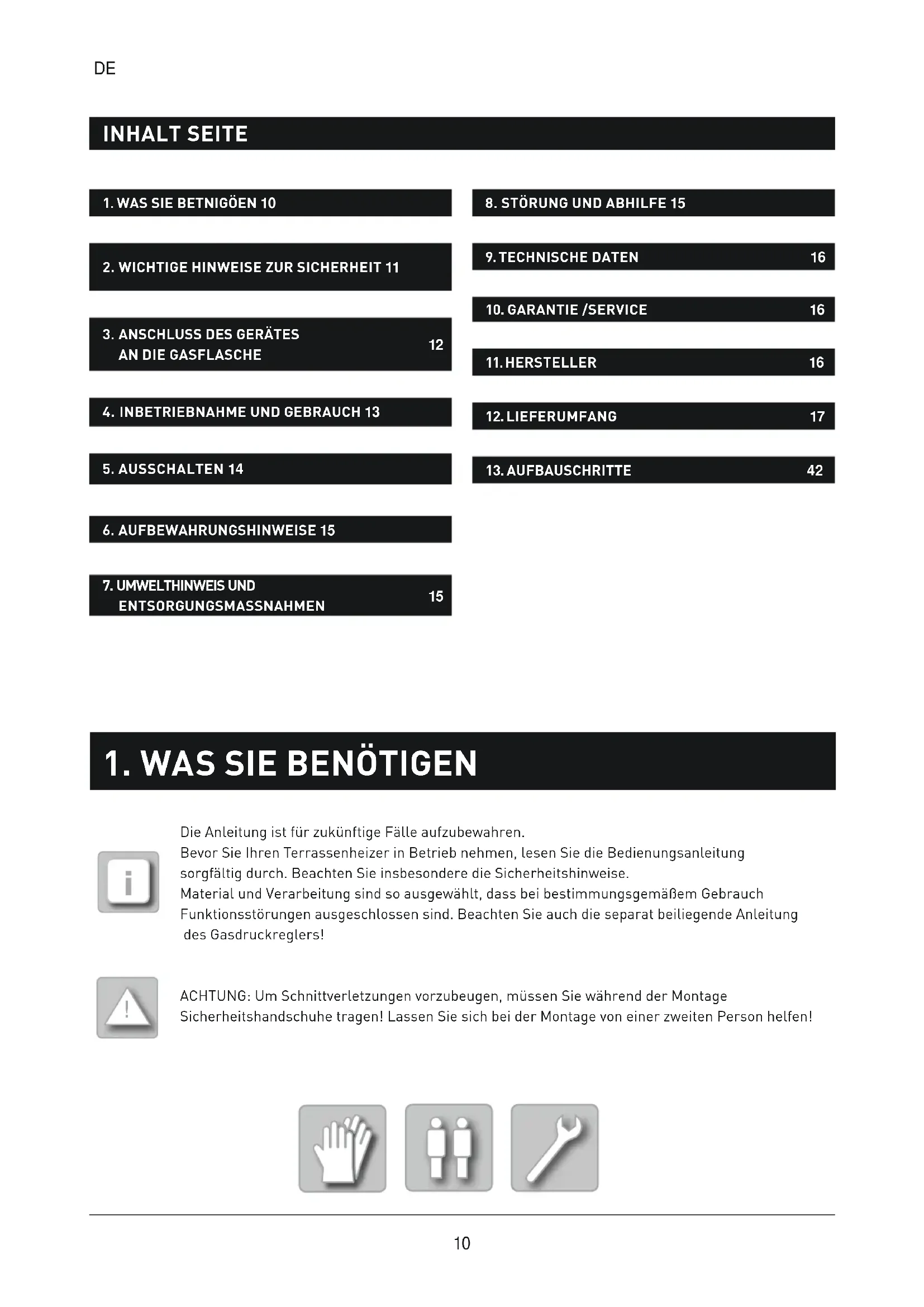 Die Anleitung ist für zukünftige Fälle aufzubewahren. Bevor Sie Ihren Terrassenheizer in Betrieb nehmen, lesen Sie die Bedienungsanleitung sorgfältig durch. Beachten Sie insbesondere die Sicherheitshinweise. Material und Verarbeitung sind so ausgewählt, dass bei bestimmungsgemäßem Gebrauch Funktionsstörungen ausgeschlossen sind. Beachten Sie auch die separat beiliegende Anleitung des Gasdruckreglers! ACHTUNG: Um Schnittverletzungen vorzubeugen, müssen Sie während der Montage Sicherheitshandschuhe tragen! Lassen Sie sich bei der Montage von einer zweiten Person helfen! !11 POLO 2.0 Art.-Nr. 546023