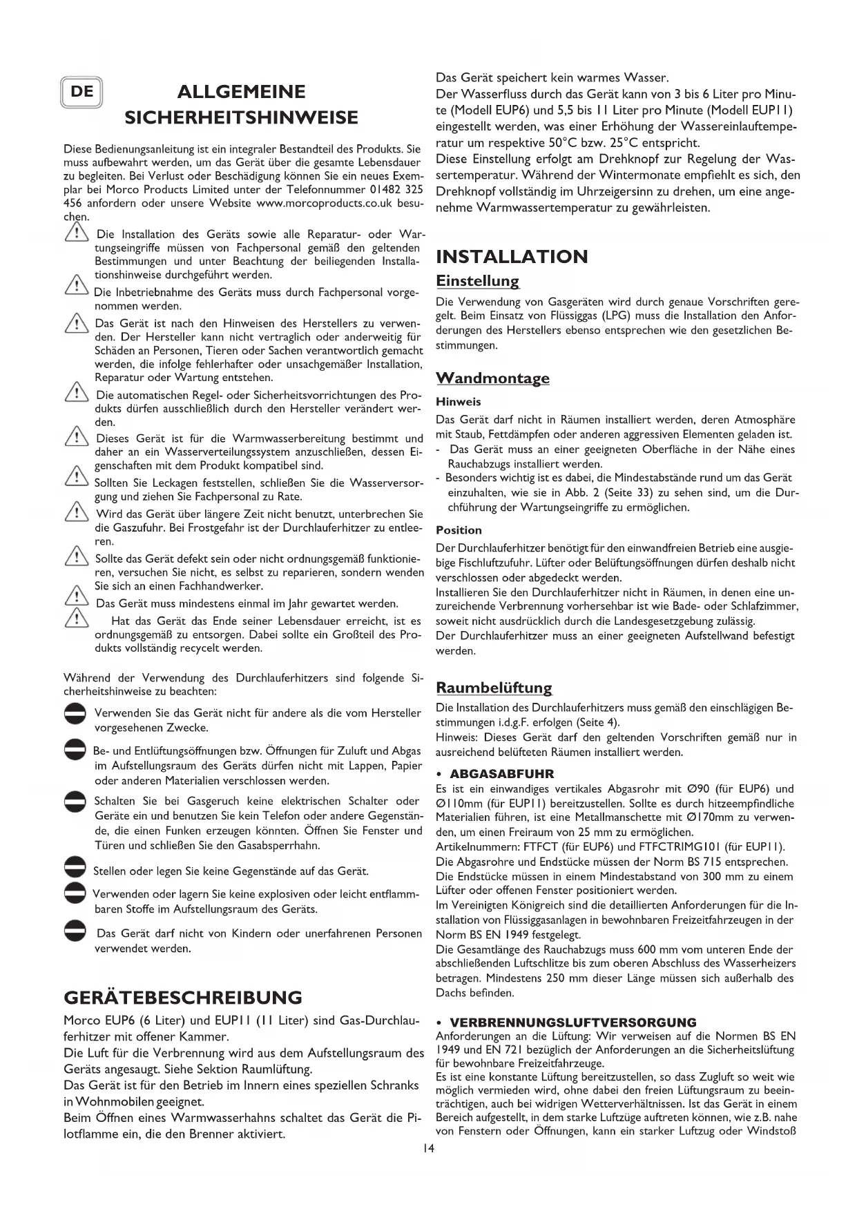- Ouvrir tous les robinets de vidange Cette procédure ne garantit pas que toute l’eau sortira du système. La plupart des maisons modernes sont équipées de doubles clapets anti-retour dans les robinets de douche TMV2 qui retiennent l’eau et arrêtent le ux d’eau au- tour du système une fois que les robinets de vidange sont ouverts. Il peut sembler que toute l’eau est sortie le système, mais attention ! Pour remédier à ce problème, il faut retirer les mitigeurs de la douche du système après avoir coupé l’alimentation en eau froide et ouvert les robinets de vidange. Le démontage de certains mitigeurs de douche nécessite l’utilisation d’outils spéciaux. En outre, la disposition des tuyaux peut provoquer des poches d’air qui laissent de l’eau à l’intérieur des composants du chauffe-eau ou dans le mélangeur de la douche. Pour rétablir le fonctionnement normal de la maison de vacances, procéder dans l’ordre inverse de ce a été décrit précédemment. Cette procédure peut être efcace, mais la seule façon d’en être sûr est de soufer l’eau à l’aide d’air comprimé à une pression maximale de 3 bars. GARANTIE Le chauffe-eau est garanti contre les défauts de fabrication pendant un an à compter de la date de la première mise en service. Cependant, la garan- tie est soumise à la preuve de la mise en service conformément à la loi de 1998 sur la sécurité du gaz (installation et utilisation). La garantie ne couvre pas les défauts causés par un manque d’entretien. La garantie de Morco Products Ltd. couvrira les pièces et la main d’œuvre si l’appareil a été installé en tant que partie de l’équipement d’origine dans une maison de vacances en caravane ou un véhicule de loisirs. Les appareils distribués en tant qu’équipements non originaux directement par Morco Products Ltd. ou par d’autres revendeurs sont soumis à une politique de retour à la base pour la réparation et le retour. Au lieu de renvoyer l’appareil, nous fourni- rons des pièces de rechange et des conseils sur la réparation des appareils défectueux, à condition que nous puissions parler au technicien compétent et agréé en matière de sécurité du gaz qui a participé à l’installation ou à la réparation de l’appareil défectueux. Dans le cadre de cette approche, aucune compensation ne sera offerte pour la main-d’œuvre nécessaire au démontage et au remontage de l’unité, ni pour la main-d’œuvre ou les déplacements liés à l’installation des pièces de rechange. Hors garantie : - Dégâts causés par le gel - Redimensionnement de l’échangeur de chaleur - Injecteurs veilleuses bloqués - Insectes ou débris dans le brûleur ou l’échangeur de chaleur - Filtres du gaz ou de l’eau obstrués - Dysfonctionnement causé par des mélangeurs ou des douches à main TMV2 endommagés. - Installation incorrecte de l’appareil ou du conduit de fumée. - Faible pression de l’eau Veuillez noter que la preuve de la mise en service aux ns de la présente garantie est une copie du certicat de mise en service rempli par un techni- cien agréé en sécurité du gaz ou une autre personne qualiée14 ALLGEMEINE SICHERHEITSHINWEISE Diese Bedienungsanleitung ist ein integraler Bestandteil des Produkts. Sie muss aufbewahrt werden, um das Gerät über die gesamte Lebensdauer zu begleiten. Bei Verlust oder Beschädigung können Sie ein neues Exem- plar bei Morco Products Limited unter der Telefonnummer 01482 325 456 anfordern oder unsere Website www.morcoproducts.co.uk besu- chen. Die Installation des Geräts sowie alle Reparatur- oder War- tungseingriffe müssen von Fachpersonal gemäß den geltenden Bestimmungen und unter Beachtung der beiliegenden Installa- tionshinweise durchgeführt werden. Die Inbetriebnahme des Geräts muss durch Fachpersonal vorge- nommen werden. Das Gerät ist nach den Hinweisen des Herstellers zu verwen- den. Der Hersteller kann nicht vertraglich oder anderweitig für Schäden an Personen, Tieren oder Sachen verantwortlich gemacht werden, die infolge fehlerhafter oder unsachgemäßer Installation, Reparatur oder Wartung entstehen. Die automatischen Regel- oder Sicherheitsvorrichtungen des Pro- dukts dürfen ausschließlich durch den Hersteller verändert wer- den. Dieses Gerät ist für die Warmwasserbereitung bestimmt und daher an ein Wasserverteilungssystem anzuschließen, dessen Ei- genschaften mit dem Produkt kompatibel sind. Sollten Sie Leckagen feststellen, schließen Sie die Wasserversor- gung und ziehen Sie Fachpersonal zu Rate. Wird das Gerät über längere Zeit nicht benutzt, unterbrechen Sie die Gaszufuhr. Bei Frostgefahr ist der Durchlauferhitzer zu entlee- ren. Sollte das Gerät defekt sein oder nicht ordnungsgemäß funktionie- ren, versuchen Sie nicht, es selbst zu reparieren, sondern wenden Sie sich an einen Fachhandwerker. Das Gerät muss mindestens einmal im Jahr gewartet werden. Hat das Gerät das Ende seiner Lebensdauer erreicht, ist es ordnungsgemäß zu entsorgen. Dabei sollte ein Großteil des Pro- dukts vollständig recycelt werden. Während der Verwendung des Durchlauferhitzers sind folgende Si- cherheitshinweise zu beachten: Verwenden Sie das Gerät nicht für andere als die vom Hersteller vorgesehenen Zwecke. Be- und Entlüftungsöffnungen bzw. Öffnungen für Zuluft und Abgas im Aufstellungsraum des Geräts dürfen nicht mit Lappen, Papier oder anderen Materialien verschlossen werden. Schalten Sie bei Gasgeruch keine elektrischen Schalter oder Geräte ein und benutzen Sie kein Telefon oder andere Gegenstän- de, die einen Funken erzeugen könnten. Öffnen Sie Fenster und Türen und schließen Sie den Gasabsperrhahn. Stellen oder legen Sie keine Gegenstände auf das Gerät. Verwenden oder lagern Sie keine explosiven oder leicht entamm- baren Stoffe im Aufstellungsraum des Geräts. Das Gerät darf nicht von Kindern oder unerfahrenen Personen verwendet werden. GERÄTEBESCHREIBUNG Morco EUP6 (6