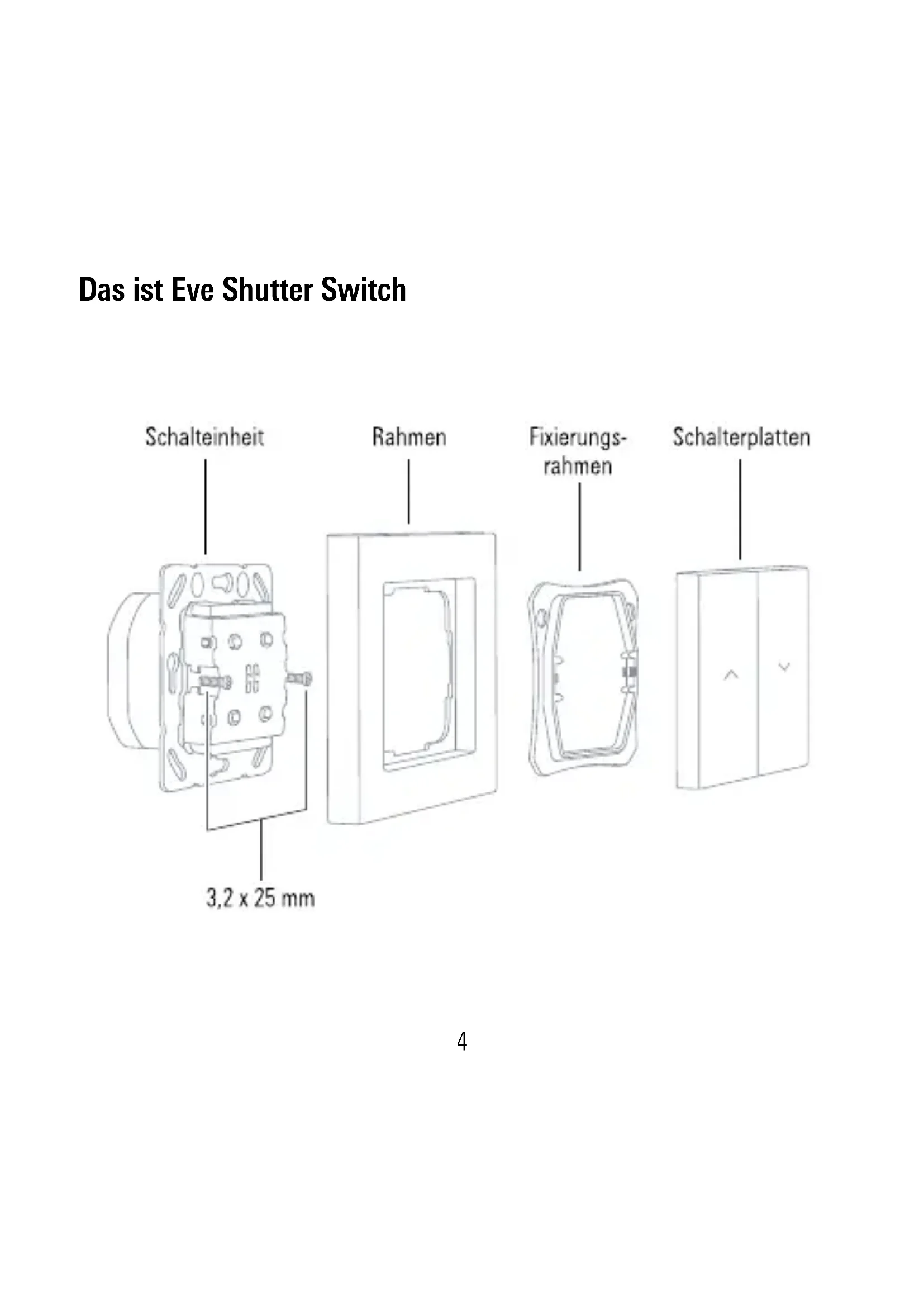 - Funkleistung: max. 12 dBm (EIRP)6 7 Erste Schritte Anschluss, Montage und Inbetriebnahme von Eve Shutter Switch dürfen nur durch eine autorisierte Elektrofachkraft erfolgen. Vor Installation ist die Anlage spannungs- frei zu schalten! Eve Shutter Switch dient dem direkten Schalten fest angeschlossener elektrischer Verbraucher mit einer Versorgungsspannung von 230 V~. Hierzu zählen insbesonde- re Antriebsmotoren für Rollläden, nicht jedoch elektrische Heizungen, Arbeitsma- schinen jeglicher Art und Steckdosen. Eve Shutter Switch wurde zum Einsatz im Haushalt und in ähnlichen ortsfesten Installationen entwickelt. Vor Installation ist die Eignung anhand der technischen Daten und der Einsatzbedingungen zu überprüfen. Eve Shutter Switch darf nicht eingesetzt werden in Verbindung mit lebenserhal- tenden Geräten oder mit Verbrauchern, die zu Gefahren für Leib oder Leben von Menschen und Tieren oder zu Gefahren für Sachwerte führen können. ACHTUNG – Gefahr eines Stromschlages!7 Installation - Vorbereitung Schalte die Sicherung des Stromkreises deiner Rollladensteuerung in deinem Siche- rungskasten ab. Stelle sicher, dass kein Strom fließt, indem du deinen bestehenden Rollladenschalter einige Male betätigst.8 9 Installation