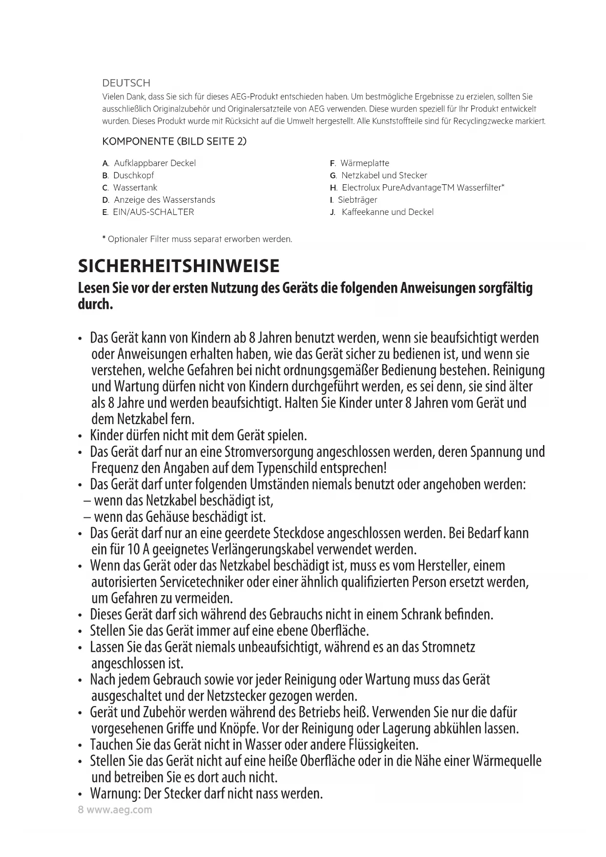 8 Schalten Sie das Gerät aus und ziehen Sie den Netzstecker aus der Steckdose. Wischen Sie alle Außen- ächen mit einem feuchten Tuch ab. Kaeekanne und Kannendeckel sind spülmaschinenfest. Verwenden Sie niemals ätzende oder scheuernde Reinigungsmittel und tauchen Sie das Gerät niemals in Flüssig-keiten ein!10 www.aeg.com 9 Zum Reinigen des Filterhalters heben Sie den Handgri an und entfernen Sie den Filterhalter. Um das Filterventil gründlich zu reinigen, drücken Sie mehrmals darauf, während es gespült wird. Der Filterhalter kann auch im Geschirrspüler gewaschen werden. ENTKALKEN 10 Wir empfehlen eine Entkalkung alle 3 Monate. Verwenden Sie nur ein umweltfreundliches Entkalkungs- mittel und befolgen Sie immer die Anweisungen des Herstellers. a. Füllen Sie zuerst den Wassertank mit Wasser und geben Sie dann den Entkalker hinzu (oder füllen Sie Wasser und Essig 1:1 ein). b. Die Kaeekanne mit Deckel auf die Warmhalteplatte setzen. c. EIN/AUS-Schalter drücken, um einen normalen Brühvorgang zur Entkalkung zu starten. d. Sobald es ein Tassenvolumen an Lösungsüssigkeit verbraucht hat, schalten Sie es manuell aus. e. Lassen Sie die restliche Lösungsüssigkeit 15 Minuten lang im Gerät stehen. f. Schritt c bis e 3–5 Mal wiederholen. g. Den Brühvorgang so lange laufen lassen, bis die Lösungsüssigkeit verbraucht ist. h. Vor dem Kaeekochen 2-3 Mal sauberes Wasser aufbrühen 11 Kaeekanne, Deckel und Filtereinsatz gründlich unter ießendem Wasser abspülen. Das Anti-Tropfventil beim Spülen mehrmals aktivieren. Viel Freude mit Ihrem neuen Produkt von AEG! ENTSORGUNG Recyceln Sie Materialien mit dem Symbol . Entsorgen Sie die Verpackung in den entsprechenden Behältern, um sie zu recyceln. Helfen Sie mit, Umwelt und Gesundheit zu schützen, und Abfälle von Elektro- und Elektronikgeräten zu recyceln. Entsorgen Sie Geräte mit dem Symbol nicht mit dem Hausmüll. Bringen Sie das Gerät zu Ihrer örtlichen Sammelstelle oder wenden Sie sich an Ihr Gemeindeamt. AEG behält sich das Recht vor, Produkte, Informationen und Spezikationen ohne Vorankündigung zu ändern.
