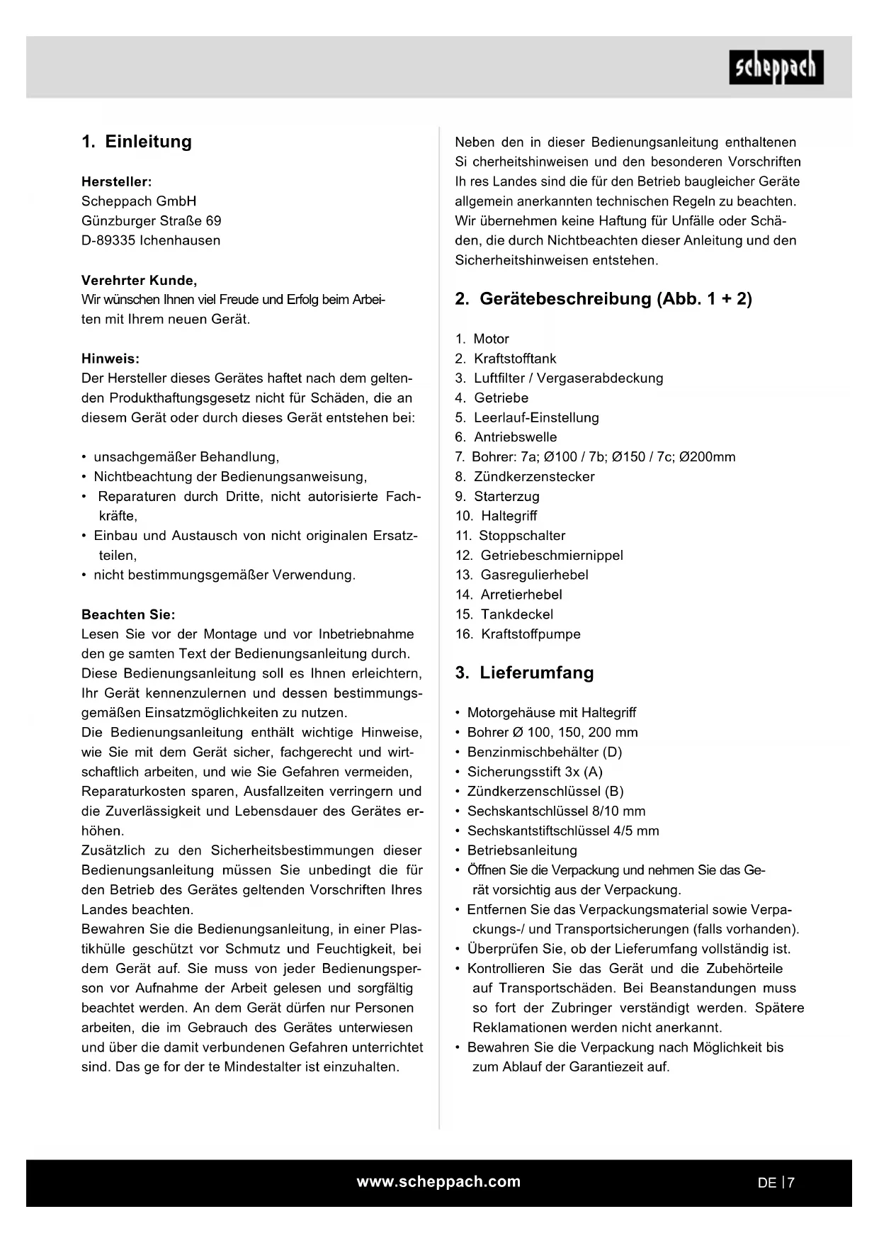 Hersteller: Scheppach GmbH Günzburger Straße 69 D-89335 Ichenhausen Verehrter Kunde, Wir wünschen Ihnen viel Freude und Erfolg beim Arbei- ten mit Ihrem neuen Gerät. Hinweis: Der Hersteller dieses Gerätes haftet nach dem gelten- den Produkthaftungsgesetz nicht für Schäden, die an diesem Gerät oder durch dieses Gerät entstehen bei: