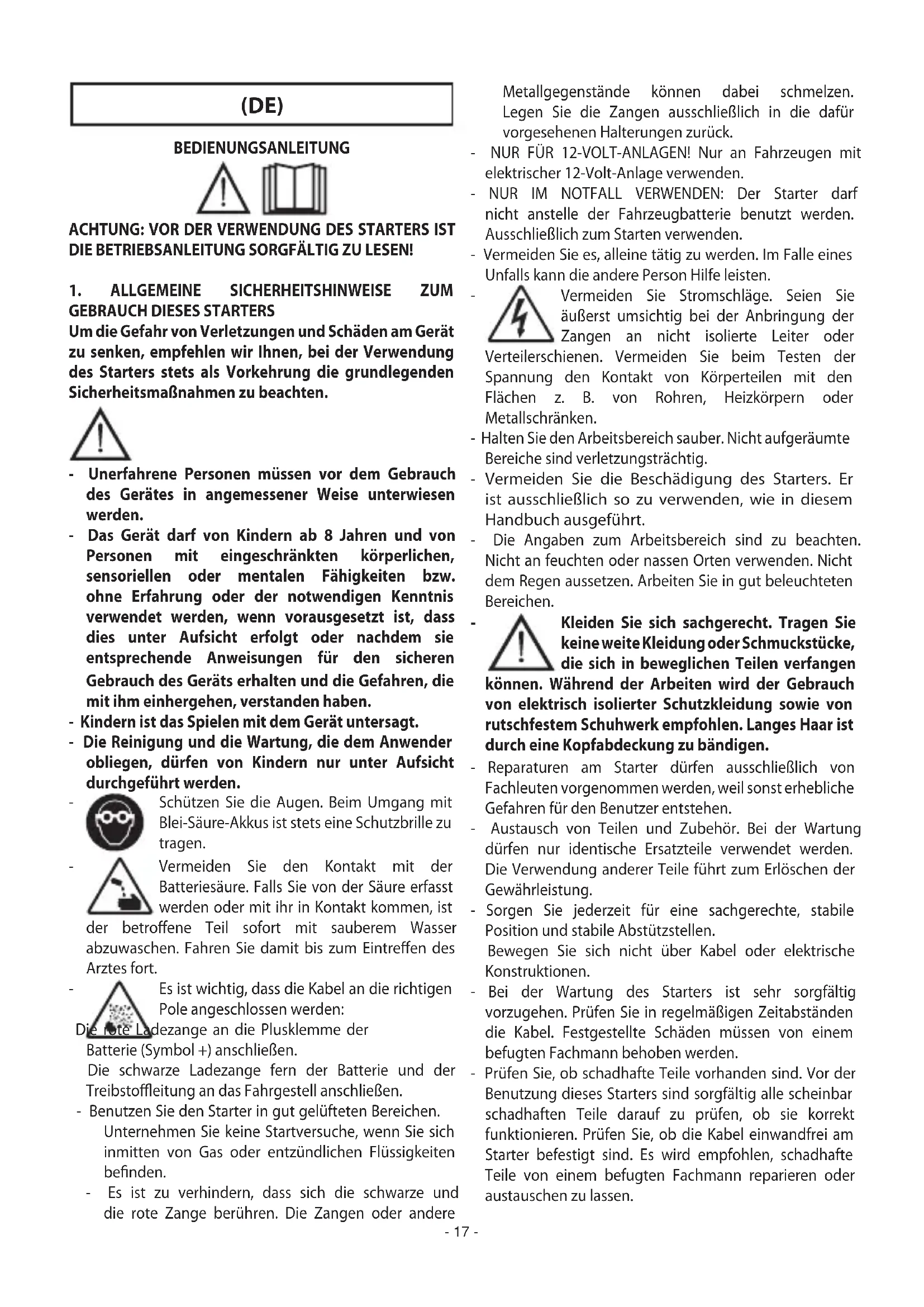 Kleiden Sie sich sachgerecht. Tragen Sie keine weite Kleidung oder Schmuckstücke, die sich in beweglichen Teilen verfangen können. Während der Arbeiten wird der Gebrauch von elektrisch isolierter Schutzkleidung sowie von rutschfestem Schuhwerk empfohlen. Langes Haar ist durch eine Kopfabdeckung zu bändigen. - Reparaturen am Starter dürfen ausschließlich von Fachleuten vorgenommen werden, weil sonst erhebliche Gefahren für den Benutzer entstehen. - Austausch von Teilen und Zubehör. Bei der Wartung dürfen nur identische Ersatzteile verwendet werden. Die Verwendung anderer Teile führt zum Erlöschen der Gewährleistung. - Sorgen Sie jederzeit für eine sachgerechte, stabile Position und stabile Abstützstellen. Bewegen Sie sich nicht über Kabel oder elektrische Konstruktionen. - Bei der Wartung des Starters ist sehr sorgfältig vorzugehen. Prüfen Sie in regelmäßigen Zeitabständen die Kabel. Festgestellte Schäden müssen von einem befugten Fachmann behoben werden. - Prüfen Sie, ob schadhafte Teile vorhanden sind. Vor der Benutzung dieses Starters sind sorgfältig alle scheinbar schadhaften Teile darauf zu prüfen, ob sie korrekt funktionieren. Prüfen Sie, ob die Kabel einwandfrei am Starter befestigt sind. Es wird empfohlen, schadhafte Teile von einem befugten Fachmann reparieren oder austauschen zu lassen.- 18 -