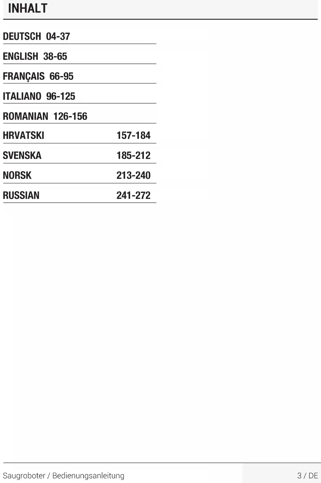 - Normalerweise werden beim Reinigen von harten Oberflächen niedrigere Ge- schwindigkeiten verwendet, während beim Reinigen von Teppichen hohe Geschwindigkeiten verwendet werden.12 / DE Saugroboter / Bedienungsanleitung 2 Boxinhalt DE - EN - FR - IT - RO - HR - SV - NO - RUUser Manual Robot Vacuum Cleaner