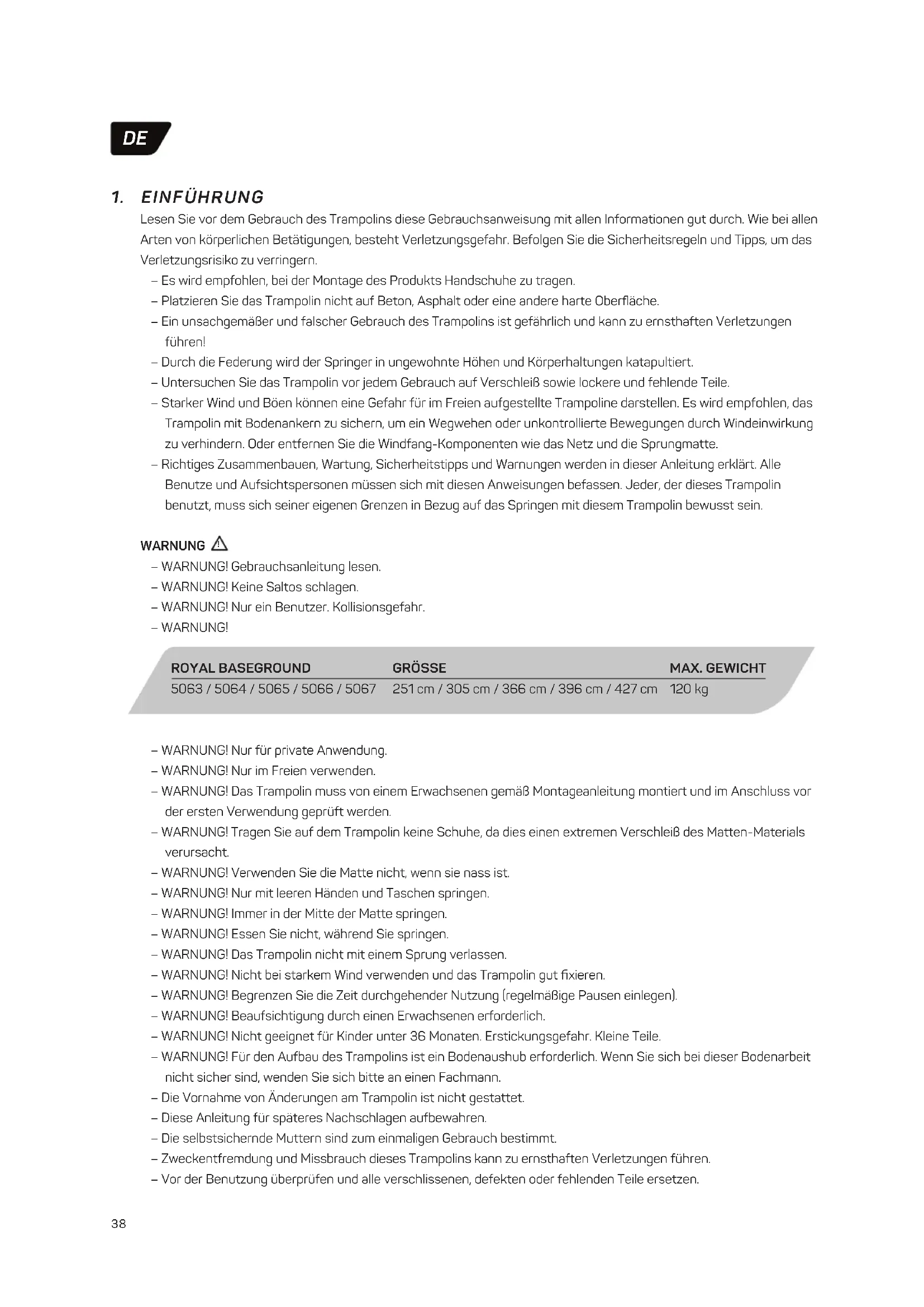 – WARNUNG! Nur für private Anwendung. – WARNUNG! Nur im Freien verwenden. – WARNUNG! Das Trampolin muss von einem Erwachsenen gemäß Montageanleitung montiert und im Anschluss vor der ersten Verwendung geprüft werden. – WARNUNG! Tragen Sie auf dem Trampolin keine Schuhe, da dies einen extremen Verschleiß des Matten-Materials verursacht. – WARNUNG! Verwenden Sie die Matte nicht, wenn sie nass ist. – WARNUNG! Nur mit leeren Händen und Taschen springen. – WARNUNG! Immer in der Mitte der Matte springen. – WARNUNG! Essen Sie nicht, während Sie springen. – WARNUNG! Das Trampolin nicht mit einem Sprung verlassen. – WARNUNG! Nicht bei starkem Wind verwenden und das Trampolin gut fixieren. – WARNUNG! Begrenzen Sie die Zeit durchgehender Nutzung (regelmäßige Pausen einlegen). – WARNUNG! Beaufsichtigung durch einen Erwachsenen erforderlich. – WARNUNG! Nicht geeignet für Kinder unter 36 Monaten. Erstickungsgefahr. Kleine Teile. – WARNUNG! Für den Aufbau des Trampolins ist ein Bodenaushub erforderlich. Wenn Sie sich bei dieser Bodenarbeit nicht sicher sind, wenden Sie sich bitte an einen Fachmann. – Die Vornahme von Änderungen am Trampolin ist nicht gestattet. – Diese Anleitung für späteres Nachschlagen aufbewahren. – Die selbstsichernde Muttern sind zum einmaligen Gebrauch bestimmt. – Zweckentfremdung und Missbrauch dieses Trampolins kann zu ernsthaften Verletzungen führen. – Vor der Benutzung überprüfen und alle verschlissenen, defekten oder fehlenden Teile ersetzen. ROYAL BASEGROUND 5063 / 5064 / 5065 / 5066 / 5067 GRÖSSE 251 cm / 305 cm / 366 cm / 396 cm / 427 cm MAX. GEWICHT 120 kg