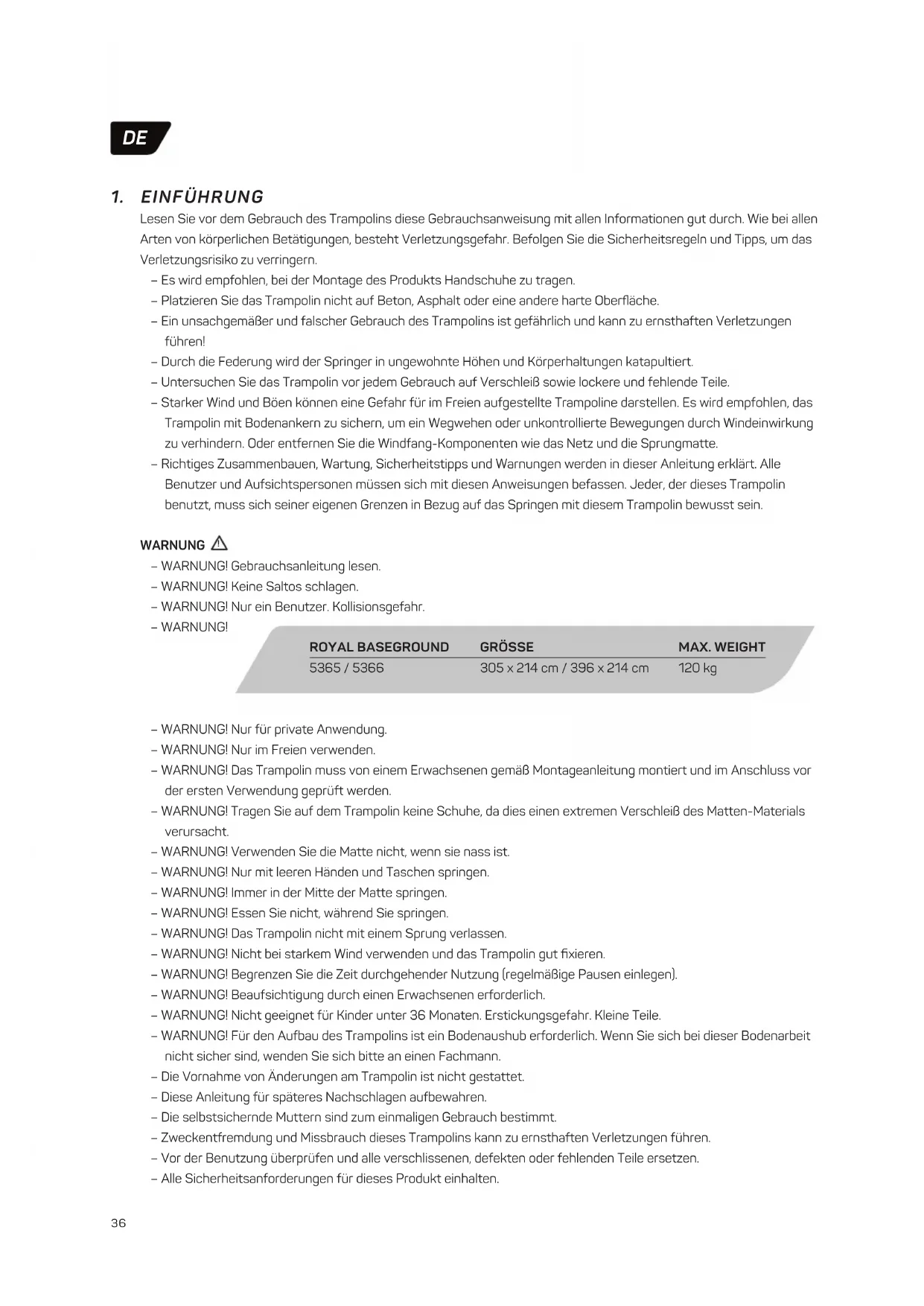 DE43 Situationen mit wind Im Fall von extreme Wettersituationen kann es passieren, dass der Trampolin wegweht. Wenn sich heftige Wetterumstände vortun, dann soll der Trampolin auf eine andere Stelle hingestellt werden oder in Einzelteile zerlegt werden. Transport des trampolins Sollte ein Transport des Trampolins nötig sein, sollten daran mindestens zwei Personen benötigt sein. Beim Transport sollte das Trampolin leicht vom Boden gehoben und horizontal gehalten werden. Für jede andere Transportart, sollte das Trampolin auseinandergebaut werden. DE44 ROYAL BASEGROUND 5365 / 5366 DIMENSION 305 x 214 cm / 396 x 244 cm POIDS MAXIMAL 120 kg