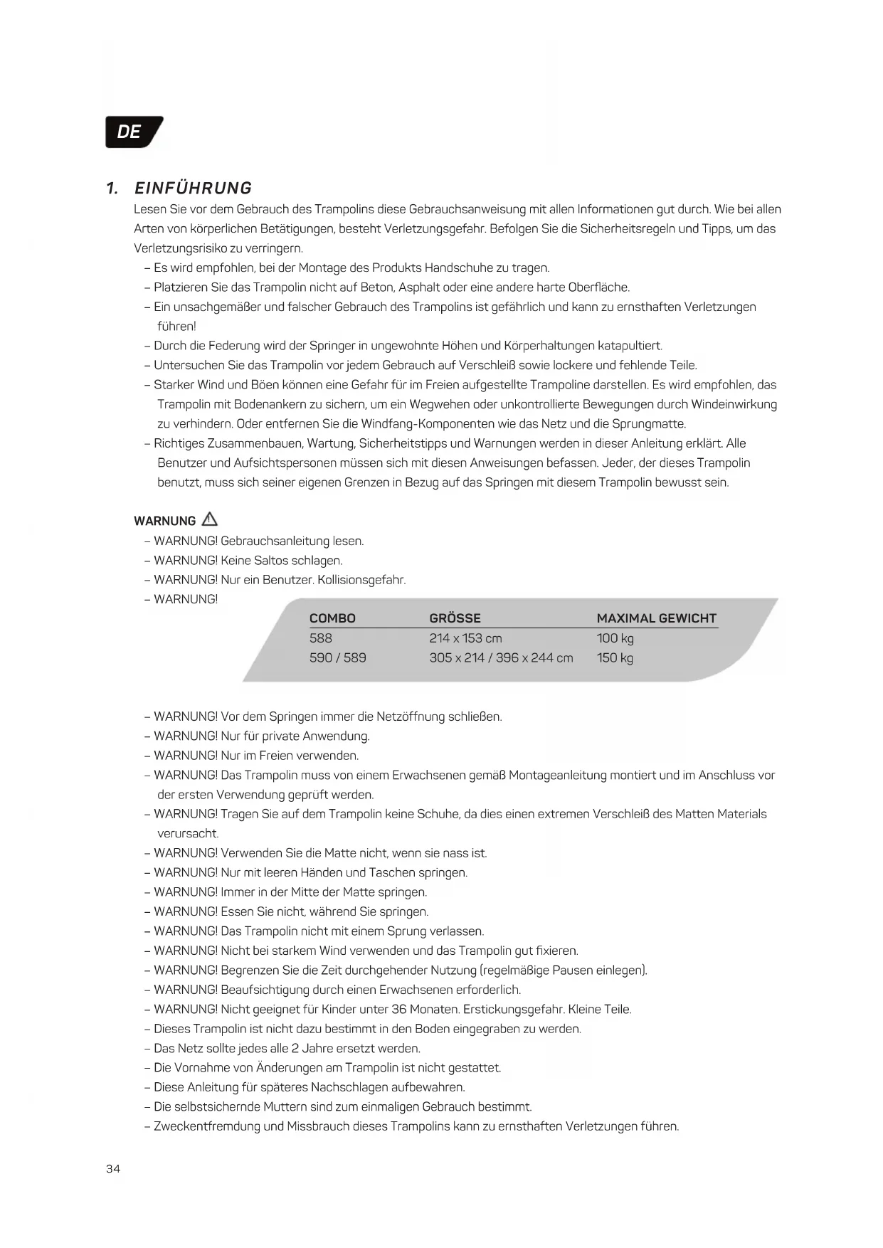 – WARNUNG! Vor dem Springen immer die Netzöffnung schließen. – WARNUNG! Nur für private Anwendung. – WARNUNG! Nur im Freien verwenden. – WARNUNG! Das Trampolin muss von einem Erwachsenen gemäß Montageanleitung montiert und im Anschluss vor der ersten Verwendung geprüft werden. – WARNUNG! Tragen Sie auf dem Trampolin keine Schuhe, da dies einen extremen Verschleiß des Matten Materials verursacht. – WARNUNG! Verwenden Sie die Matte nicht, wenn sie nass ist. – WARNUNG! Nur mit leeren Händen und Taschen springen. – WARNUNG! Immer in der Mitte der Matte springen. – WARNUNG! Essen Sie nicht, während Sie springen. – WARNUNG! Das Trampolin nicht mit einem Sprung verlassen. – WARNUNG! Nicht bei starkem Wind verwenden und das Trampolin gut fixieren. – WARNUNG! Begrenzen Sie die Zeit durchgehender Nutzung (regelmäßige Pausen einlegen). – WARNUNG! Beaufsichtigung durch einen Erwachsenen erforderlich. – WARNUNG! Nicht geeignet für Kinder unter 36 Monaten. Erstickungsgefahr. Kleine Teile. – Dieses Trampolin ist nicht dazu bestimmt in den Boden eingegraben zu werden. – Das Netz sollte jedes alle 2 Jahre ersetzt werden. – Die Vornahme von Änderungen am Trampolin ist nicht gestattet. – Diese Anleitung für späteres Nachschlagen aufbewahren. – Die selbstsichernde Muttern sind zum einmaligen Gebrauch bestimmt. – Zweckentfremdung und Missbrauch dieses Trampolins kann zu ernsthaften Verletzungen führen. COMBO