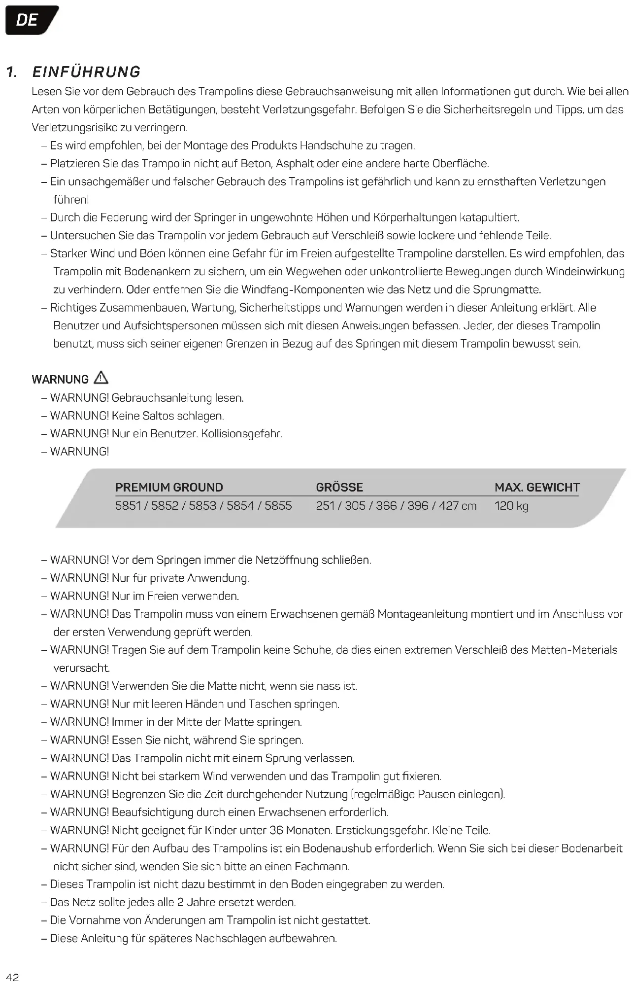 – WARNUNG! Vor dem Springen immer die Netzöffnung schließen. – WARNUNG! Nur für private Anwendung. – WARNUNG! Nur im Freien verwenden. – WARNUNG! Das Trampolin muss von einem Erwachsenen gemäß Montageanleitung montiert und im Anschluss vor der ersten Verwendung geprüft werden. – WARNUNG! Tragen Sie auf dem Trampolin keine Schuhe, da dies einen extremen Verschleiß des Matten-Materials verursacht. – WARNUNG! Verwenden Sie die Matte nicht, wenn sie nass ist. – WARNUNG! Nur mit leeren Händen und Taschen springen. – WARNUNG! Immer in der Mitte der Matte springen. – WARNUNG! Essen Sie nicht, während Sie springen. – WARNUNG! Das Trampolin nicht mit einem Sprung verlassen. – WARNUNG! Nicht bei starkem Wind verwenden und das Trampolin gut fixieren. – WARNUNG! Begrenzen Sie die Zeit durchgehender Nutzung (regelmäßige Pausen einlegen). – WARNUNG! Beaufsichtigung durch einen Erwachsenen erforderlich. – WARNUNG! Nicht geeignet für Kinder unter 36 Monaten. Erstickungsgefahr. Kleine Teile. – WARNUNG! Für den Aufbau des Trampolins ist ein Bodenaushub erforderlich. Wenn Sie sich bei dieser Bodenarbeit nicht sicher sind, wenden Sie sich bitte an einen Fachmann. – Dieses Trampolin ist nicht dazu bestimmt in den Boden eingegraben zu werden. – Das Netz sollte jedes alle 2 Jahre ersetzt werden. – Die Vornahme von Änderungen am Trampolin ist nicht gestattet. – Diese Anleitung für späteres Nachschlagen aufbewahren.