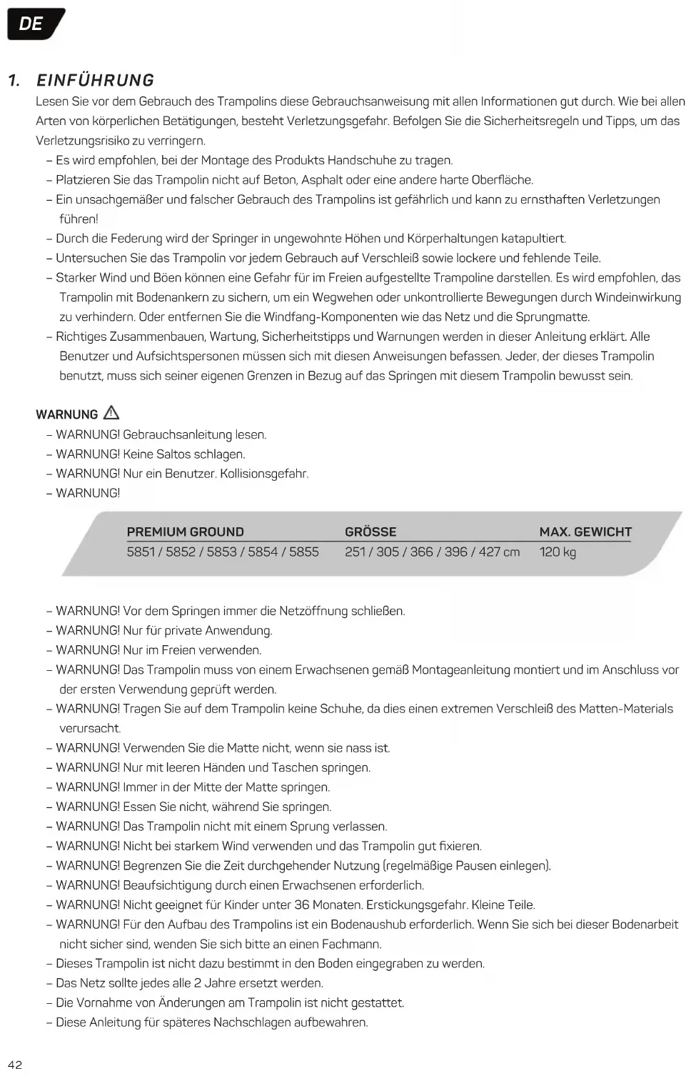 – WARNUNG! Vor dem Springen immer die Netzöffnung schließen. – WARNUNG! Nur für private Anwendung. – WARNUNG! Nur im Freien verwenden. – WARNUNG! Das Trampolin muss von einem Erwachsenen gemäß Montageanleitung montiert und im Anschluss vor der ersten Verwendung geprüft werden. – WARNUNG! Tragen Sie auf dem Trampolin keine Schuhe, da dies einen extremen Verschleiß des Matten-Materials verursacht. – WARNUNG! Verwenden Sie die Matte nicht, wenn sie nass ist. – WARNUNG! Nur mit leeren Händen und Taschen springen. – WARNUNG! Immer in der Mitte der Matte springen. – WARNUNG! Essen Sie nicht, während Sie springen. – WARNUNG! Das Trampolin nicht mit einem Sprung verlassen. – WARNUNG! Nicht bei starkem Wind verwenden und das Trampolin gut fixieren. – WARNUNG! Begrenzen Sie die Zeit durchgehender Nutzung (regelmäßige Pausen einlegen). – WARNUNG! Beaufsichtigung durch einen Erwachsenen erforderlich. – WARNUNG! Nicht geeignet für Kinder unter 36 Monaten. Erstickungsgefahr. Kleine Teile. – WARNUNG! Für den Aufbau des Trampolins ist ein Bodenaushub erforderlich. Wenn Sie sich bei dieser Bodenarbeit nicht sicher sind, wenden Sie sich bitte an einen Fachmann. – Dieses Trampolin ist nicht dazu bestimmt in den Boden eingegraben zu werden. – Das Netz sollte jedes alle 2 Jahre ersetzt werden. – Die Vornahme von Änderungen am Trampolin ist nicht gestattet. – Diese Anleitung für späteres Nachschlagen aufbewahren.