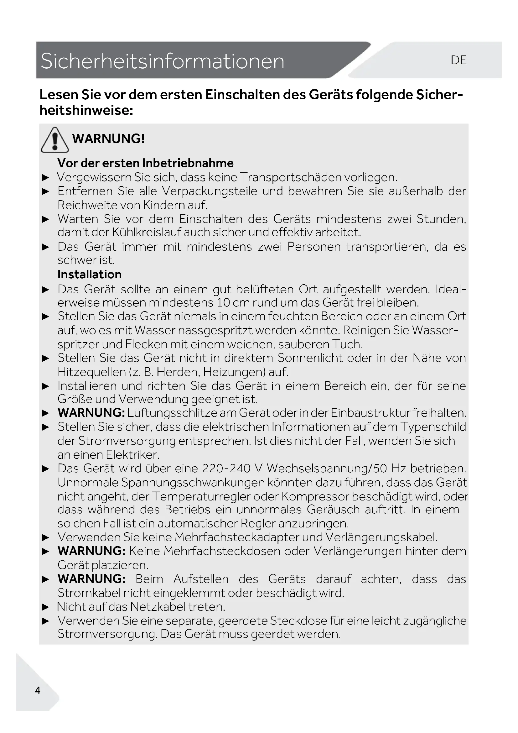 Sicherheitsinfo rmati onen Lesen Sie vor dem ersten Einschalten des Geräts folgende Sicher- heitshinweise: WARNUNG! Vor der ersten Inbetriebnahme ► Vergewissern Sie sich, dass keine Transportschäden vorliegen. ► Entfernen Sie alle Verpackungsteile und bewahren Sie sie außerhalb der Reichweite von Kindern auf. ► Warten Sie vor dem Einschalten des Geräts mindestens zwei Stunden, damit der Kühlkreislauf auch sicher und effektiv arbeitet. ► Das Gerät immer mit mindestens zwei Personen transportieren, da es schwer ist. Installation ► Das Gerät sollte an einem gut belüfteten Ort aufgestellt werden. Ideal- erweise müssen mindestens 10 cm rund um das Gerät frei bleiben. ► Stellen Sie das Gerät niemals in einem feuchten Bereich oder an einem Ort auf, wo es mit Wasser nassgespritzt werden könnte. Reinigen Sie Wasser- spritzer und Flecken mit einem weichen, sauberen Tuch. ► Stellen Sie das Gerät nicht in direktem Sonnenlicht oder in der Nähe von Hitzequellen (z. B. Herden, Heizungen) auf. ► Installieren und richten Sie das Gerät in einem Bereich ein, der für seine Größe und Verwendung geeignet ist. ► WARNUNG: Lüftungsschlitze am Gerät oder in der Einbaustruktur freihalten. ► Stellen Sie sicher, dass die elektrischen Informationen auf dem Typenschild der Stromversorgung entsprechen. Ist dies nicht der Fall, wenden Sie sich an einen Elektriker. ► Das Gerät wird über eine 220-240 V Wechselspannung/50 Hz betrieben. Unnormale Spannungsschwankungen könnten dazu führen, dass das Gerät nicht angeht, der Temperaturregler oder Kompressor beschädigt wird, oder dass während des Betriebs ein unnormales Geräusch auftritt. In einem solchen Fall ist ein automatischer Regler anzubringen. ► Verwenden Sie keine Mehrfachsteckadapter und Verlängerungskabel. ► WARNUNG: Keine Mehrfachsteckdosen oder Verlängerungen hinter dem Gerät platzieren. ► WARNUNG: Beim Aufstellen des Geräts darauf achten, dass das Stromkabel nicht eingeklemmt oder beschädigt wird. ► Nicht auf das Netzkabel treten. ► Verwenden Sie eine separate, geerdete Steckdose für eine leicht zugängliche Stromversorgung. Das Gerät muss geerdet werden.5