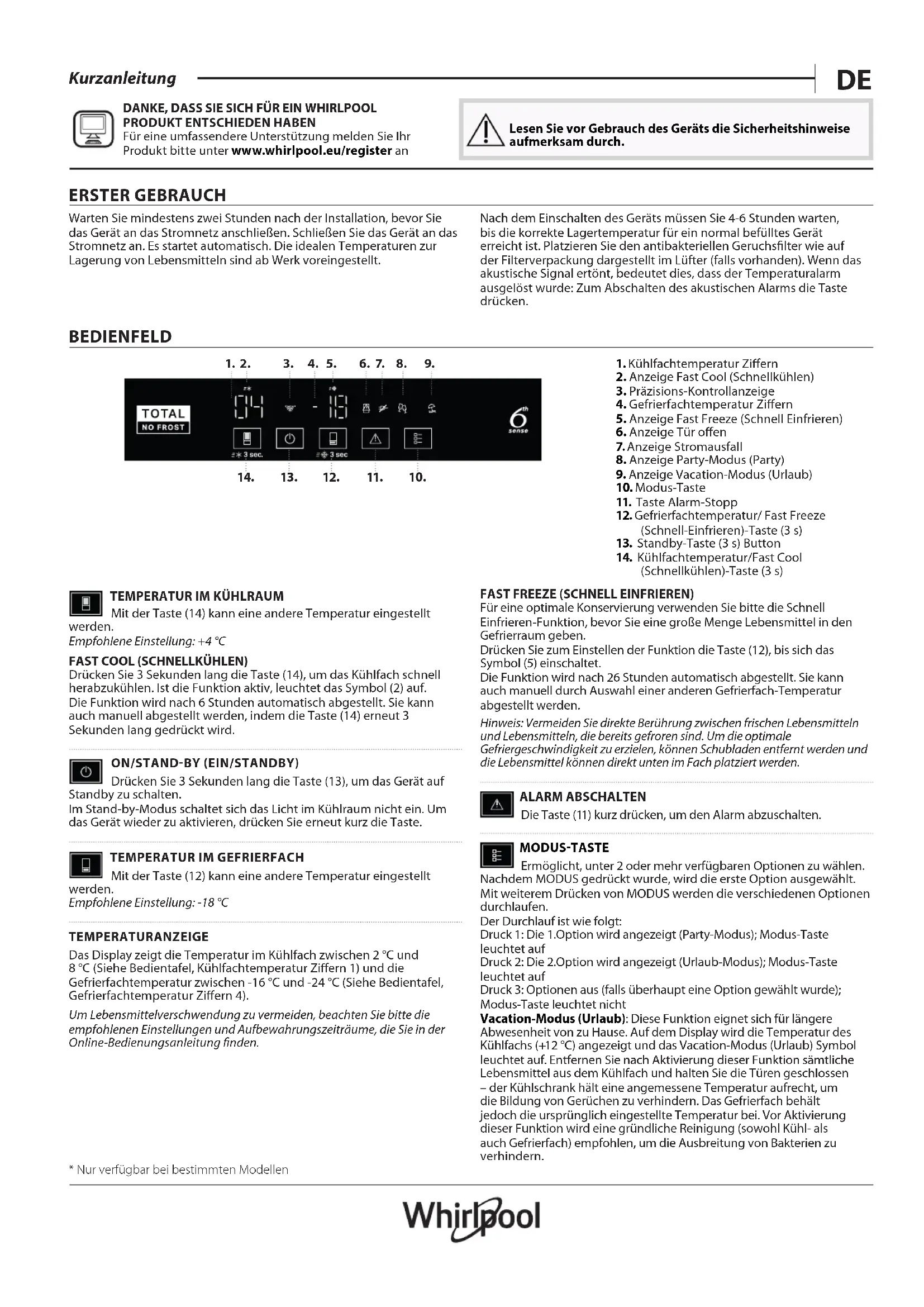 Für eine umfassendere Unterstützung melden Sie Ihr Produkt bitte unter www.whirlpool.eu/register an Lesen Sie vor Gebrauch des Geräts die Sicherheitshinweise aufmerksam durch. ERSTER GEBRAUCH Warten Sie mindestens zwei Stunden nach der Installation, bevor Sie das Gerät an das Stromnetz anschließen. Schließen Sie das Gerät an das Stromnetz an. Es startet automatisch. Die idealen Temperaturen zur Lagerung von Lebensmitteln sind ab Werk voreingestellt. Nach dem Einschalten des Geräts müssen Sie 4-6 Stunden warten, bis die korrekte Lagertemperatur für ein normal befülltes Gerät erreicht ist. Platzieren Sie den antibakteriellen Geruchsfilter wie auf der Filterverpackung dargestellt im Lüfter (falls vorhanden). Wenn das akustische Signal ertönt, bedeutet dies, dass der Temperaturalarm ausgelöst wurde: Zum Abschalten des akustischen Alarms die Taste drücken. BEDIENFELD