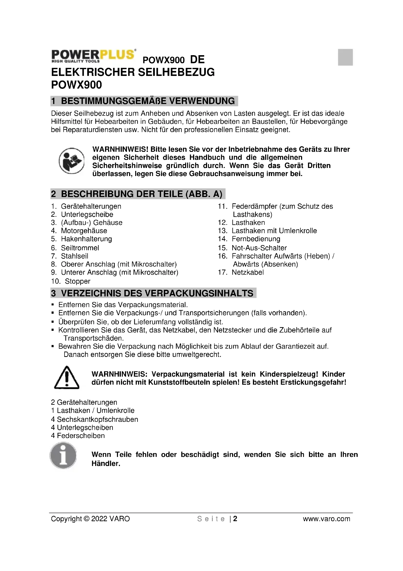 - Bewahren Sie die Verpackung nach Möglichkeit bis zum Ablauf der Garantiezeit auf. Danach entsorgen Sie diese bitte umweltgerecht. WARNHINWEIS: Verpackungsmaterial ist kein Kinderspielzeug! Kinder dürfen nicht mit Kunststoffbeuteln spielen! Es besteht Erstickungsgefahr! 2 Gerätehalterungen 1 Lasthaken / Umlenkrolle 4 Sechskantkopfschrauben 4 Unterlegscheiben 4 Federscheiben Wenn Teile fehlen oder beschädigt sind, wenden Sie sich bitte an Ihren Händler.POWX900 DE Copyright © 2022 VARO S e i t e | 3 www.varo.com