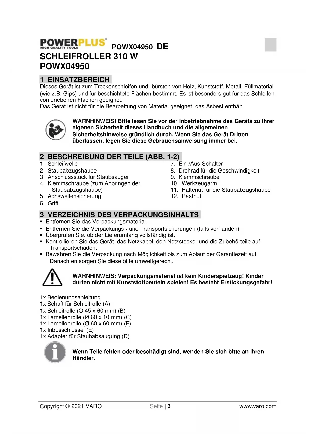 Entfernen Sie das Verpackungsmaterial. Entfernen Sie die Verpackungs-/ und Transportsicherungen (falls vorhanden). Überprüfen Sie, ob der Lieferumfang vollständig ist. Kontrollieren Sie das Gerät, das Netzkabel, den Netzstecker und die Zubehörteile auf Transportschäden. Bewahren Sie die Verpackung nach Möglichkeit bis zum Ablauf der Garantiezeit auf. Danach entsorgen Sie diese bitte umweltgerecht. WARNHINWEIS: Verpackungsmaterial ist kein Kinderspielzeug! Kinder dürfen nicht mit Kunststoffbeuteln spielen! Es besteht Erstickungsgefahr! 1x Bedienungsanleitung 1x Schaft für Schleifrolle (A) 1x Schleifrolle (Ø 45 x 60 mm) (B) 1x Lamellenrolle (Ø 60 x 10 mm) (C) 1x Lamellenrolle (Ø 60 x 60 mm) (F) 1x Inbusschlüssel (E) 1x Adapter für Staubabsaugung (D) Wenn Teile fehlen oder beschädigt sind, wenden Sie sich bitte an Ihren Händler.POWX04950 DE Copyright © 2021 VARO Seite | 4 www.varo.com