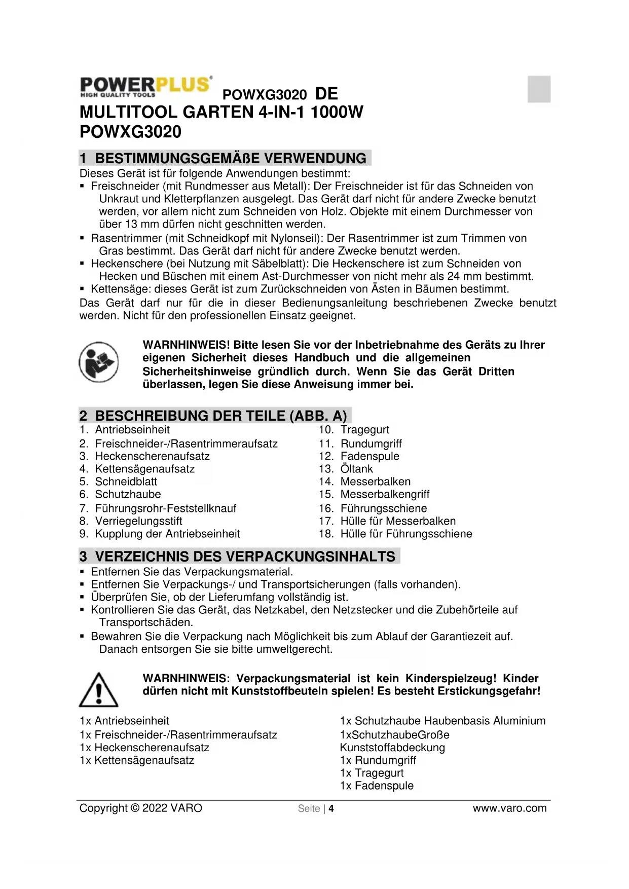 - Bewahren Sie die Verpackung nach Möglichkeit bis zum Ablauf der Garantiezeit auf. Danach entsorgen Sie sie bitte umweltgerecht. WARNHINWEIS: Verpackungsmaterial ist kein Kinderspielzeug! Kinder dürfen nicht mit Kunststoffbeuteln spielen! Es besteht Erstickungsgefahr! 1x Antriebseinheit 1x Freischneider-/Rasentrimmeraufsatz 1x Heckenscherenaufsatz 1x Kettensägenaufsatz 1x Schutzhaube Haubenbasis Aluminium 1xSchutzhaubeGroße Kunststoffabdeckung 1x Rundumgriff 1x Tragegurt 1x FadenspulePOWXG3020 DE Copyright © 2022 VARO Seite | 5 www.varo.com 1x Schneidblatt 1x Sechskantschlüsse l(im Rundgriff) 1x Kombischlüssel(in Kettenschwerthülle) 1x Spannstück 14 mm 1x Kette 8” 1x Kettenschwert 8” 1x Kettenschwerthülle 1x Schneidschwerthülle 1x Mutter 14mm 1x Schwarze Unterlegscheibe 1x Betriebsanleitung Wenn Teile fehlen oder beschädigt sind, wenden Sie sich bitte an Ihren Händler. 4 SYMBOLE In dieser Anleitung und/oder auf dem Gerät werden folgende Symbole verwendet:
