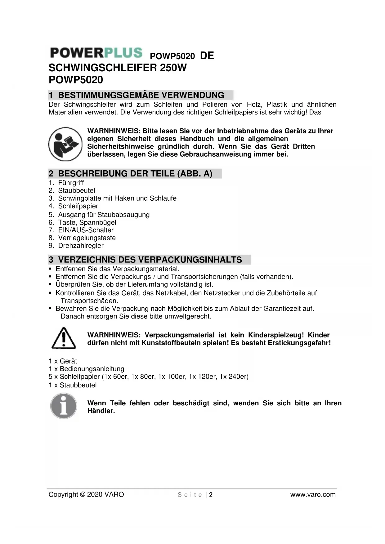 - Bewahren Sie die Verpackung nach Möglichkeit bis zum Ablauf der Garantiezeit auf. Danach entsorgen Sie diese bitte umweltgerecht. WARNHINWEIS: Verpackungsmaterial ist kein Kinderspielzeug! Kinder dürfen nicht mit Kunststoffbeuteln spielen! Es besteht Erstickungsgefahr! 1 x Gerät 1 x Bedienungsanleitung 5 x Schleifpapier (1x 60er, 1x 80er, 1x 100er, 1x 120er, 1x 240er) 1 x Staubbeutel Wenn Teile fehlen oder beschädigt sind, wenden Sie sich bitte an Ihren Händler.POWP5020 DE Copyright © 2020 VARO S e i t e | 3 www.varo.com