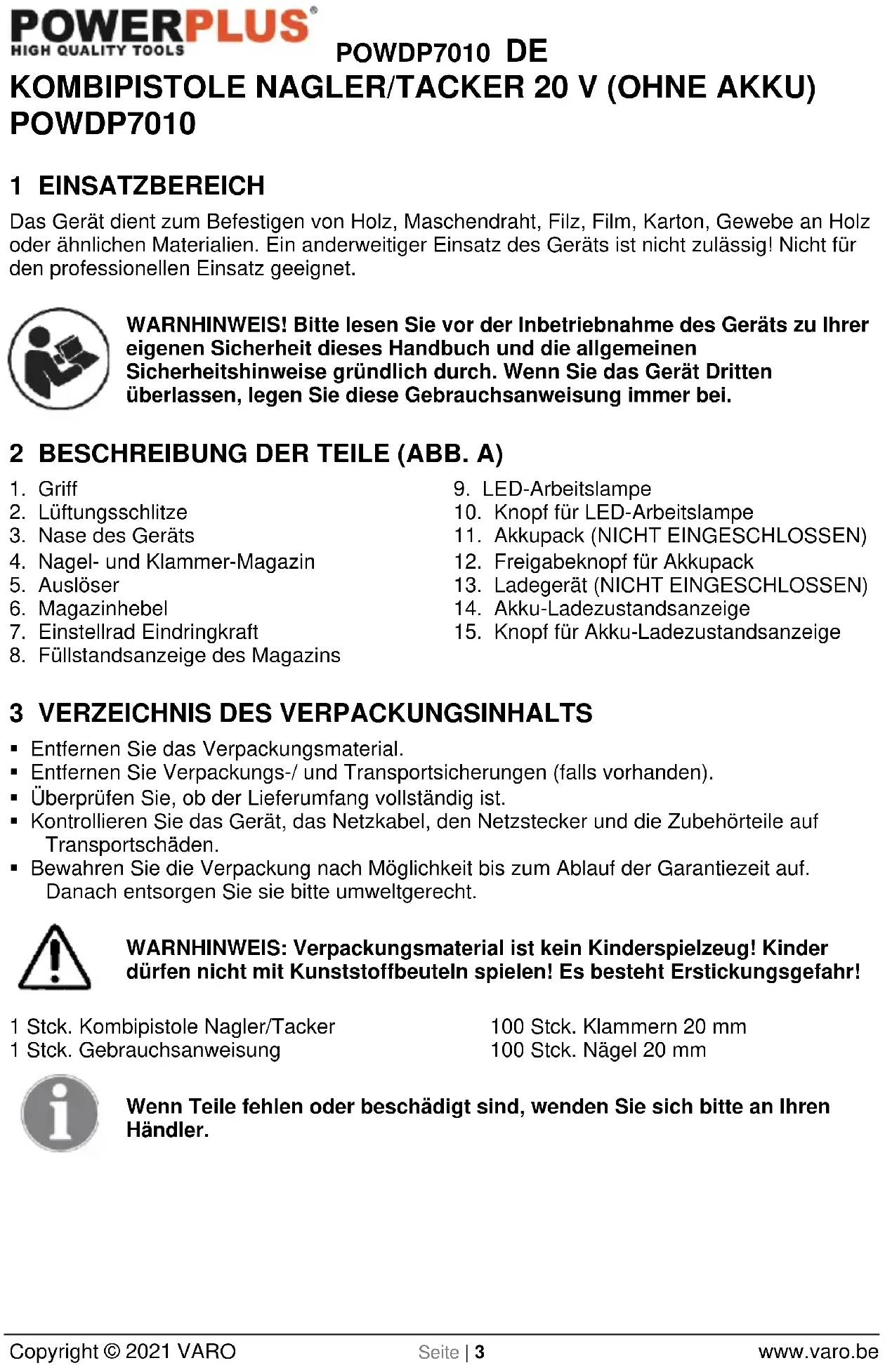 - Bewahren Sie die Verpackung nach Möglichkeit bis zum Ablauf der Garantiezeit auf. Danach entsorgen Sie sie bitte umweltgerecht. WARNHINWEIS: Verpackungsmaterial ist kein Kinderspielzeug! Kinder dürfen nicht mit Kunststoffbeuteln spielen! Es besteht Erstickungsgefahr! 1 Stck. Kombipistole Nagler/Tacker 1 Stck. Gebrauchsanweisung 100 Stck. Klammern 20 mm 100 Stck. Nägel 20 mm Wenn Teile fehlen oder beschädigt sind, wenden Sie sich bitte an Ihren Händler.POWDP7010 DE Copyright © 2021 VARO Seite | 4 www.varo.be