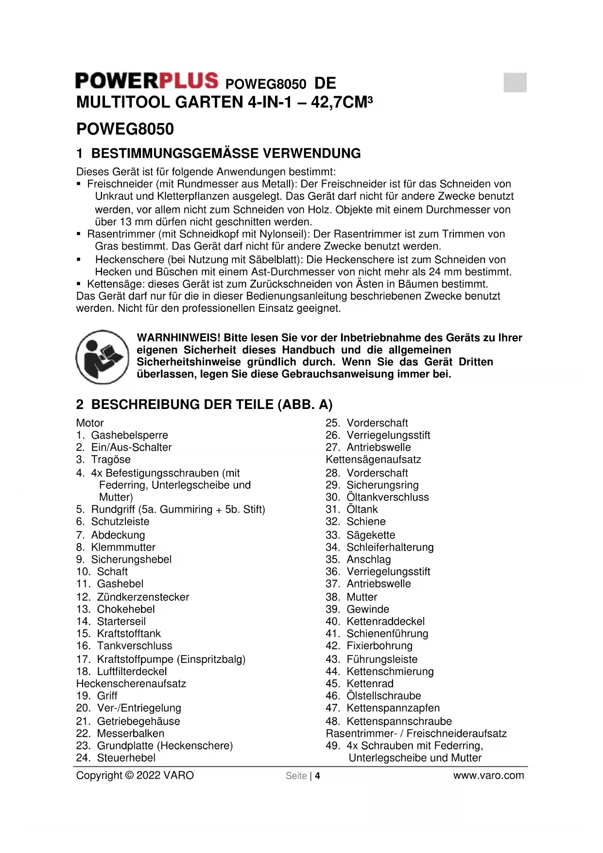 - Bewahren Sie unbenutzte Motorwerkzeuge außerhalb der Reichweite von Kindern auf. Lassen Sie Personen, die mit diesem Gerät nicht vertraut sind oder diese Anweisungen nicht gelesen haben, es nicht benutzen. Motorwerkzeuge sind gefährlich, wenn sie von unerfahrenen Personen benutzt werden.POWEG8050 DE Copyright © 2022 VARO Seite | 9 www.varo.com