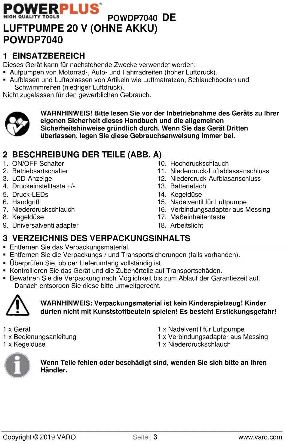 Copyright © 2019 VARO Seite | 3 www.varo.com LUFTPUMPE 20 V (OHNE AKKU) POWDP7040 1 EINSATZBEREICH Dieses Gerät kann für nachstehende Zwecke verwendet werden: