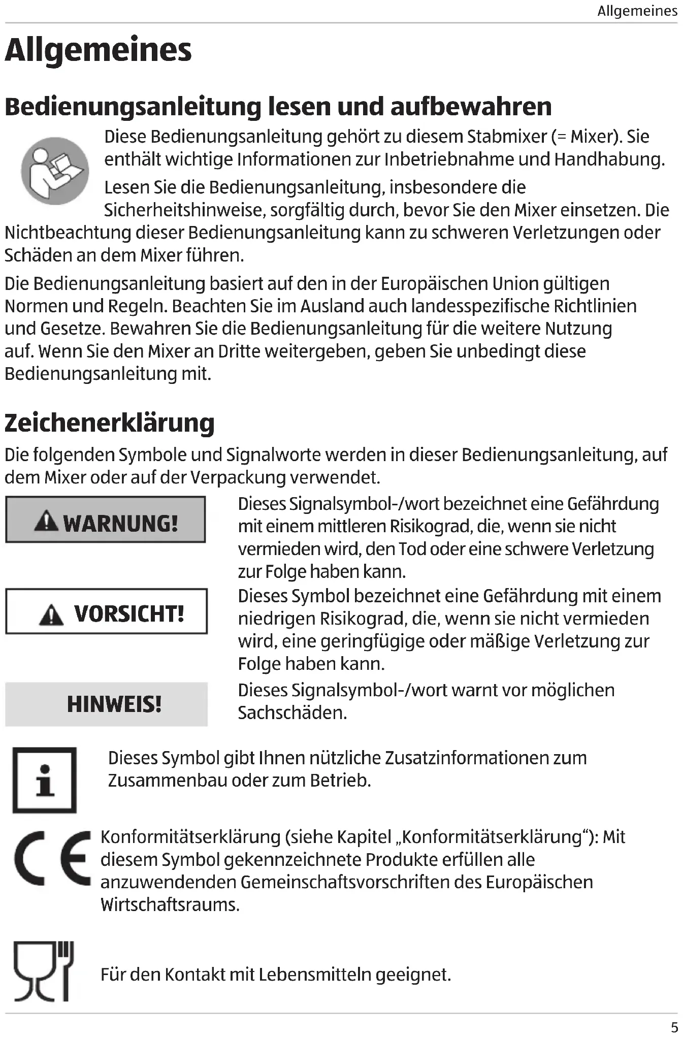 Allgemeines Bedienungsanleitung lesen und aufbewahren Diese Bedienungsanleitung gehört zu diesem Stabmixer (= Mixer). Sie enthält wichtige Informationen zur Inbetriebnahme und Handhabung. Lesen Sie die Bedienungsanleitung, insbesondere die Sicherheitshinweise, sorgfältig durch, bevor Sie den Mixer einsetzen. Die Nichtbeachtung dieser Bedienungsanleitung kann zu schweren Verletzungen oder Schäden an dem Mixer führen. Die Bedienungsanleitung basiert auf den in der Europäischen Union gültigen Normen und Regeln. Beachten Sie im Ausland auch landesspezifische Richtlinien und Gesetze. Bewahren Sie die Bedienungsanleitung für die weitere Nutzung auf. Wenn Sie den Mixer an Dritte weitergeben, geben Sie unbedingt diese Bedienungsanleitung mit. Zeichenerklärung Die folgenden Symbole und Signalworte werden in dieser Bedienungsanleitung, auf dem Mixer oder auf der Verpackung verwendet. WARNUNG! Dieses Signalsymbol-/wort bezeichnet eine Gefährdung mit einem mittleren Risikograd, die, wenn sie nicht vermieden wird, den Tod oder eine schwere Verletzung zur Folge haben kann. VORSICHT! Dieses Symbol bezeichnet eine Gefährdung mit einem niedrigen Risikograd, die, wenn sie nicht vermieden wird, eine geringfügige oder mäßige Verletzung zur Folge haben kann. HINWEIS! Dieses Signalsymbol-/wort warnt vor möglichen Sachschäden. Dieses Symbol gibt Ihnen nützliche Zusatzinformationen zum Zusammenbau oder zum Betrieb. Konformitätserklärung (siehe Kapitel „Konformitätserklärung“): Mit diesem Symbol gekennzeichnete Produkte erfüllen alle anzuwendenden Gemeinschaftsvorschriften des Europäischen Wirtschaftsraums. Für den Kontakt mit Lebensmitteln geeignet. Buch_CH_Japandi Stabmixer .indb 5Buch_CH_Japandi Stabmixer .indb 5 05.12.2022 11:55:3205.12.2022 11:55:32Sicherheit