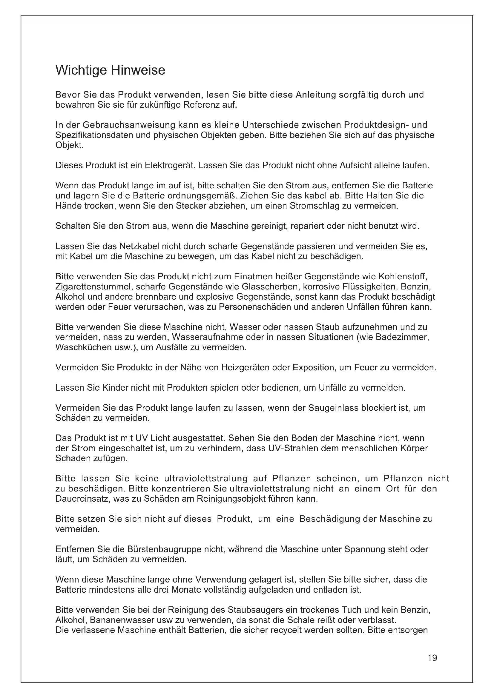 Luft Einlass Rollenbürste abdeckungRollenbüste-Baugruppe25 Hinweise: Wenn es einen anderen Fehler gibt, sind Spezialwerkzeuge erforderlich, müssen sie von Fachleuten des Herstellers seiner Wartungsabteilung oder einer ähnlichen Abteilung repariert werden. Fehlersuche Bitte überprüfen Sie die folgenden Punkte, bevor Sie die Reparaturabteilung beauftragen. Fehler Mögliche Gründen Lösungen Motor funktioniert nicht Batterie-Packet ist nicht installiert Installieren Sie die Batterie Batterie ist leer Produkt auaden Ein/Aus Schalter ist nicht gedrückt Ein/Aus Schalter drücken Weniger Saugkraft Einlass blockiert Einlass reinigen HEPA blockiert Staubbecher und HEPA reinigen Zyklon Blockiert Zyklon Reinigen UV-lampe funktioniert nicht Maschine-neigung verursacht,- dass der Ultraviolettschalter die Oberäche der Maschine verlässt Maschine-neigung überschreitet 30 Grad nicht UV Lampe defekt Kundendienst zu kontaktieren und UV Lampe zu wechseln Maschine funktioniert plötzlich nicht Staubecher voll Bitte hören Sie auf zu verwenden, bereinigen Sie die Blockade und setzen Sie sie zwei Stunden lang aus, bevor Sie sie verwenden Einlass der Machine blockiert HEPA blockiert Rollenbürste funktioniert plötzlich nicht mehr. Rollenbürste umwickelt Rollenbürste ausnehmen und wied- er installieren nach der Reinigung Belt ist locker oder gebrochen Kundendienst kontaktieren und Belt wechseln wenige Nutzungszeit nach dem Auaden Nicht voll aufgeladen Folgen Sie die Ladeanweisungen,um die Batterie voll zu laden Batteriealterung Die neue Batterie ersetzen26 Produktspezikationen Technische Parameter Modell Nr BD7 Pro Nennspannung 28.8V Nennleistung 250W Adaptereingang 100-240V~ 50-60Hz 0.8A Adapter Ausgangsleitung 34.2V 600mA Batterie-Kapazität 2000mAh Ladezeit 3-4h Schaltplan UV Lampe PCB Micro Schalter Ultraschall Anion Vakuummotor Erdungsbürstenmotor Ladegerät Lithium Battrie Lithium Battrie PCB Kontroll PCB Ein/Aus Schalter Staub Rohr Transfer PCB