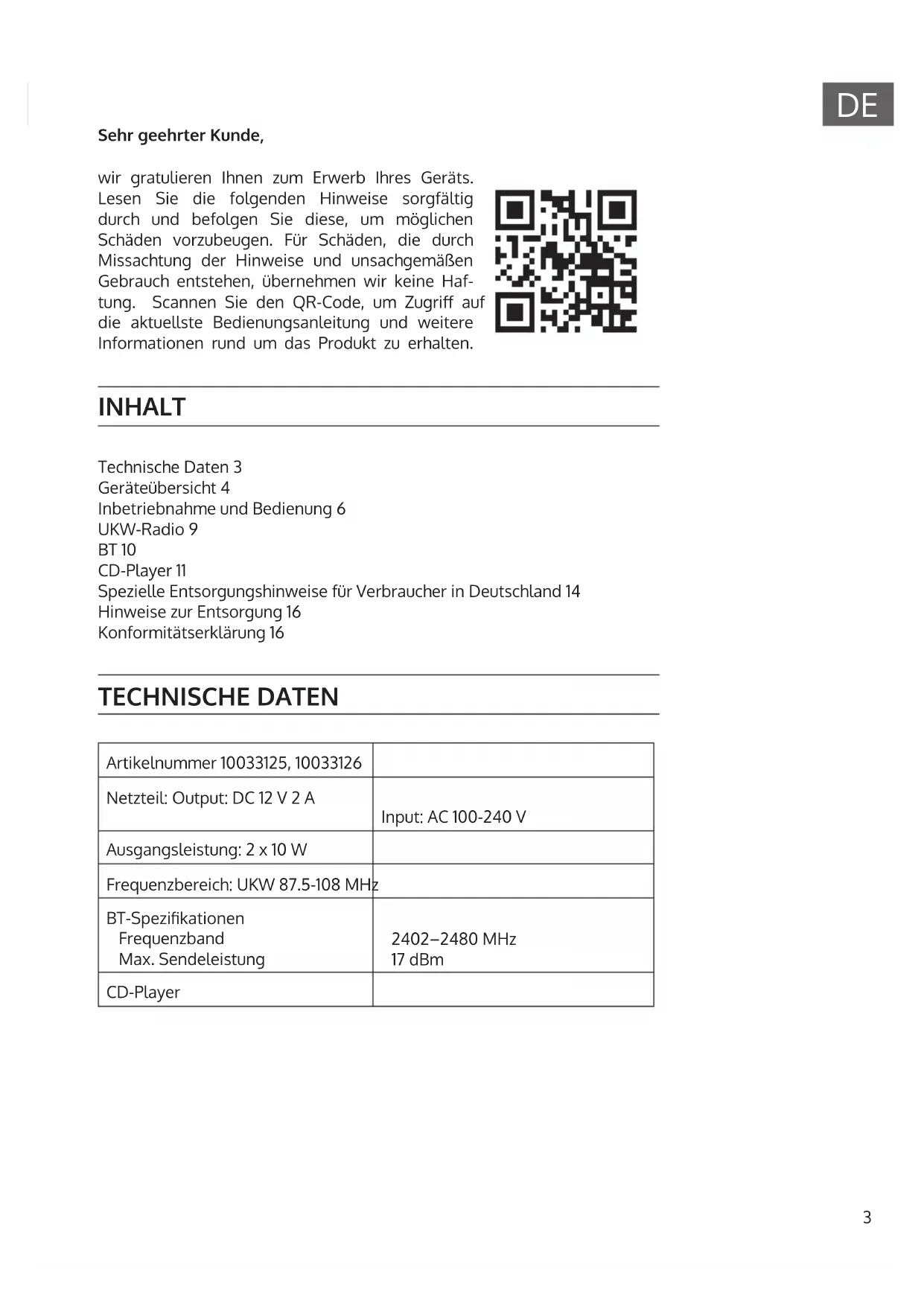 Technische Daten 3 Geräteübersicht 4 Inbetriebnahme und Bedienung 6 UKW-Radio 9 BT 10 CD-Player 11 Spezielle Entsorgungshinweise für Verbraucher in Deutschland 14 Hinweise zur Entsorgung 16 Konformitätserklärung 16 INHALT Sehr geehrter Kunde, wir gratulieren Ihnen zum Erwerb Ihres Geräts. Lesen Sie die folgenden Hinweise sorgfältig durch und befolgen Sie diese, um möglichen Schäden vorzubeugen. Für Schäden, die durch Missachtung der Hinweise und unsachgemäßen Gebrauch entstehen, übernehmen wir keine Haf- tung. Scannen Sie den QR-Code, um Zugri auf die aktuellste Bedienungsanleitung und weitere Informationen rund um das Produkt zu erhalten. TECHNISCHE DATEN Artikelnummer 10033125, 10033126 Netzteil: Output: DC 12V 2A Input: AC 100-240V Ausgangsleistung: 2 x 10W Frequenzbereich: UKW 87.5-108MHz BT-Spezikationen Frequenzband Max. Sendeleistung 2402–2480MHz 17dBm CD-Player4