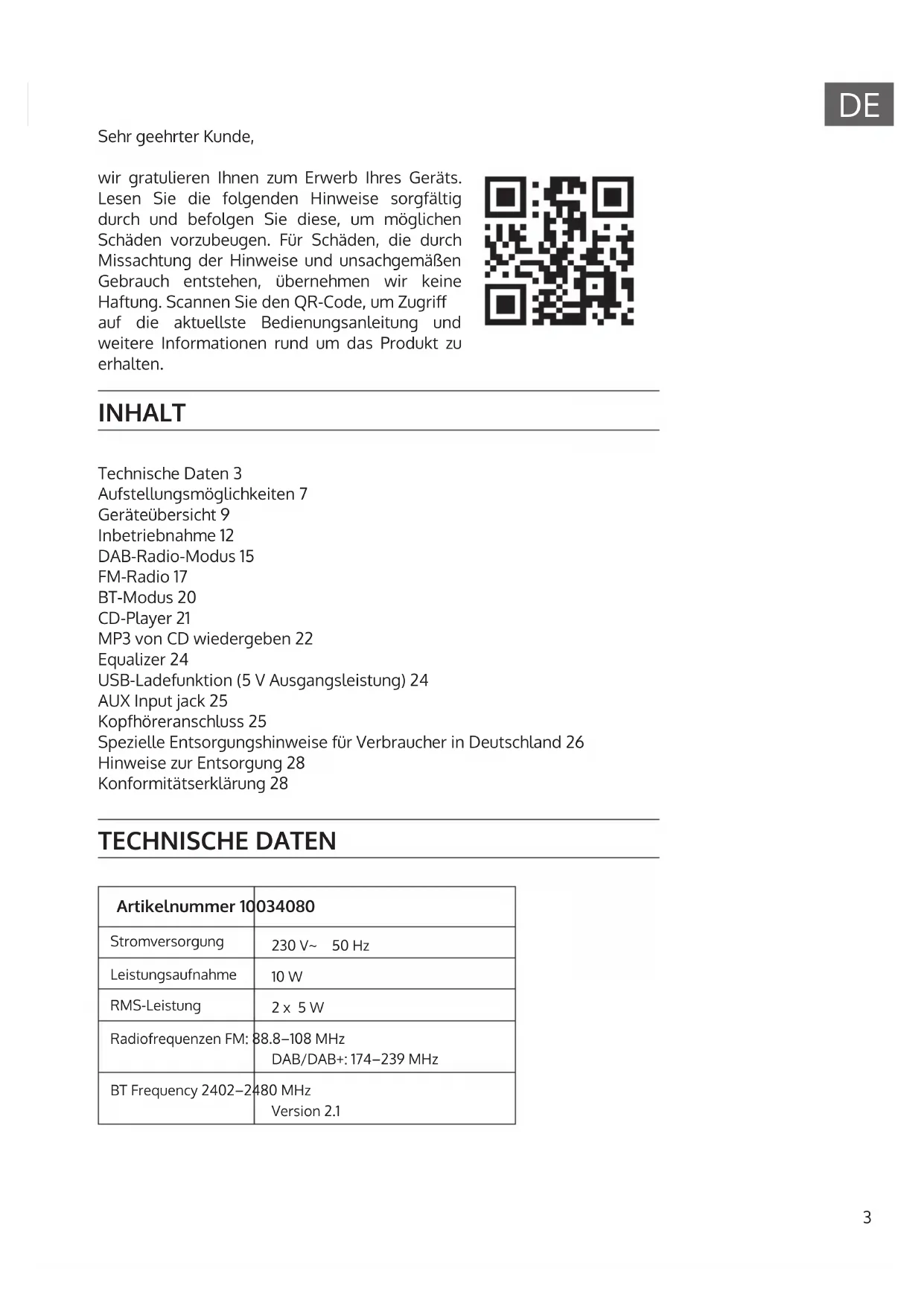 INHALT Technische Daten 3 Aufstellungsmöglichkeiten 7 Geräteübersicht 9 Inbetriebnahme 12 DAB-Radio-Modus 15 FM-Radio 17 BT-Modus 20 CD-Player 21 MP3 von CD wiedergeben 22 Equalizer 24 USB-Ladefunktion (5 V Ausgangsleistung) 24 AUX Input jack 25 Kopfhöreranschluss 25 Spezielle Entsorgungshinweise für Verbraucher in Deutschland 26 Hinweise zur Entsorgung 28 Konformitätserklärung 28 TECHNISCHE DATEN Artikelnummer 10034080 Stromversorgung 230 V~ 50 Hz Leistungsaufnahme 10 W RMS-Leistung 2 x 5 W Radiofrequenzen FM: 88.8–108 MHz DAB/DAB+: 174–239 MHz BT Frequency 2402–2480 MHz Version 2.1 Sehr geehrter Kunde, wir gratulieren Ihnen zum Erwerb Ihres Geräts. Lesen Sie die folgenden Hinweise sorgfältig durch und befolgen Sie diese, um möglichen Schäden vorzubeugen. Für Schäden, die durch Missachtung der Hinweise und unsachgemäßen Gebrauch entstehen, übernehmen wir keine Haftung. Scannen Sie den QR-Code, um Zugri auf die aktuellste Bedienungsanleitung und weitere Informationen rund um das Produkt zu erhalten.4