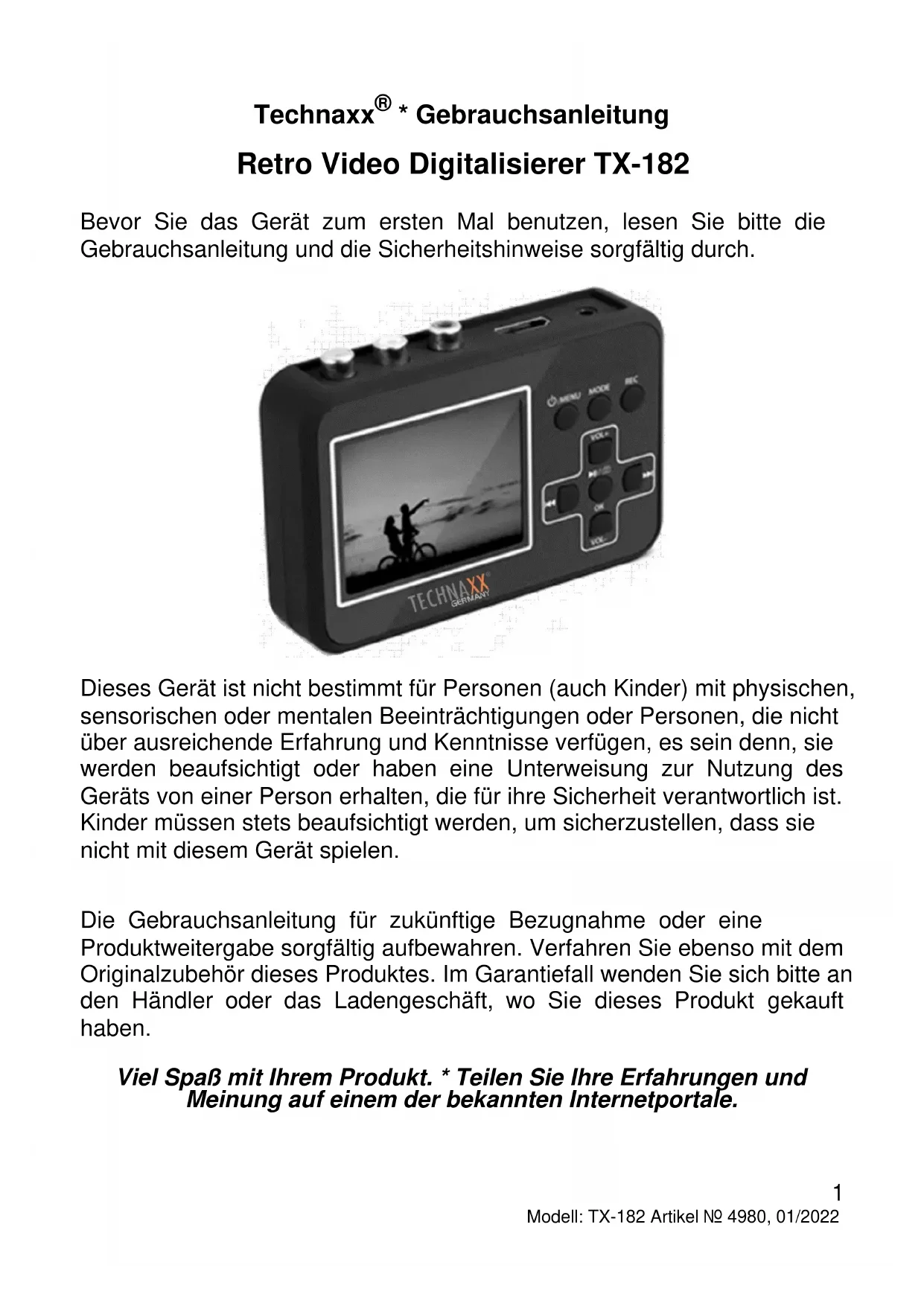 - Dieses Gerät ist nicht bestimmt für Personen (auch Kinder) mit physischen, sensorischen oder mentalen Beeinträchtigungen oder Personen, die nicht über ausreichende Erfahrung und Kenntnisse verfügen, es sein denn, sie werden beaufsichtigt oder haben eine Unterweisung zur Nutzung des Geräts von einer Person erhalten, die für ihre Sicherheit verantwortlich ist. Kinder müssen stets beaufsichtigt werden, um sicherzustellen, dass sie nicht mit diesem Gerät spielen. Die Gebrauchsanleitung für zukünftige Bezugnahme oder eine Produktweitergabe sorgfältig aufbewahren. Verfahren Sie ebenso mit dem Originalzubehör dieses Produktes. Im Garantiefall wenden Sie sich bitte an den Händler oder das Ladengeschäft, wo Sie dieses Produkt gekauft haben. Viel Spaß mit Ihrem Produkt. * Teilen Sie Ihre Erfahrungen und Meinung auf einem der bekannten Internetportale.2 Modell: TX-182 Artikel Nr. 4980, 01/2022 Inhaltsverzeichnis Hinweise p. 2