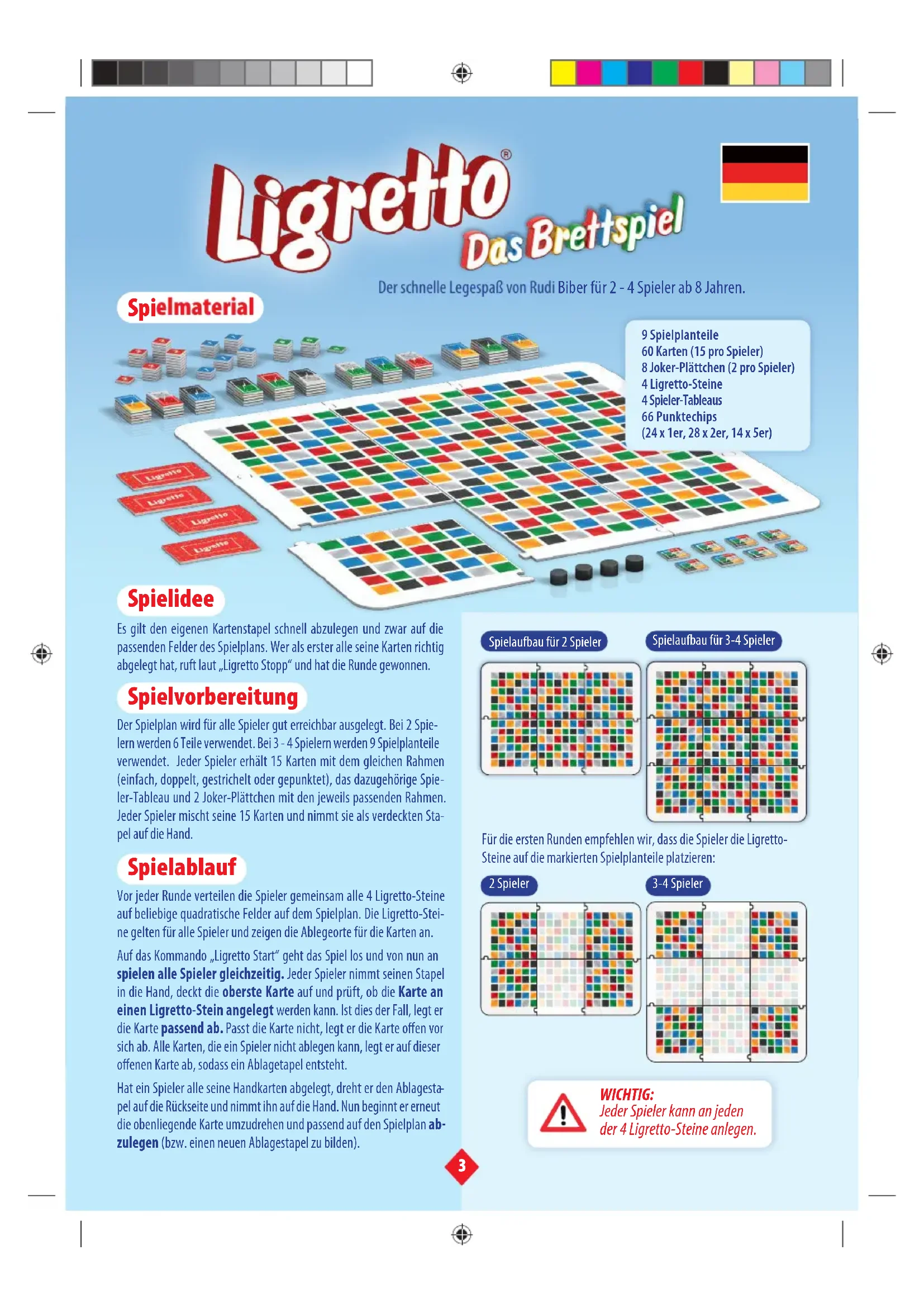 Il gioco da tavolo2 Spieler 1 / joueur 1 / giocatore 1 Spieler 3 / joueur 3 / giocatore 3 Spieler 2 / joueur 2 / giocatore 2 Spieler 4 / joueur 4 / giocatore 4 Spieler-Tableau Plateau de joueur Plancia individuale 2 Joker 2 plaquettes joker 2 tessere jolly Ligretto Karten / cartes / tessere3 Der schnelle Legespaß von Rudi Biber für 2 - 4 Spieler ab 8 Jahren. Spielmaterial Spielidee Es gilt den eigenen Kartenstapel schnell abzulegen und zwar auf die passenden Felder des Spielplans. Wer als erster alle seine Karten richtig abgelegt hat, ruft laut „Ligretto Stopp“ und hat die Runde gewonnen. Spielvorbereitung Der Spielplan wird für alle Spieler gut erreichbar ausgelegt. Bei 2 Spie-lern werden 6 Teile verwendet. Bei 3 - 4 Spielern werden 9 Spielplanteile verwendet. Jeder Spieler erhält 15 Karten mit dem gleichen Rahmen (einfach, doppelt, gestrichelt oder gepunktet), das dazugehörige Spie ler-Tableau und 2 Joker-Plättchen mit den jeweils passenden Rahmen. Jeder Spieler mischt seine 15 Karten und nimmt sie als verdeckten Sta pel auf die Hand. Spielablauf Vor jeder Runde verteilen die Spieler gemeinsam alle 4 Ligretto-Steine auf beliebige quadratische Felder auf dem Spielplan. Die Ligretto-Stei ne gelten für alle Spieler und zeigen die Ablegeorte für die Karten an.Auf das Kommando „Ligretto Start“ geht das Spiel los und von nun an spielen alle Spieler gleichzeitig. Jeder Spieler nimmt seinen Stapel in die Hand, deckt die oberste Karte auf und prüft, ob die Karte an einen Ligretto-Stein angelegt werden kann. Ist dies der Fall, legt er die Karte passend ab. Passt die Karte nicht, legt er die Karte offen vor sich ab. Alle Karten, die ein Spieler nicht ablegen kann, legt er auf dieser offenen Karte ab, sodass ein Ablagetapel entsteht. Hat ein Spieler alle seine Handkarten abgelegt, dreht er den Ablagesta pel auf die Rückseite und nimmt ihn auf die Hand. Nun beginnt er erneut die obenliegende Karte umzudrehen und passend auf den Spielplan ab zulegen (bzw. einen neuen Ablagestapel zu bilden).9 Spielplanteile 60 Karten (15 pro Spieler) 8 Joker-Plättchen (2 pro Spieler) 4 Ligretto-Steine 4 Spieler-Tableaus 66 Punktechips (24 x 1er, 28 x 2er, 14 x 5er)Für die ersten Runden empfehlen wir, dass die Spieler die Ligretto-Steine auf die markierten Spielplanteile platzieren:WICHTIG: Jeder Spieler kann an jeden der 4 Ligretto-Steine anlegen.3-4 Spieler2 SpielerSpielaufbau für 2 SpielerSpielaufbau für 3-4 Spieler4 Karten ablegen Eine Karte passt, wenn sie die zwei gleichen Farben aufweist, wie die freien Felder neben einem beliebigen Ligretto-Stein. Die neu ab
