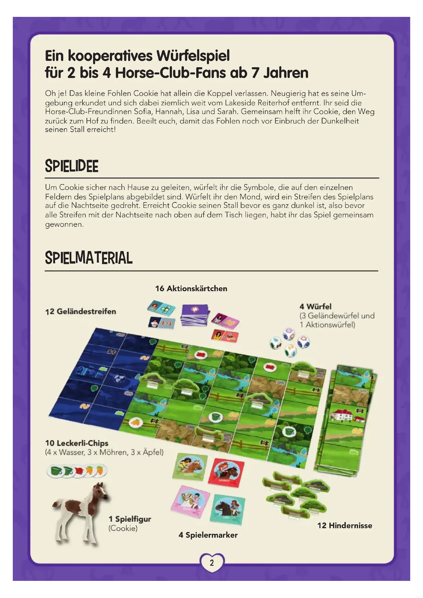 ÜBER STOCK ÜBER STOCK PAR MONTS ET PAR VAUX • PER PRATI E PER BOSCHI PAR MONTS ET PAR VAUX • PER PRATI E PER BOSCHI UND STEIN UND STEIN2 Ein kooperatives Würfelspiel für 2 bis 4 Horse-Club-Fans ab 7 Jahren Oh je! Das kleine Fohlen Cookie hat allein die Koppel verlassen. Neugierig hat es seine Um- gebung erkundet und sich dabei ziemlich weit vom Lakeside Reiterhof entfernt. Ihr seid die Horse-Club-Freundinnen Soa, Hannah, Lisa und Sarah. Gemeinsam helft ihr Cookie, den Weg zurück zum Hof zu nden. Beeilt euch, damit das Fohlen noch vor Einbruch der Dunkelheit seinen Stall erreicht! Spielidee Um Cookie sicher nach Hause zu geleiten, würfelt ihr die Symbole, die auf den einzelnen Feldern des Spielplans abgebildet sind. Würfelt ihr den Mond, wird ein Streifen des Spielplans auf die Nachtseite gedreht. Erreicht Cookie seinen Stall bevor es ganz dunkel ist, also bevor alle Streifen mit der Nachtseite nach oben auf dem Tisch liegen, habt ihr das Spiel gemeinsam gewonnen. Spielmaterial 4 Spielermarker 1 Spielgur (Cookie) 4 Würfel (3 Geländewürfel und 1 Aktionswürfel) 12 Geländestreifen 12 Hindernisse 10 Leckerli-Chips (4 x Wasser, 3 x Möhren, 3 x Äpfel) 16 Aktionskärtchen3 Spielvorbereitung Löst vor dem ersten Spiel alle Teile aus den Stanztafeln und steckt die Hindernisse in die Standfüßchen. Legt die Geländestreifen mit der Tag