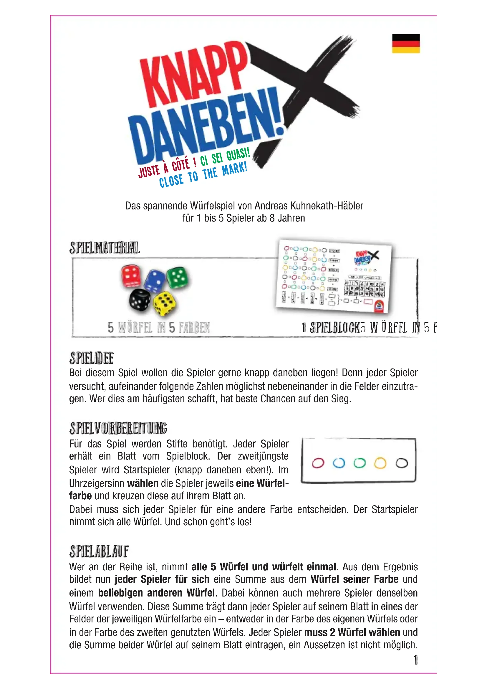 CLOSE TO THE MARK! CI SEI QUASI! JUSTE À CÔTÉ !Das spannende Würfelspiel von Andreas Kuhnekath-Häblerfür 1 bis 5 Spieler ab 8 Jahren Spielmaterial Spielidee Bei diesem Spiel wollen die Spieler gerne knapp daneben liegen! Denn jeder Spieler versucht, aufeinander folgende Zahlen möglichst nebeneinander in die Felder einzutra- gen. Wer dies am häufigsten schafft, hat beste Chancen auf den Sieg. Spielvorbereitung Für das Spiel werden Stifte benötigt. Jeder Spieler erhält ein Blatt vom Spielblock. Der zweitjüngste Spieler wird Startspieler (knapp daneben eben!). Im Uhrzeigersinn wählen die Spieler jeweils eine Würfel- farbe und kreuzen diese auf ihrem Blatt an. Dabei muss sich jeder Spieler für eine andere Farbe entscheiden. Der Startspieler nimmt sich alle Würfel. Und schon geht’s los! Spielablauf Wer an der Reihe ist, nimmt alle 5 Würfel und würfelt einmal. Aus dem Ergebnis bildet nun jeder Spieler für sich eine Summe aus dem Würfel seiner Farbe und einem beliebigen anderen Würfel. Dabei können auch mehrere Spieler denselben Würfel verwenden. Diese Summe trägt dann jeder Spieler auf seinem Blatt in eines der Felder der jeweiligen Würfelfarbe ein – entweder in der Farbe des eigenen Würfels oder in der Farbe des zweiten genutzten Würfels. Jeder Spieler muss 2 Würfel wählen und die Summe beider Würfel auf seinem Blatt eintragen, ein Aussetzen ist nicht möglich. Beispiel: Edgar hat in dieser Reihe zwischen jeweils zwei Zahlen Kreuze setzen können. Dafür erhält er zusammen 3 Punkte. B: Wertung der extremen zahlen: Für jede 3, 4, 10 oder 11 darf der Spieler 1 Feld in der Tabelle ankreuzen (jeweils aufsteigend, beginnend bei der „0“). Für jede 2 oder 12 darf der Spieler sogar 2 Kreuze eintragen. Für die Werte 5, 6, 7, 8 und 9 gibt es keine Kreuze. Das nächste freie Feld entspricht dann der Gesamtpunktzahl für extreme Zahlen. Beispiel: Edgar hat im Laufe des Spiels eine 4, eine 10 und eine 12 auf seinem Blatt eingetragen. Dafür darf er insgesamt 4 Kreuze machen. Jeweils 1 Kreuz für die 4 und die 10 sowie 2 Kreuze für die 12. Das nächste freie Feld ist die 8, und demnach erhält Edgar 8 Punkte für seine extremen Zahlenwerte. In sehr seltenen Fällen, wenn ein Spieler alle 24 Felder bei den extremen Zahlen angekreuzt hat, bekommt er 48 Punkte. Für jedes weitere Kreuz gibt es jeweils 2 Punkte mehr. Tipp: Um die Wertung zu beschleunigen, können die Kreuze zwischen den Feldern und in der Tabelle für die extremen Zahlen auch schon während des Spiels jeweils beim Eintragen der Zahlen gemacht werden. Wer die meisten Punkte hat, gewinnt. Bei Gleichstand gewinnt der Spieler, der häufiger knapp daneben gelegen hat. Das ist der Spieler, der mehr Punkte bei der Wertung der Kreuze zwischen den Feldern erreicht hat. Sollte es dann immer noch einen Gleichstand geben, gibt es mehrere Gewinner. Solo-Spiel „Knapp daneben!“ lässt sich auch hervorragend alleine spielen. Die Spielvorbereitung und der Spielaufblauf funktionieren genauso wie beim normalen Spiel. Der Solo-Spieler führt aber alle Würfelwürfe selber durch. Nachdem alle 25 Felder ausgefüllt sind, endet das Spiel. Wie knapp ein Spieler daneben liegt, kann er anhand der folgenden Tabelle erkennen. Deutlich daneben. Gleich noch mal spielen!Prima! Das wird doch langsam...Fortgeschrittener Spieler Spezialist Veteran „Knapp daneben!“-Profi Meister aller Klassen Wo der Spieler die Zahl einträgt, ist ihm überlassen. Die Eintragungen müssen nicht angrenzend sein.Sind in zwei benachbarten Feldern Zahlen eingetragen, die aufeinanderfolgen (also in ihrem Wert jeweils um 1 höher oder niedriger sind), wird das Feld dazwischen angekreuzt.Beispiel: Edgar ist der gelbe Spieler und hat das folgende Ergebnis gewürfelt:Alle Spieler nutzen nun dieses Ergebnis gleichzei-tig. Da er der gelbe Spieler ist, muss er auf jeden Fall die gelbe 4 nehmen. Edgar entscheidet sich, aus dem Würfelergebnis zusätzlich die grüne 1 zu verwenden. Er bildet aus den beiden Zahlen die Summe 5 und muss diese entweder in ein gelbes oder in ein grünes Feld eintragen. Edgar entscheidet sich für das gelbe Feld. Da die 5 um den Wert 1 niedriger als die daneben eingetrage-ne 6 ist, darf Edgar das kleine Feld zwischen den beiden Zahlen ankreuzen. Das kleine Feld über der 5 darf er ebenfalls ankreuzen, da die 4 um den Wert 1 niedriger ist. Die beiden anderen kleinen Felder (links und unten) darf er aber nicht ankreuzen, da die benachbarten Werte nicht um 1 höher oder niedriger sind. Edgar hätte die 5 auch in das grüne Feld eintragen dürfen, aber dafür hätte er nur ein Kreuz erhalten. Sobald alle Spieler eine Zahl (Summe beider Würfel) auf ihrem Blatt eingetragen haben, würfelt der nächste Spieler mit allen 5 Würfeln und das Spiel geht weiter. Alle Spieler tragen gleichzeitig ihre Werte ein. Jeder Spieler muss eine Zahl eintragen. Aussetzen ist nicht möglich. Es muss immer eine Summe aus 2 Würfeln gebildet werden. Nur 1 Würfel eintragen ist nicht möglich. Spielende und wertung Das Spiel endet, wenn alle 25 Felder ausgefüllt sind. Dann erfolgt die Wertung. Bei der Wertung gibt es Punkte für zwei Bereiche: Für Kreuze zwischen den Feldern für knapp daneben liegende Zahlen (A) und für extreme Zahlen (B). A: Wertung der Kreuze zwischen den Feldern: In den Spalten und Reihen gibt es jeweils für die Anzahl der Kreuze zwischen den Feldern folgende Punkte. Dabei müssen die Kreuze nicht aufeinander folgen. Es können Kreuzfelder dazwischen frei bleiben. Knapp