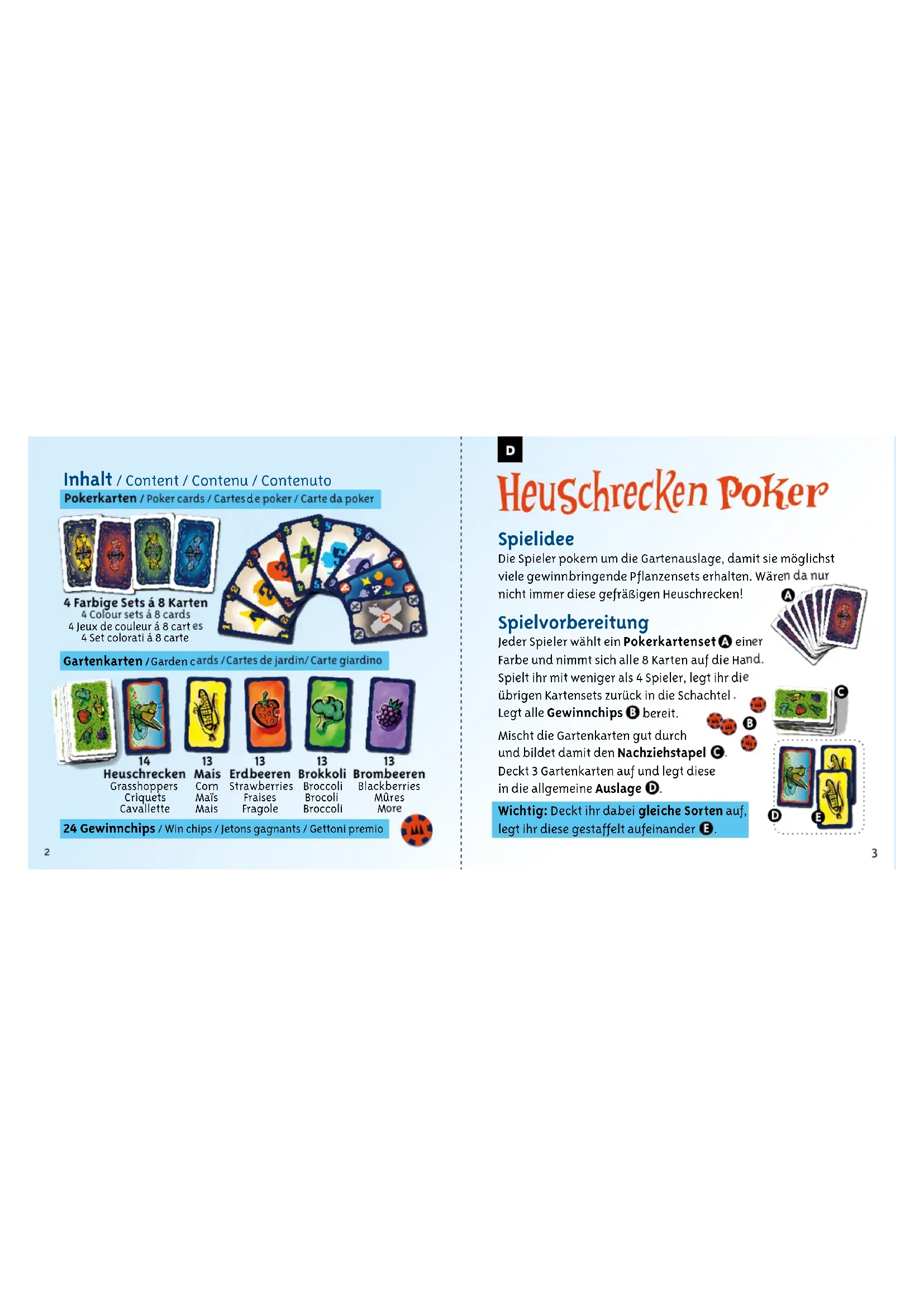 Spielende und Gewinner Das Spiel endet, wenn alle Gartenkarten aufgebraucht sind. Es wird noch eine letzte Zwischenwertung durchgeführt und der Sieger mit den meisten Gewinnchips ermittelt. Bei einem Gleichstand gewinnt, wer weniger Heuschrecken in seinem Privatgarten hat. Bei erneutem Gleichstand, gibt es mehrere Sieger. Spiel zu zweit Im Spiel zu zweit wird nach den gleichen Regeln gespielt, mit folgender Änder- ung: Gibt es in einem Durchgang nur einen Gewinner, muss der Spieler die ganze Auslage nehmen. Einsteiger Variante Für ein einfacheres Spiel, kann die Sonder- funktion der X-Karte weggelassen werden. Die Karte ist dann einfach eine Pass-Karte und übernimmt nicht die Funktion des Asses. Idea of the game The players bid for garden cards, to achieve gainful sets of plants. But, always beware of the greedy grasshoppers! Preparation for the game Each player chooses a poker card set of one colour and picks up all 8 cards in his hand. If you are playing with less than 4 players, put the other sets back into the box. Place the win chips at the ready. Shuffle the garden cards well and place them face down on the table in a draw pile . Reveal 3 garden cards from the draw pile and place these in the common display