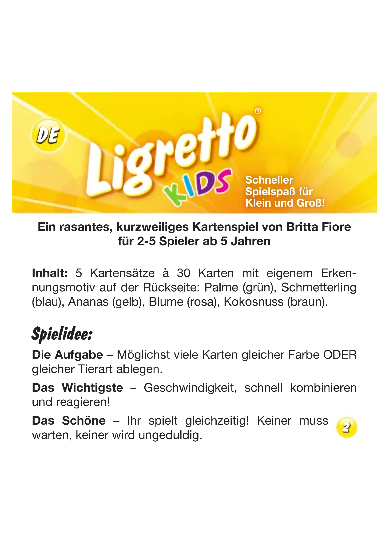 Ablagestapel auf die Hand, dreht ihn um und weiter geht es mit dem Ablegen! Spielende: Gewonnen hat der Spieler, der als Erster alle seine Karten abgelegt hat. In diesem Fall ruft er laut „Ligretto Stop!“. Das Spiel ist auch beendet, wenn alle Spieler keine Karten mehr ablegen können. In diesem Fall hat der Spieler gewonnen, der am Ende die wenigsten Karten auf der Hand und in seinem Ablagestapel hat. Das Spiel kann in mehreren Durchgängen gespielt werden. Dabei notiert jeder Spieler alle seine jeweils übrig gebliebenen Karten. Der Spieler der nach 3 Durchgängen die wenigsten Karten notiert hat, ist der Sieger. 56Einsteigervariante für jüngere Spieler ab 4 Jahren: In dieser Variante entfällt die allgemeine Auslage in der Mitte. Stattdessen hat jedes Kind einen eigenen Spielstapel direkt vor sich. Die passenden Karten werden ausschließlich auf diesen Stapel abgespielt. Die unpassenden Karten können auf dem Tisch offen abgelegt und von dort aus auch zugeordnet werden. Vorteile der Einsteigervariante: - Die Kinder können in ihrem eigenen Tempo spielen - Sie müssen sich nur an 1 Spielstapel orientieren, um abzulegen 7FR Un jeu de cartes rapide et divertissant de Britta Fiore pour 2 à 5 joueurs à partir de 5 ans Contenu : 5 jeux de 30 cartes, identifiés chacun par un motif au dos : palme (vert), papillon (bleu), ananas (jaune), fleur (rose), noix de coco (marron). Idée du jeu : Le but – se défaire du plus grand nombre possible de cartes de la même couleur OU du même type d'animal. L'essentiel – est de faire vite, d'associer et réagir rapidement ! L'avantage – vous jouez tous en même temps ! Personne n'attend, donc pas d'impatience.