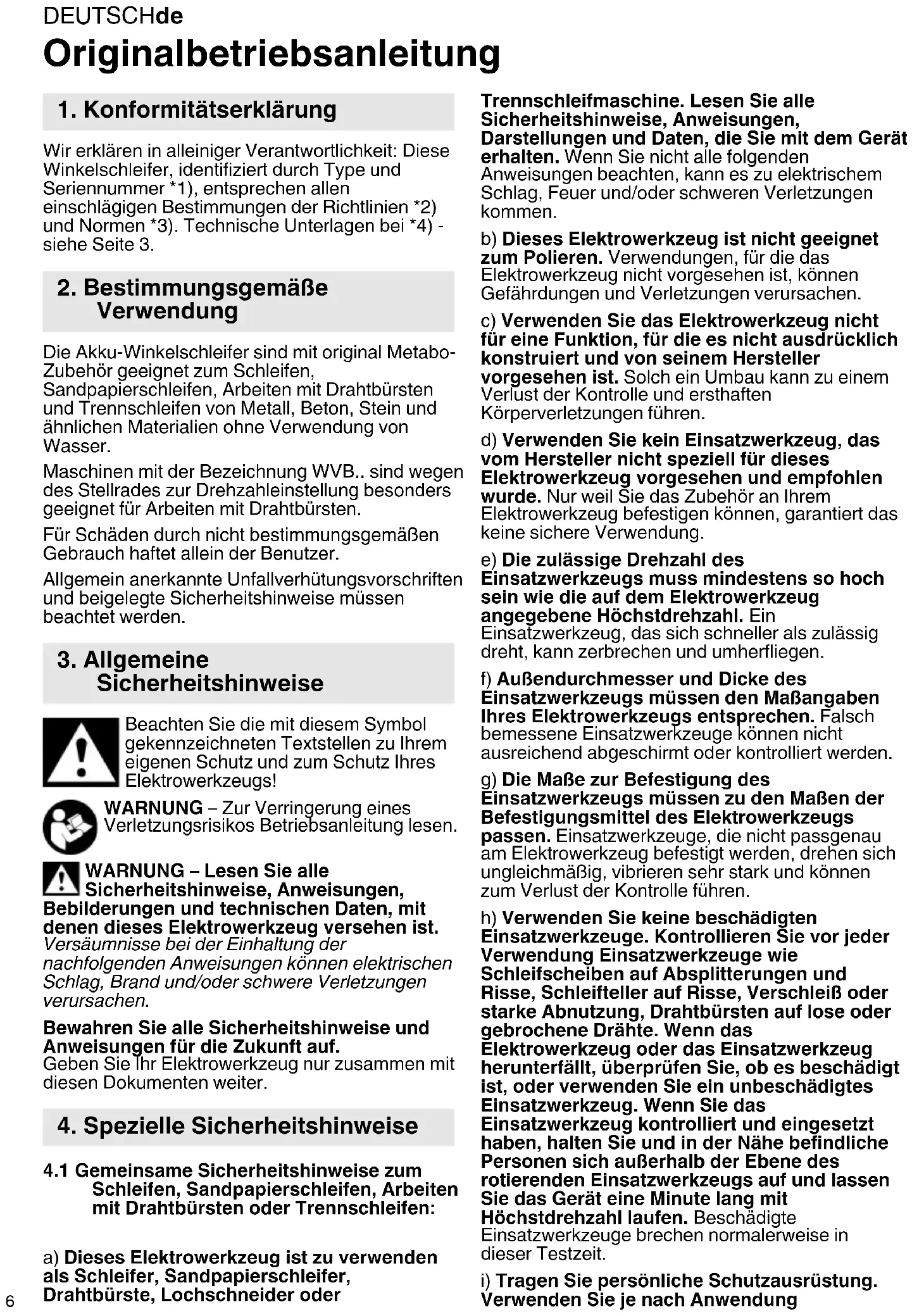 Originalbetriebsanleitung Wir erklären in alleiniger Verantwortlichkeit: Diese Winkelschleifer, identifiziert durch Type und Seriennummer *1), entsprechen allen einschlägigen Bestimmungen der Richtlinien *2) und Normen *3). Technische Unterlagen bei *4) - siehe Seite 3. Die Akku-Winkelschleifer sind mit original Metabo- Zubehör geeignet zum Schleifen, Sandpapierschleifen, Arbeiten mit Drahtbürsten und Trennschleifen von Metall, Beton, Stein und ähnlichen Materialien ohne Verwendung von Wasser. Maschinen mit der Bezeichnung WVB.. sind wegen des Stellrades zur Drehzahleinstellung besonders geeignet für Arbeiten mit Drahtbürsten. Für Schäden durch nicht bestimmungsgemäßen Gebrauch haftet allein der Benutzer. Allgemein anerkannte Unfallverhütungsvorschriften und beigelegte Sicherheitshinweise müssen beachtet werden. Beachten Sie die mit diesem Symbol gekennzeichneten Textstellen zu Ihrem eigenen Schutz und zum Schutz Ihres Elektrowerkzeugs! WARNUNG – Zur Verringerung eines Verletzungsrisikos Betriebsanleitung lesen. WARNUNG – Lesen Sie alle Sicherheitshinweise, Anweisungen, Bebilderungen und technischen Daten, mit denen dieses Elektrowerkzeug versehen ist. Versäumnisse bei der Einhaltung der nachfolgenden Anweisungen können elektrischen Schlag, Brand und/oder schwere Verletzungen verursachen. Bewahren Sie alle Sicherheitshinweise und Anweisungen für die Zukunft auf. Geben Sie Ihr Elektrowerkzeug nur zusammen mit diesen Dokumenten weiter.